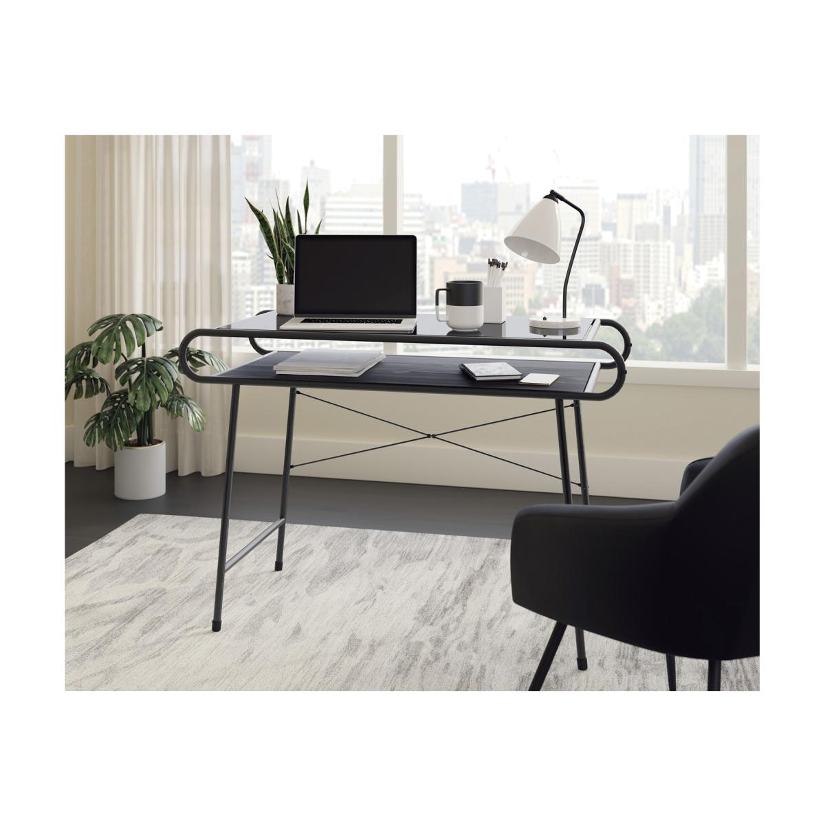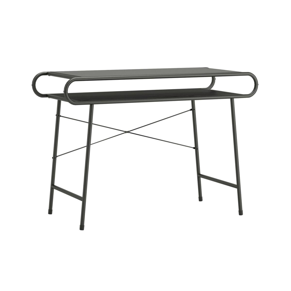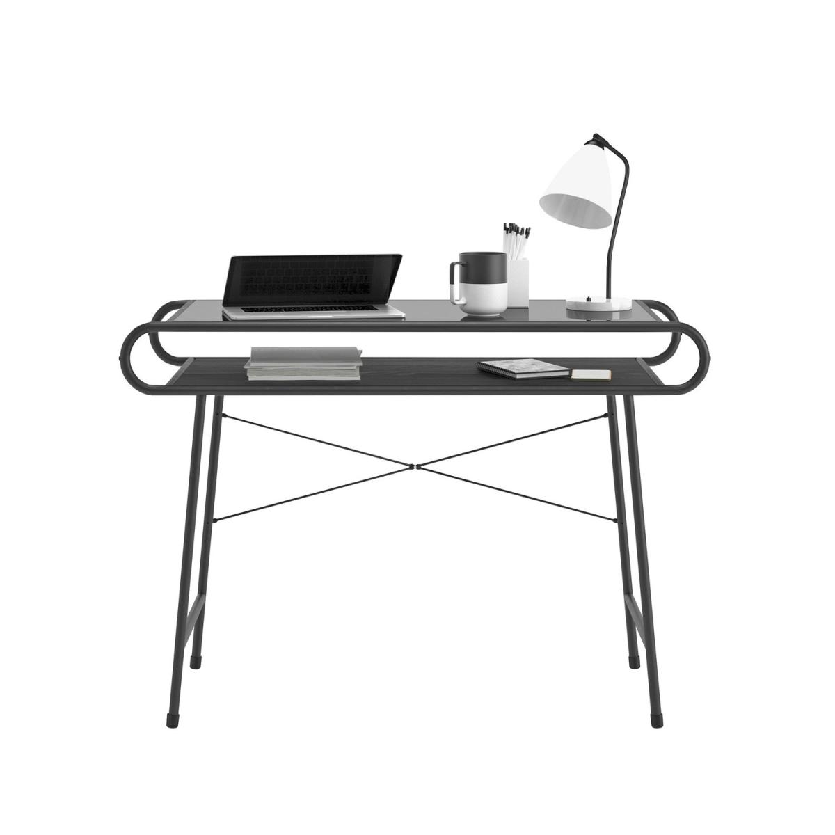 The Metro Desk is a modern style desk featuring a powder coated metal frame complemented by a safety-tempered black glass top. This desk offers a spacious work area and an open storage area underneath the desk top.