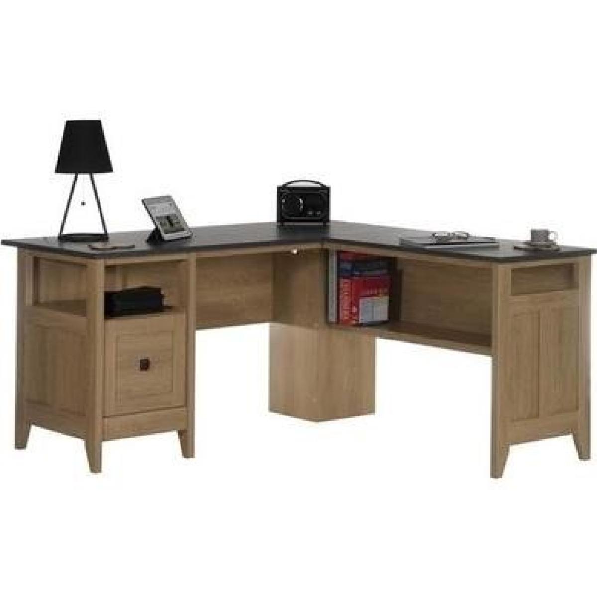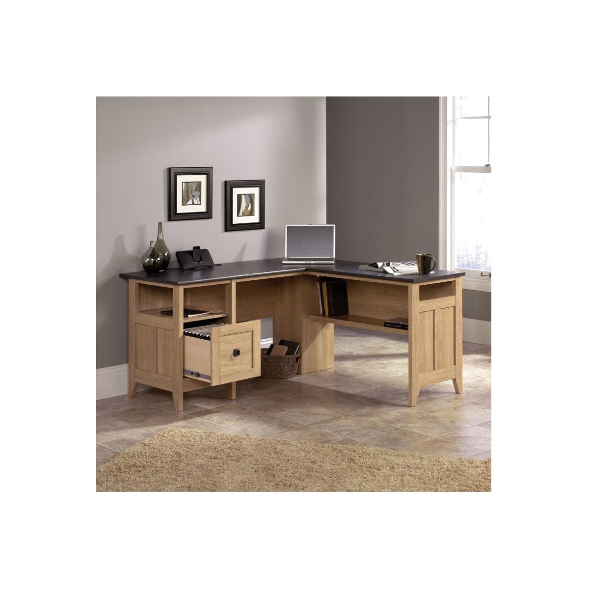 Dimensions. W150 x D59.9 x H74.3 cm Length of return. 149 cm About me The Home Study Office desk is a verstaile executive corner desk in a Dover Oak finish with a slate coloured desktop and return. With a spacious tabletop lower bookshelf surrounding the desk and cable ports for you to discretely hide and manage your cables you will have plenty of room for studying working or simply browsing the web. Key features. Home office L-shaped executive desk Dover Oak finish with slate coloured desktop and return. Large desktop area and return provides a generous working area. Fully extending filing drawer. Cable ports for discreet wire management. Lower book shelf for additional storage Assembly required..