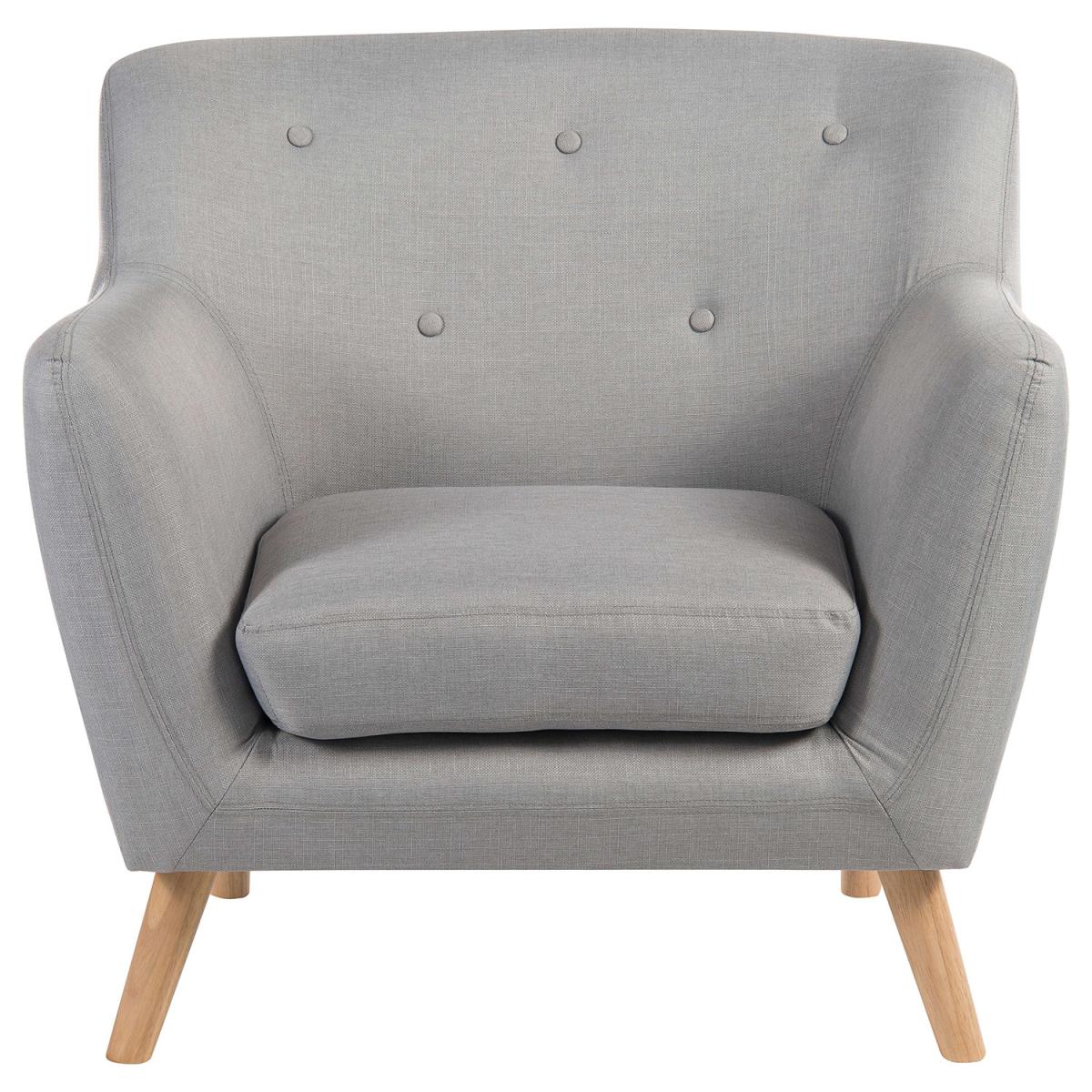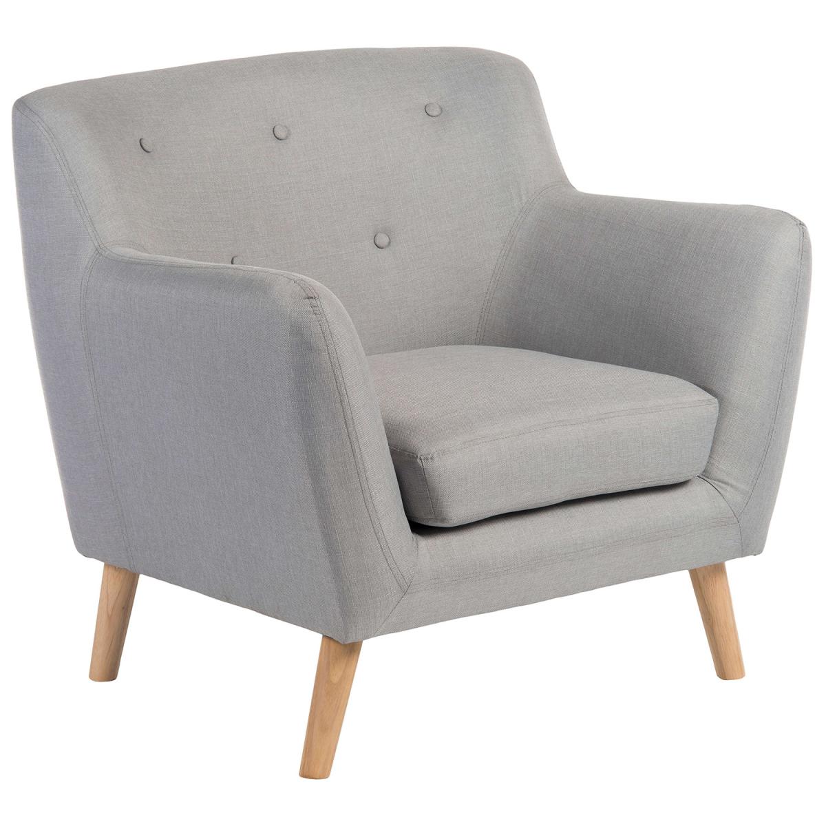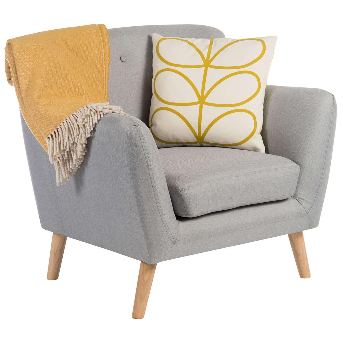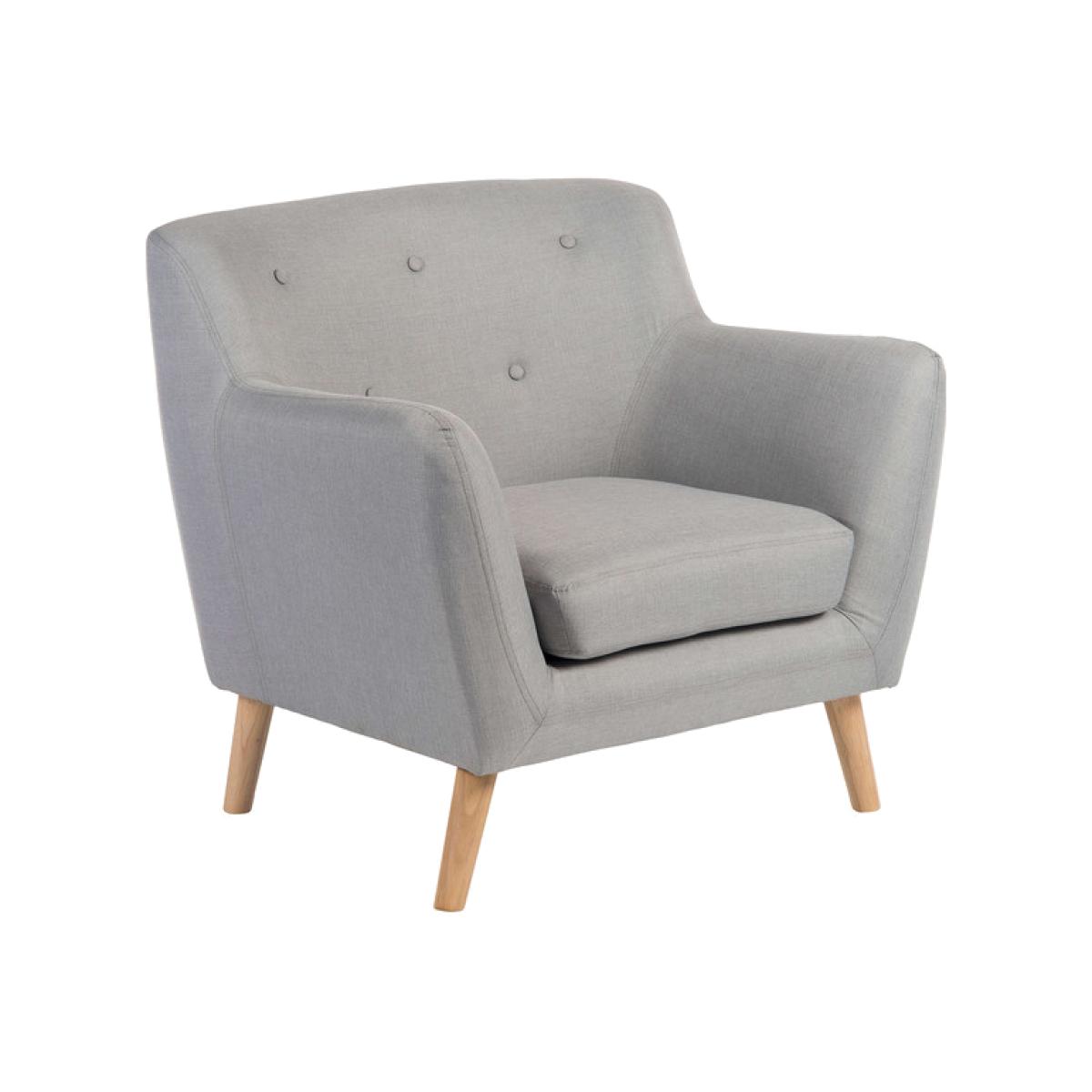 I love this grey armchair for its clean lines, subtle button detailing and natural oak legs. It sits equally well in Scandinavian, mid-century or minimalist schemes, and its neutral tone makes layering with bolder cushions or throws easy. For a cosy reading nook, pair it with a slim side table, a textured wool throw and a simple floor lamp; or group it with a pastel pouffe and a leafy plant to add softness. Its compact proportions mean it can work in smaller living rooms or bedroom corners without overpowering the space.