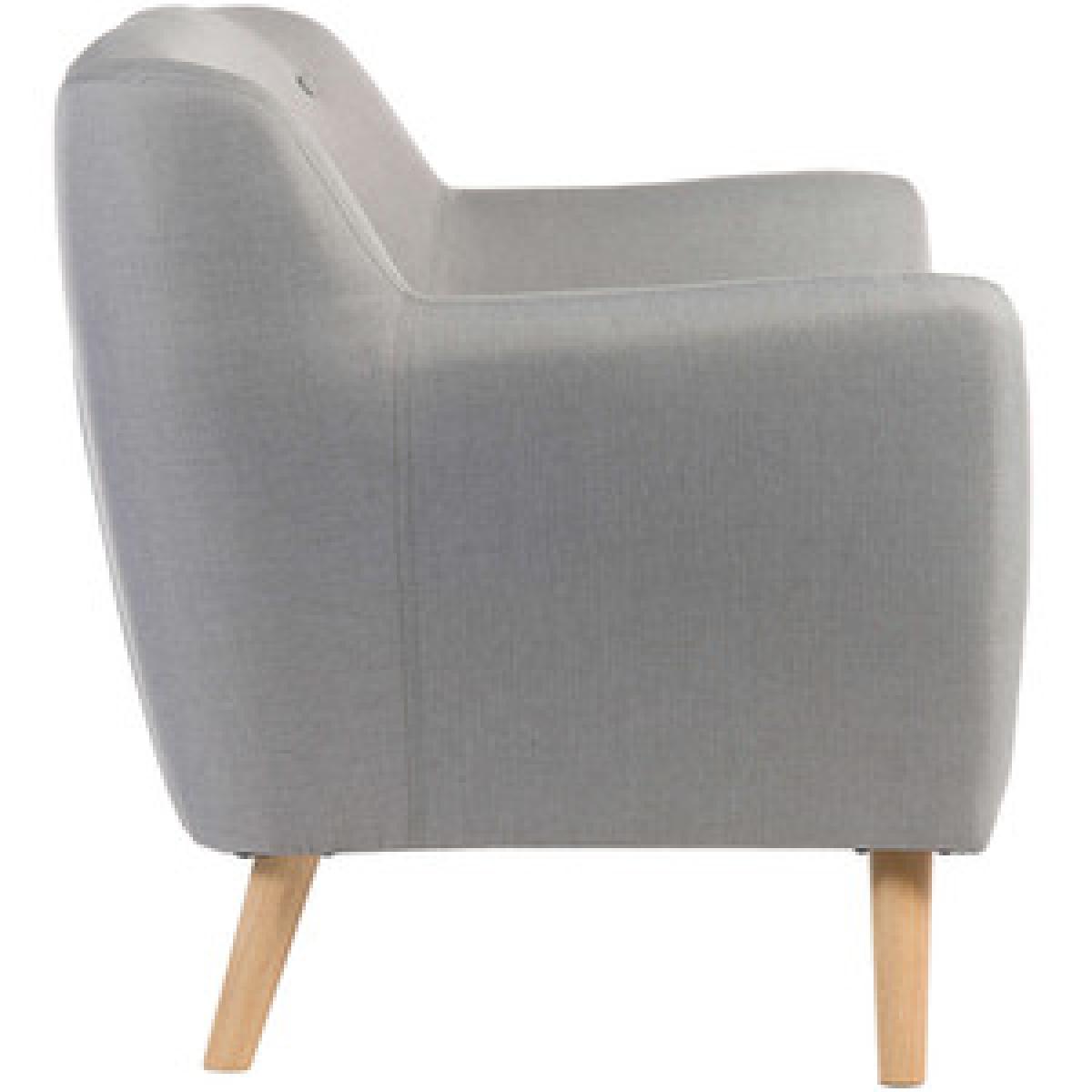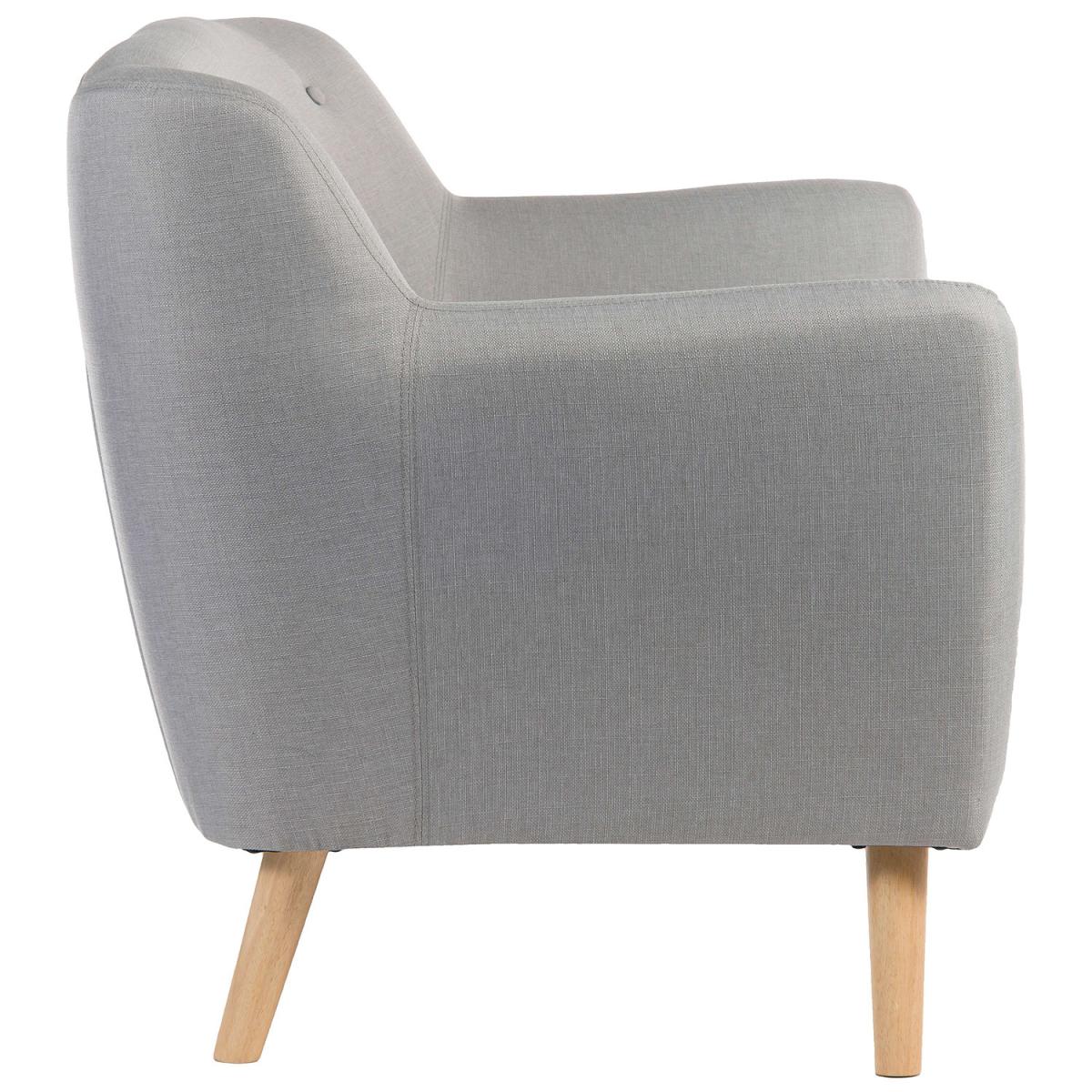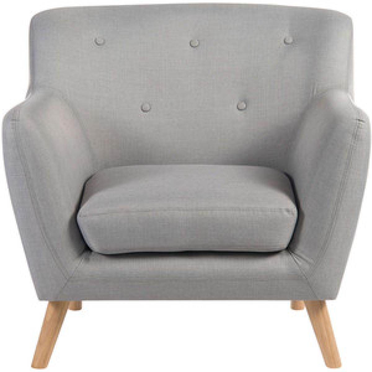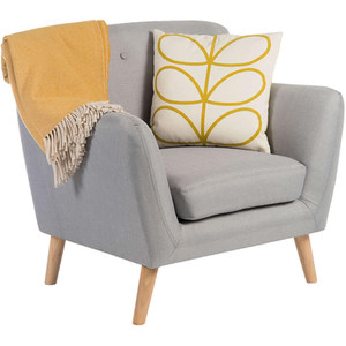 I love this grey armchair for its clean lines, subtle button detailing and natural oak legs. It sits equally well in Scandinavian, mid-century or minimalist schemes, and its neutral tone makes layering with bolder cushions or throws easy. For a cosy reading nook, pair it with a slim side table, a textured wool throw and a simple floor lamp; or group it with a pastel pouffe and a leafy plant to add softness. Its compact proportions mean it can work in smaller living rooms or bedroom corners without overpowering the space.