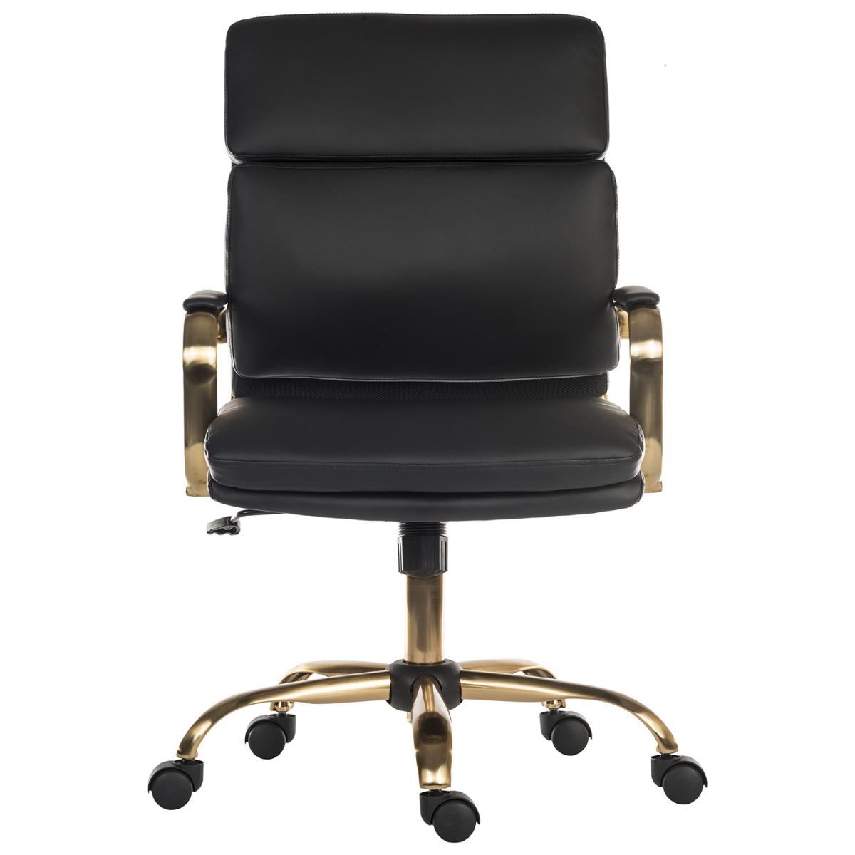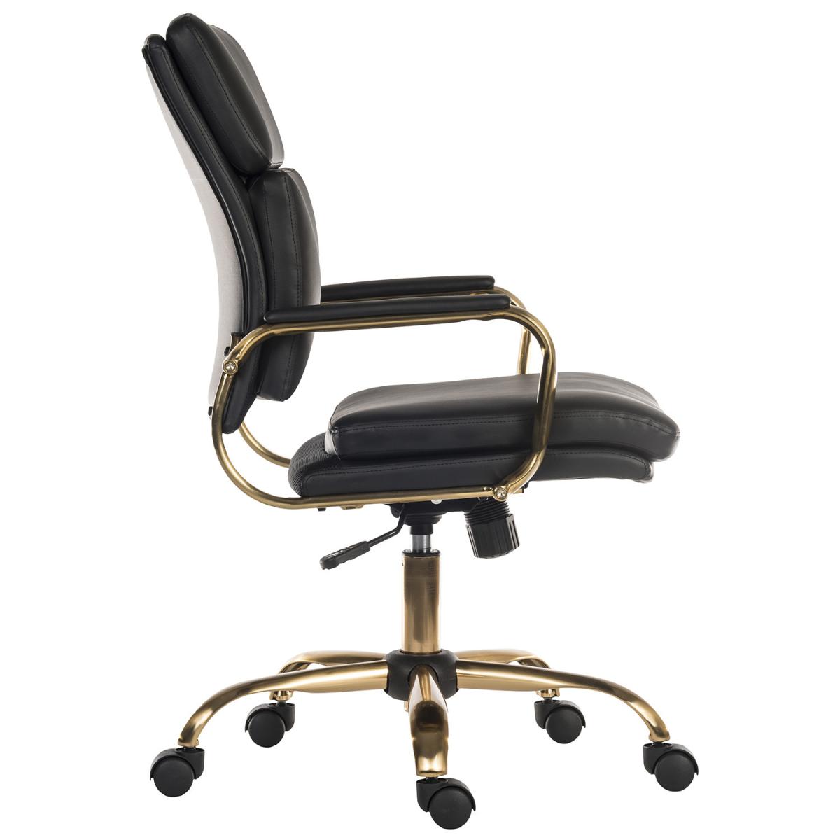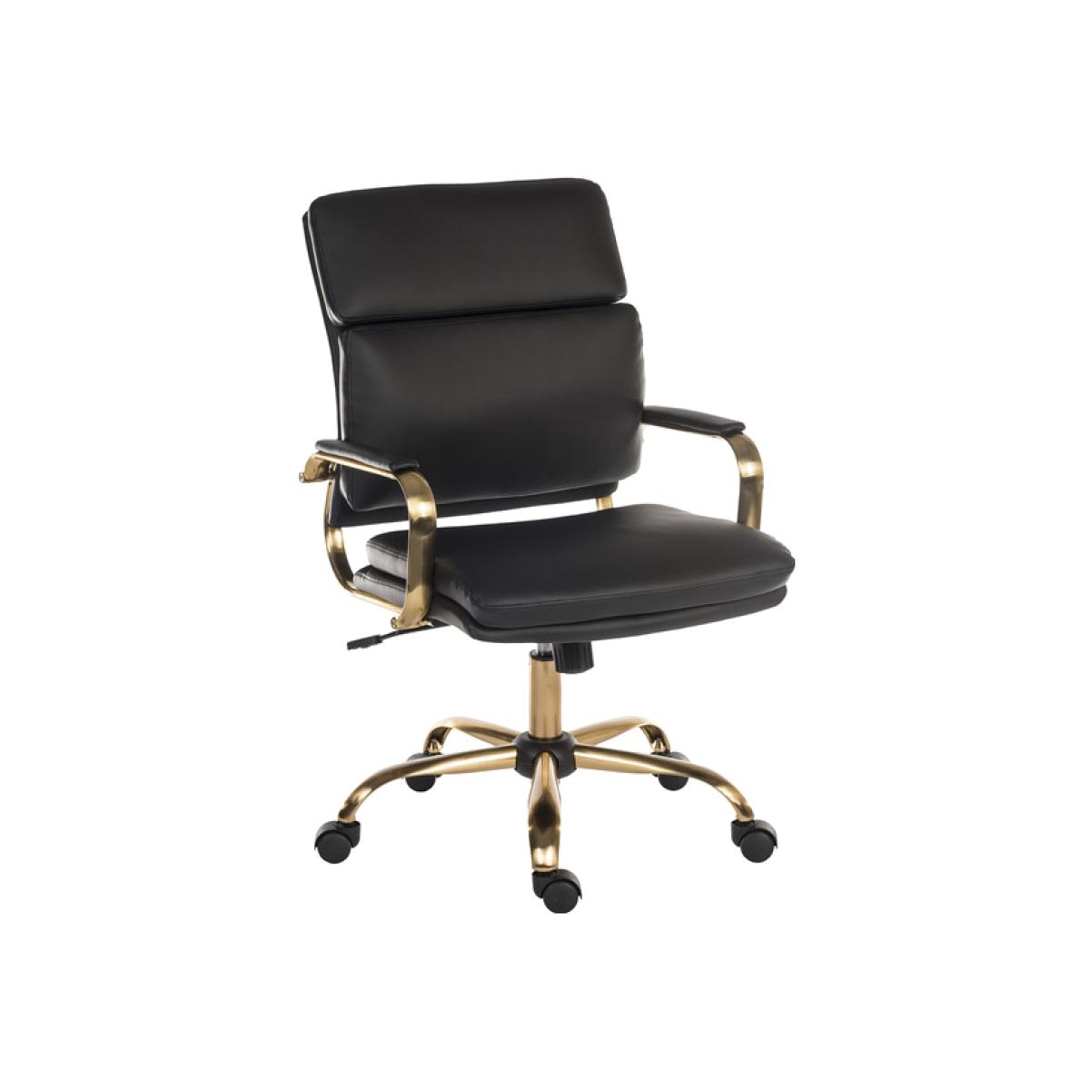 The Teknik Vintage executive supple leather look fabric chair in Black is a great and versatile choice for the home office. With its classic appearance and smart brass coloured metal arm frame with matching five star base, it will happily pair with most styles of desk or office interior without compromising on quality. It has a medium height comfortably padded backrest, matching arm covers, a recline function with tilt tension and a seat height adjusting lever. The contrasting brass colour arms and five star base complete the unique vintage look. This chair is rated up to 110kg and is suitable for up to 8 hours a day usage.