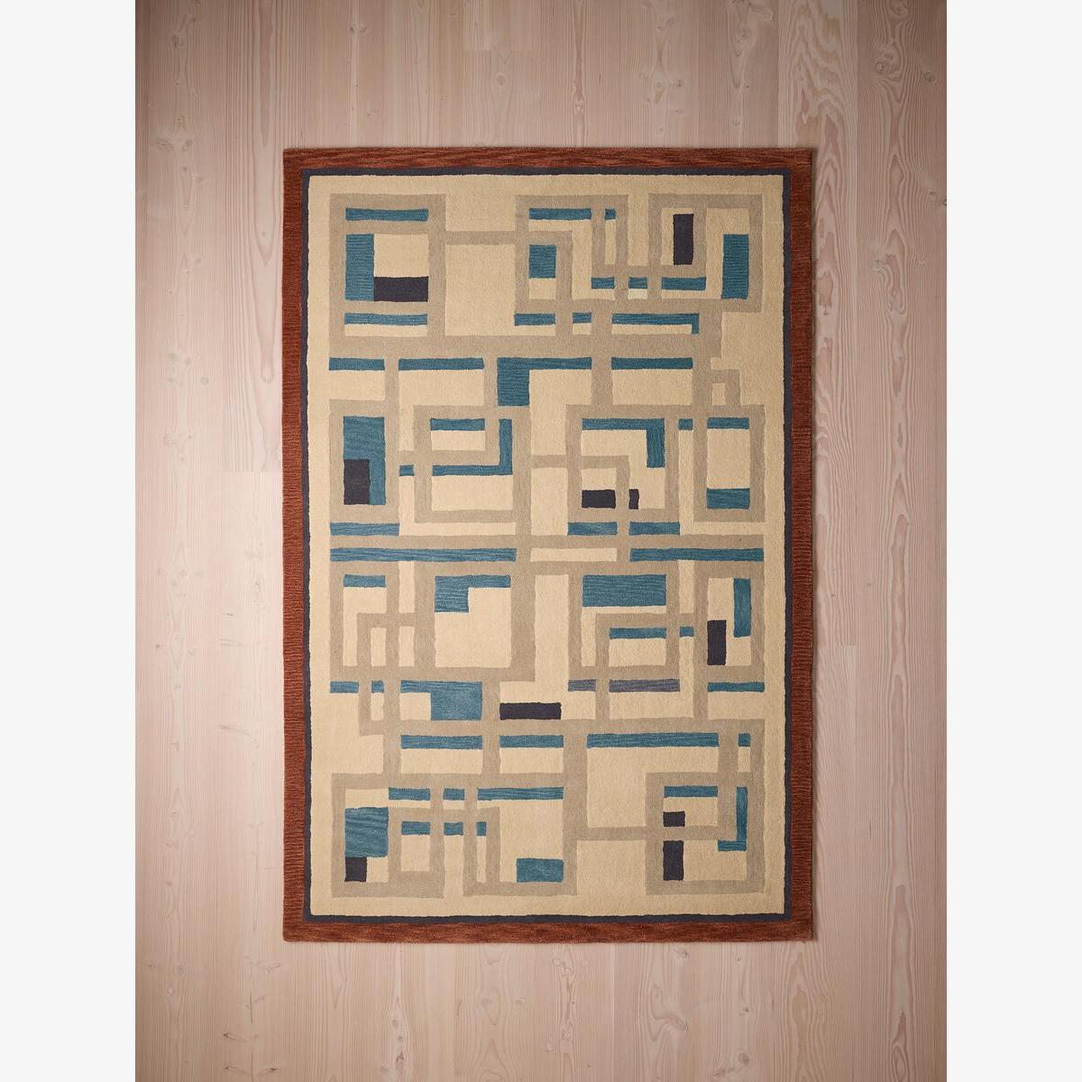 The contemporary, geometric design of our Telde rug takes inspiration from similar Art Deco-style rugs found in Soho Warehouse in Downtown LA. Working with a group of skilled artisans in India, this particular style has been hand-tufted using a soft New Zealand wool for comfort and longevity in the home. A mix of dappled areas alongside solid colours in blue grey and beige brings textural depth to this design, contrasted with a bold rust-red border. The deeper pile of this rug would work well in a living room or underneath your bed to add instant colour and pattern. Hand-tufted rug swatch Pile: 100% New Zealand wool Deep pile Contemporary geometric pattern Contrasting rust-red border Inspired by Art Deco designs in Soho Warehouse