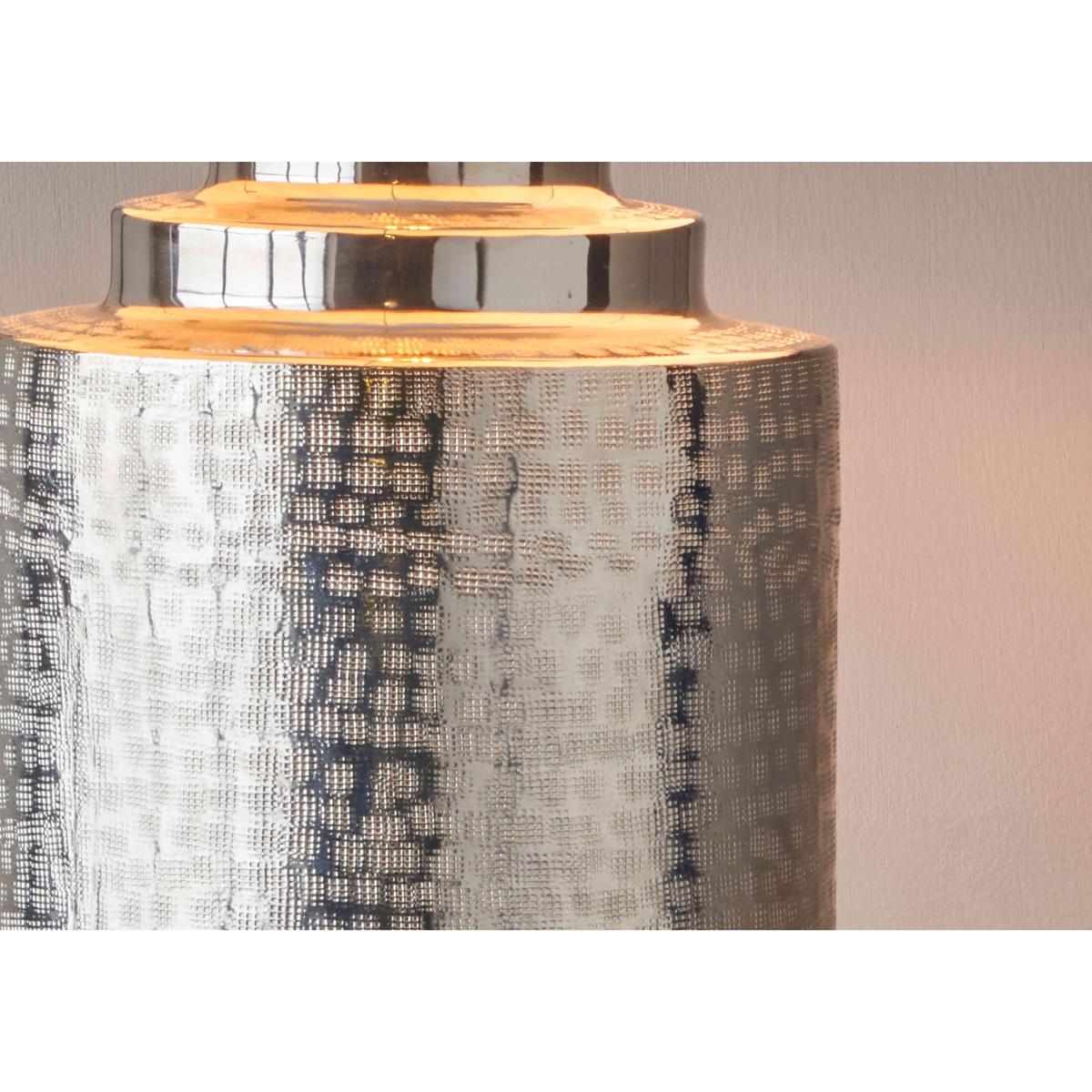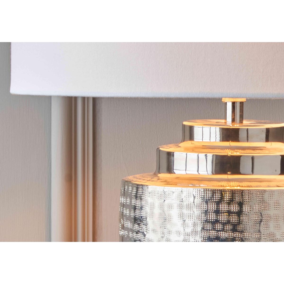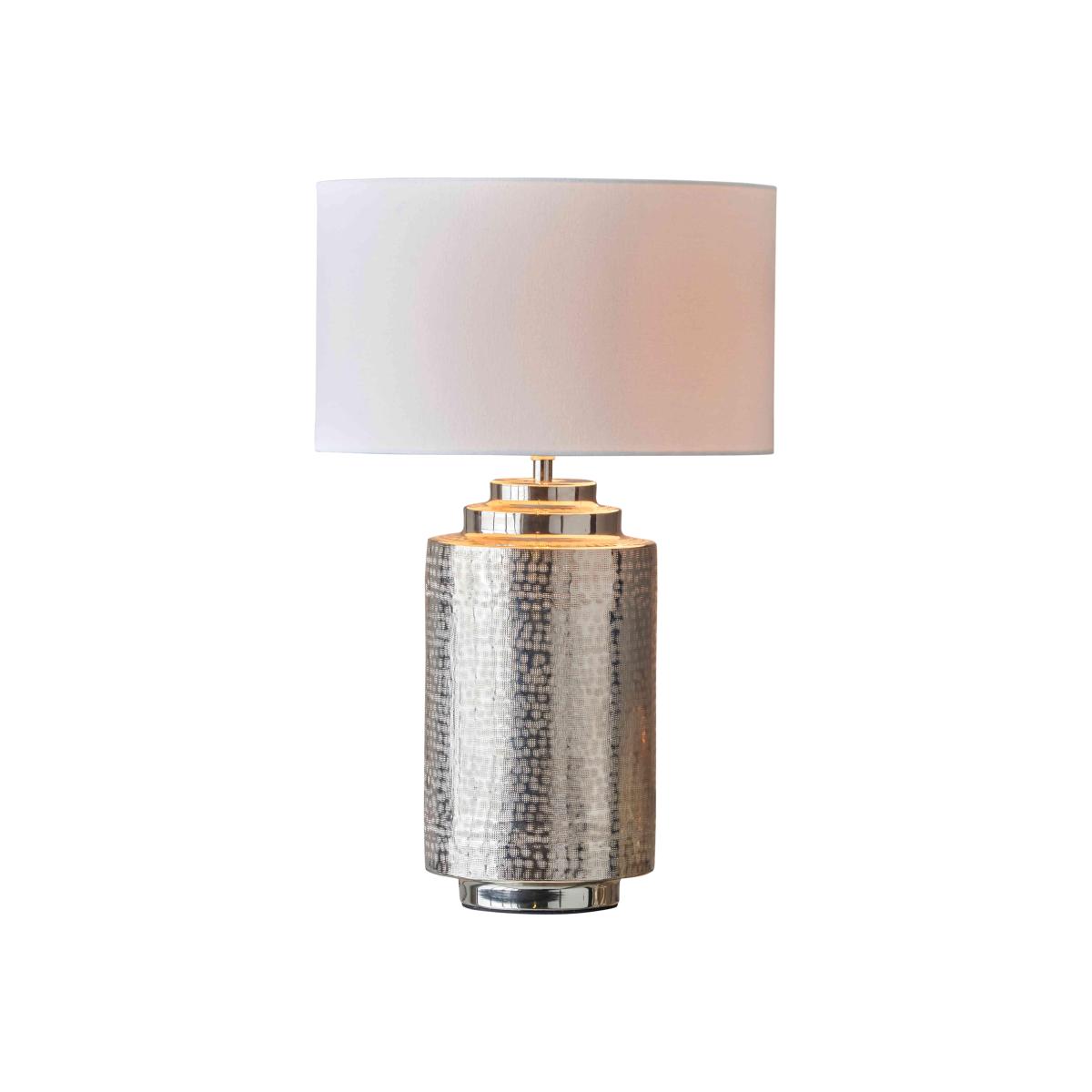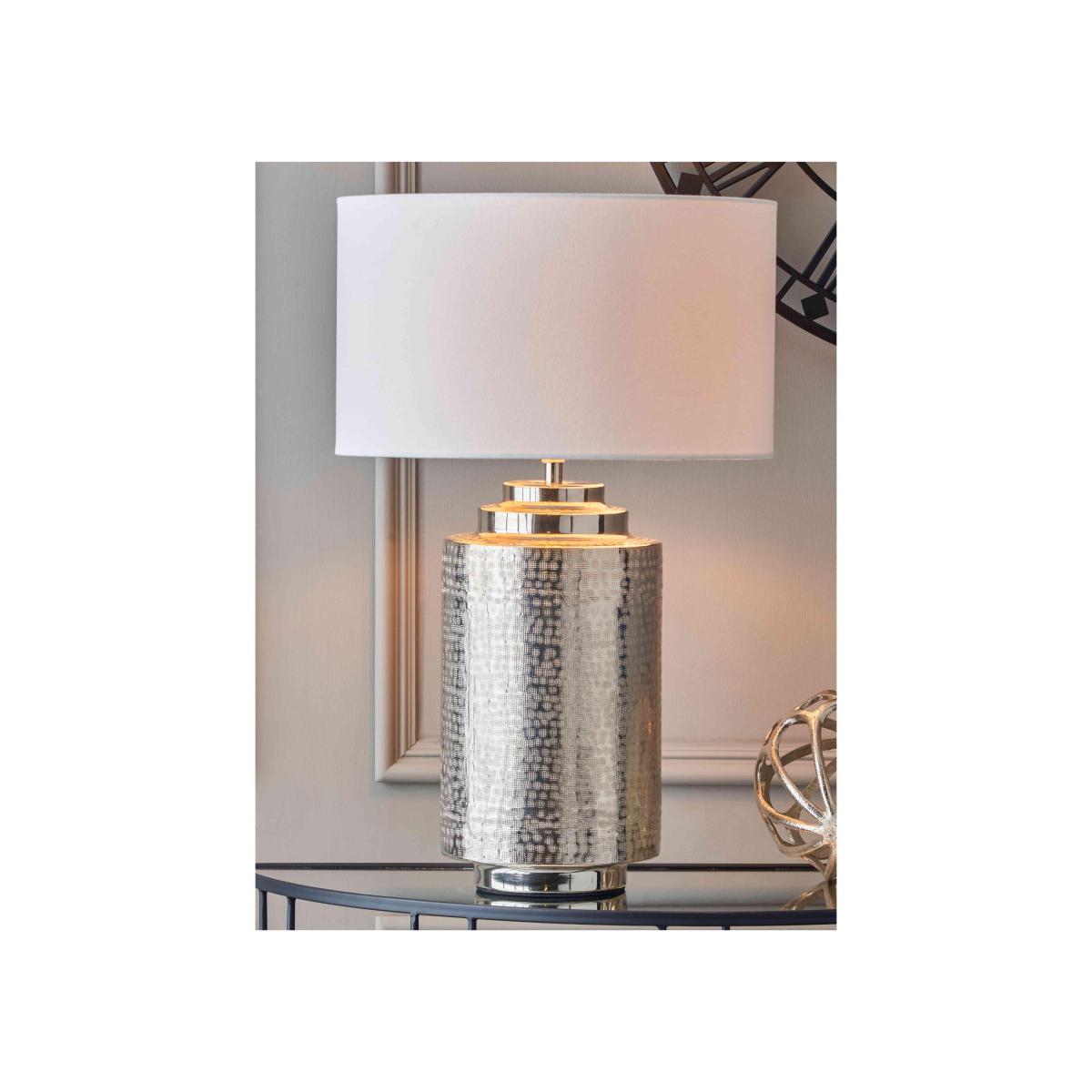 This bold silver-toned table lamp has a hand-hammered finish that gives it a contemporary handcrafted quality. It’s finished with a bright white cotton lampshade. Why you'll love it With its hand-finished metal base, this table lamp feels like a modern antique. Contemporary handcrafted style. Metal base is made in India. It’s hand-hammered for a beautiful textured finish. Comes complete with an elegant white lampshade. A Furniture Village online exclusive. This table lamp is part of the Furniture Village lighting collection. What you need to know Polished nickel lamp base. Cotton lampshade. Supplied with 250 cm cable. Inline switch. Requires 1 x E27 max. 60W bulb (not included). Dust with a soft, clean cloth. Unplug while cleaning. Dimensions including lampshade Height: 72 cm (28 in). Diameter: 45 cm (18 in).