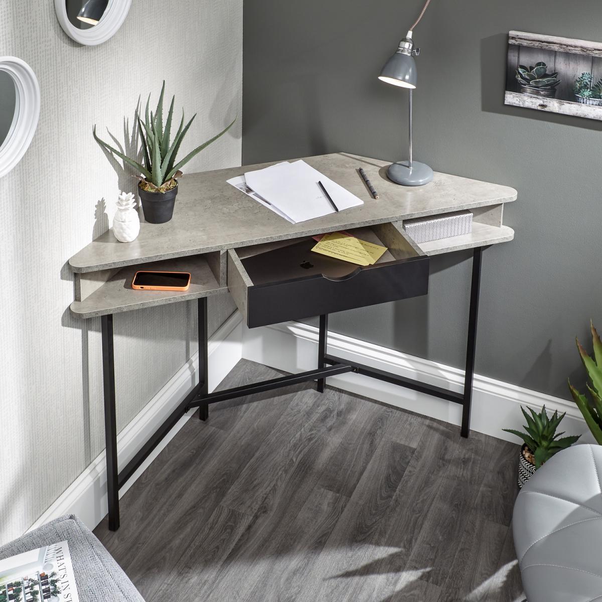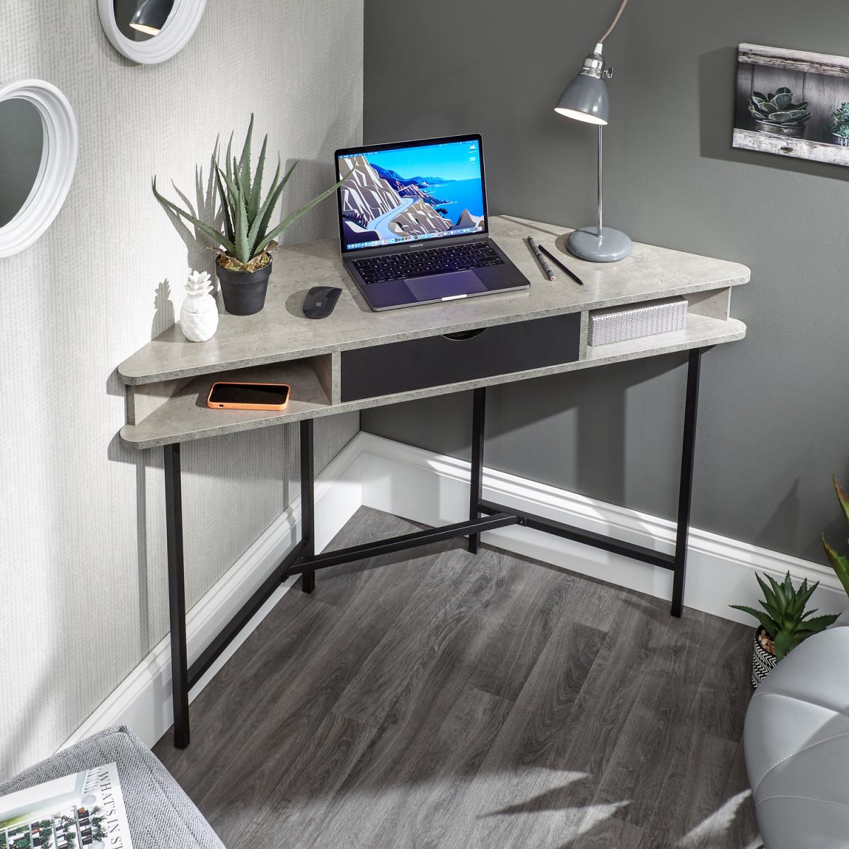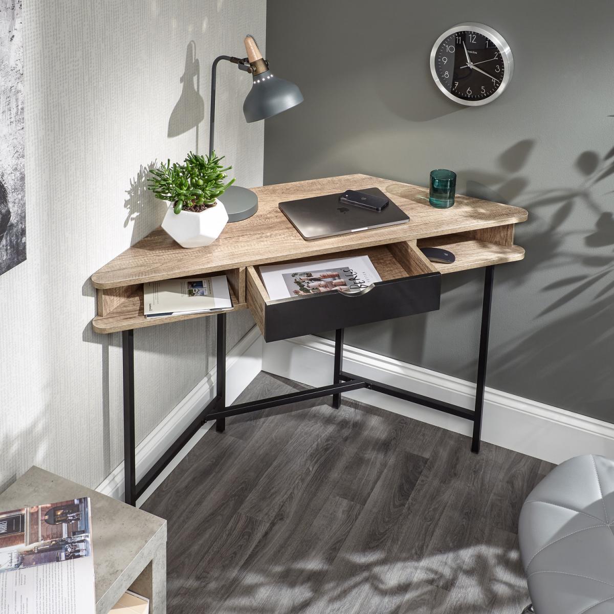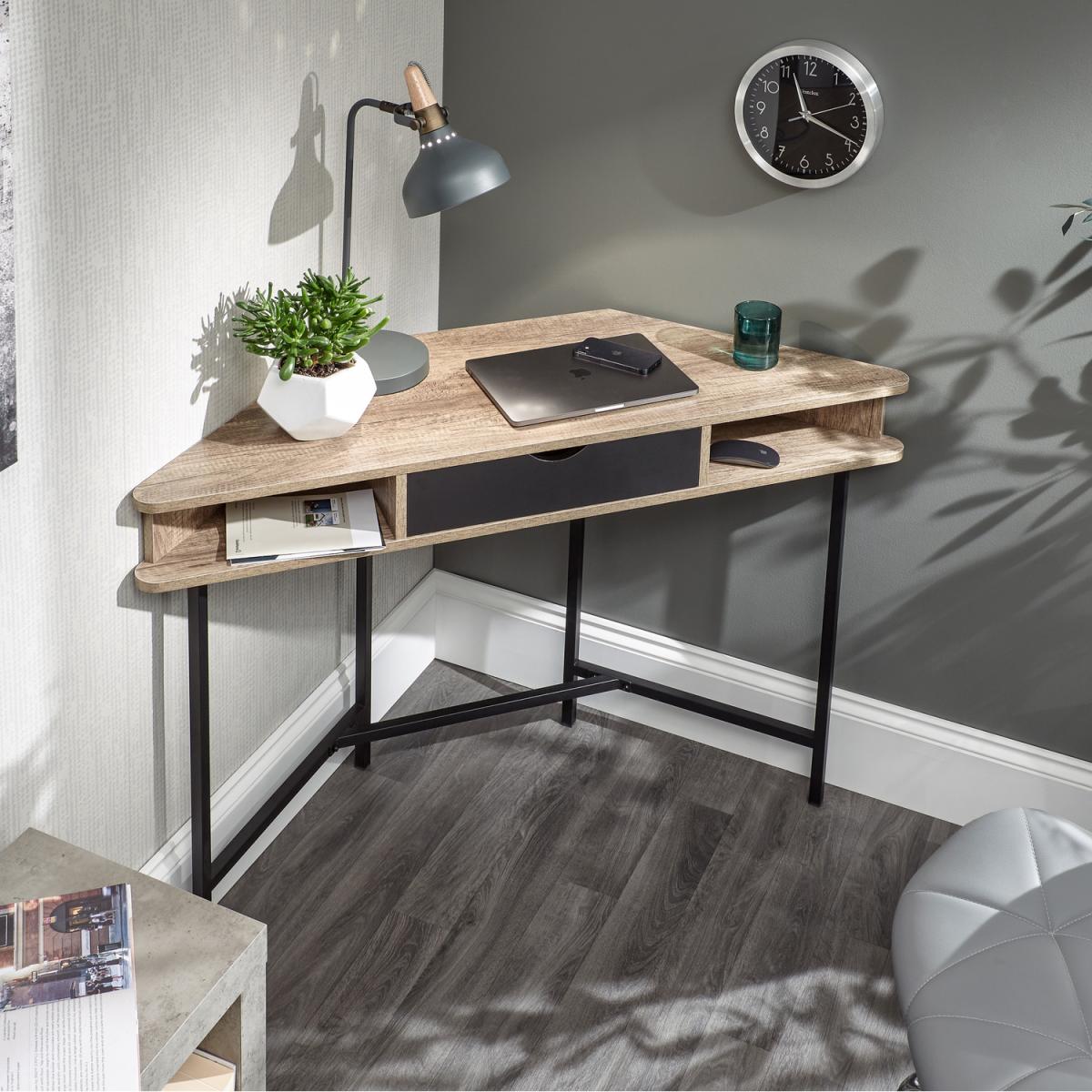 If you need a work-from-home option that does not impact your living space, this fabulous contemporary corner desk unit is a great choice. The compact design makes the most of an underused corner, incorporating a useful workspace, together with a storage section that's spacious enough to store most standard laptops and tablets plus media accessories. Available in a choice of classic light and dark oak-effect finish options with contrast drawers, or in highly durable concrete melamine for a minimalist look and feel that's uncompromisingly tough.