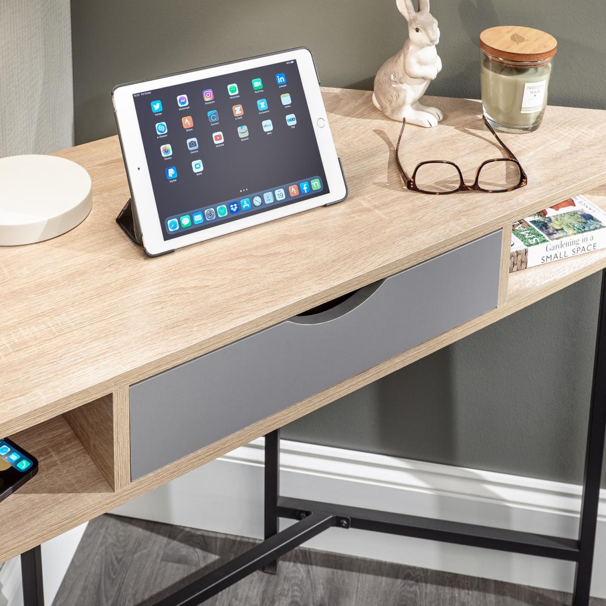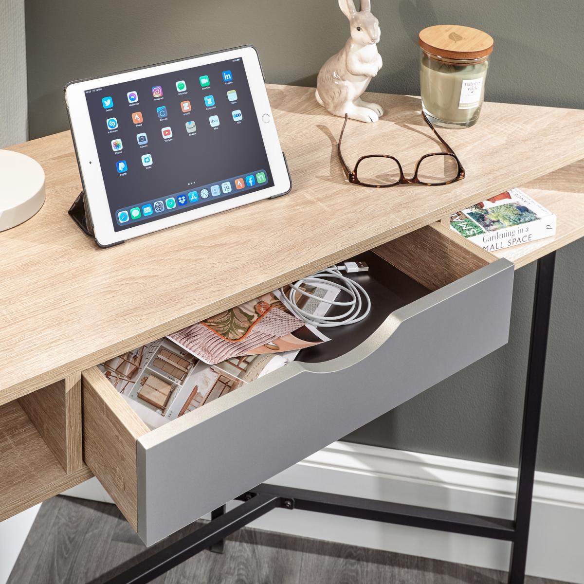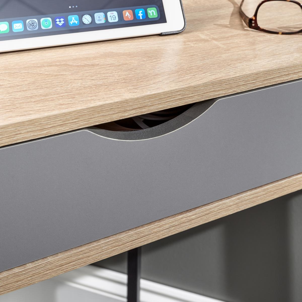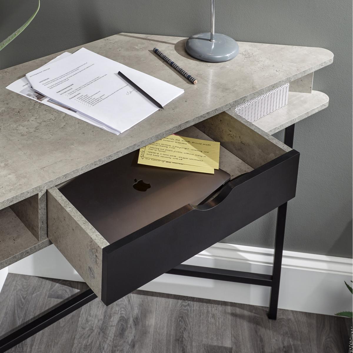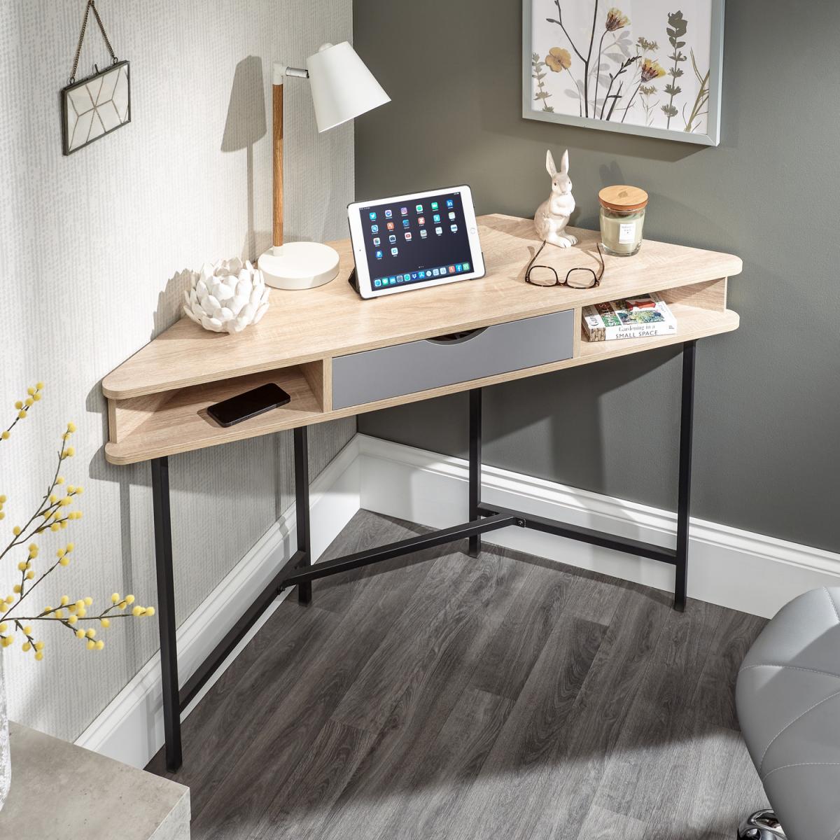 If you need a work-from-home option that does not impact your living space, this fabulous contemporary corner desk unit is a great choice. The compact design makes the most of an underused corner, incorporating a useful workspace, together with a storage section that's spacious enough to store most standard laptops and tablets plus media accessories. Available in a choice of classic light and dark oak-effect finish options with contrast drawers, or in highly durable concrete melamine for a minimalist look and feel that's uncompromisingly tough.