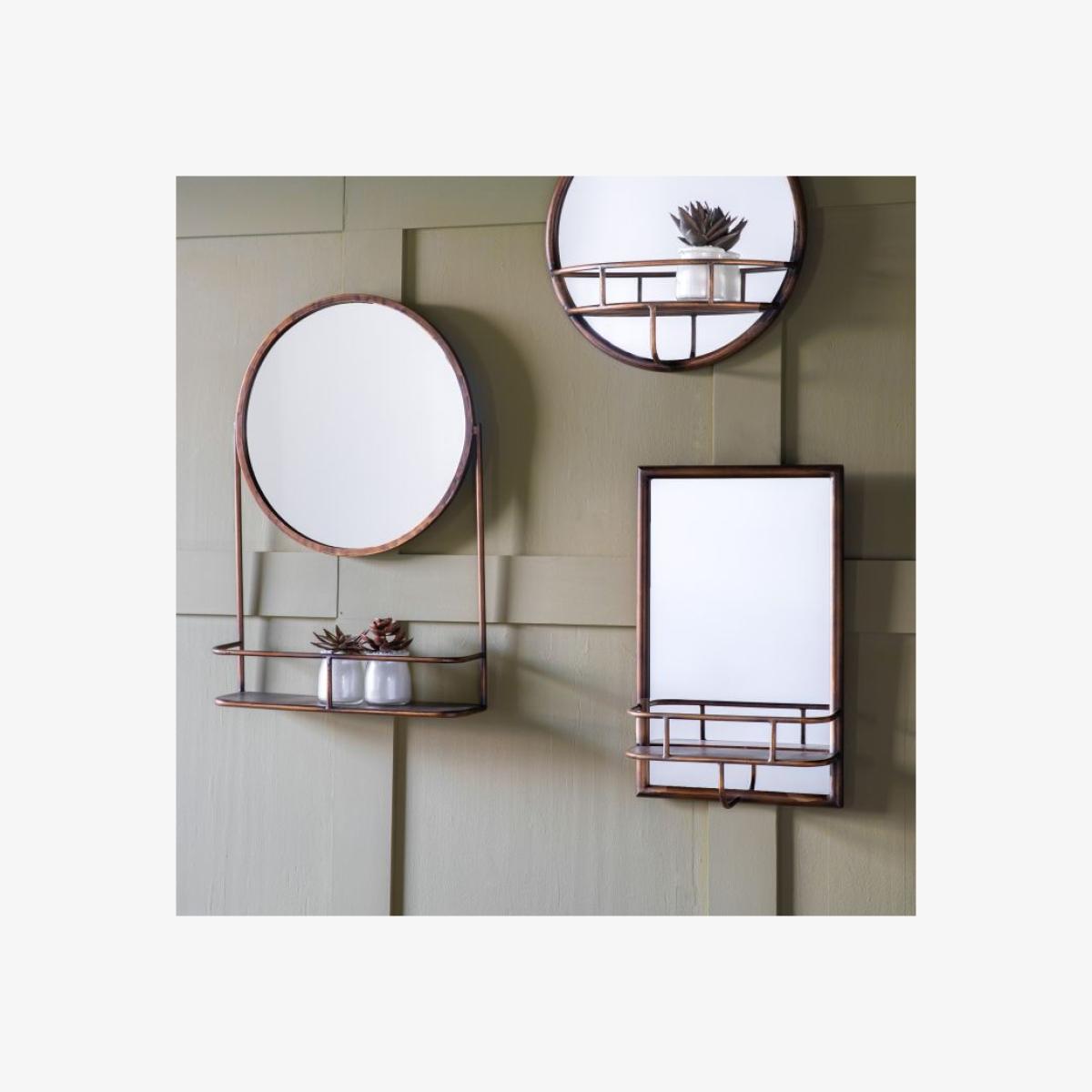 Rectangular mirror with a unique industrial style frame and shelf element in a bronze finish. Suitable for wall mounting in a bathroom or dressing room to make use of storage feature or in a living space with accessories. Shape: Rectangle. Material:Glass / Iron / MDF. Colour/Finish: Bronze.