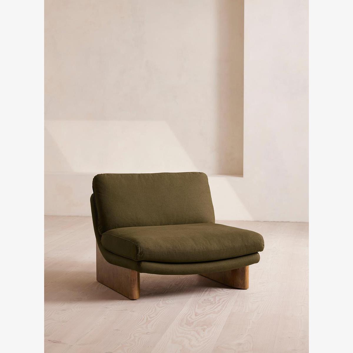 I’m a big fan of this olive linen chair for its low-slung, wide silhouette and muted green tone - it brings a relaxed yet sophisticated feel without overwhelming a room. It works particularly well in Scandi-inspired or mid-century modern schemes, pairing nicely with pale oak floors, black metal accents and simple geometric rugs. Styling tip: angle it towards your sofa or a coffee table to create an intimate seating area, then add a contrasting cushion in warm terracotta or burnt sienna. A chunky knit throw draped over one arm softens the shapes, while a slim side table in marble or brass provides just enough surface for a coffee cup or book.
