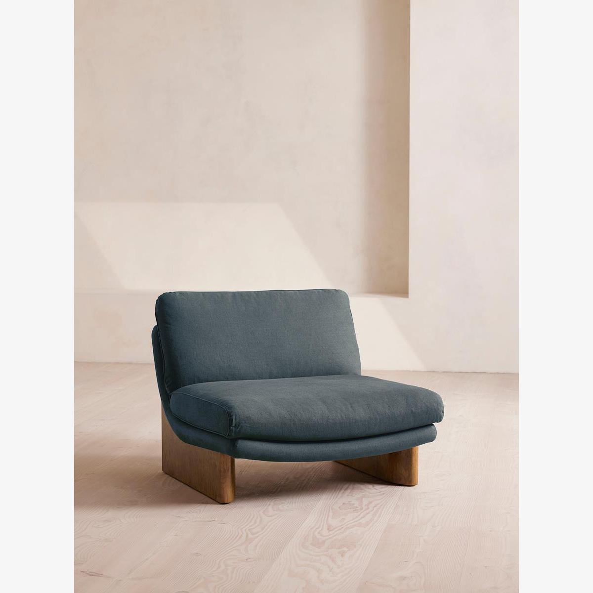 An oak burl base holds comfortable cushions wrapped in linen upholstery, available in our full made-to-order palette. Inspired by the social spaces of Soho House Portland, the Tellis armchair has a relaxed silhouette thanks to oversized foam and feather-filled cushions. It can be styled as a standalone armchair, or pieced together with the corner module to create a larger seating area.