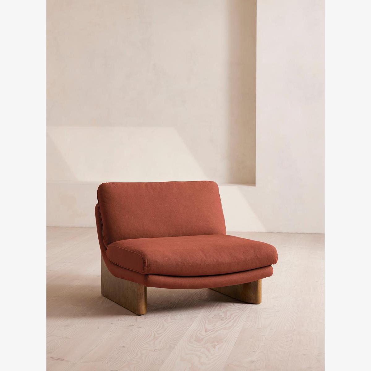 I’m a fan of this Sienna linen seat for its relaxed, low-slung profile and warm, earthy tone. The simple lines and solid oak legs make it a versatile piece that works equally well in Scandi-inspired living rooms, mid-century schemes or a laid-back boho corner. For styling, keep the palette neutral around it - think pale walls and light timber floors - to let the colour pop without overwhelming the room. Add a textured wool throw or a boucle cushion in creamy whites or soft greys for contrast, and place a slim, round side table beside it to hold a lamp or small plant.