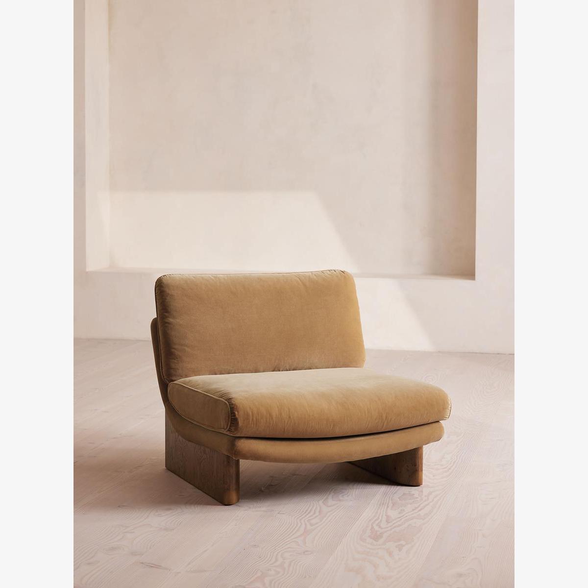 An oak burl base holds comfortable, oversized foam and feather-filled cushions wrapped in velvet upholstery for a relaxed silhouette. Inspired by the social spaces of Soho House Portland, the Tellis armchair has a relaxed silhouette thanks to its oversized foam and feather-filled cushions. Fully upholstered in velvet that comes in our range of bespoke colourways, it can be styled as a standalone armchair, or pieced together with the corner module to create a larger seating area.