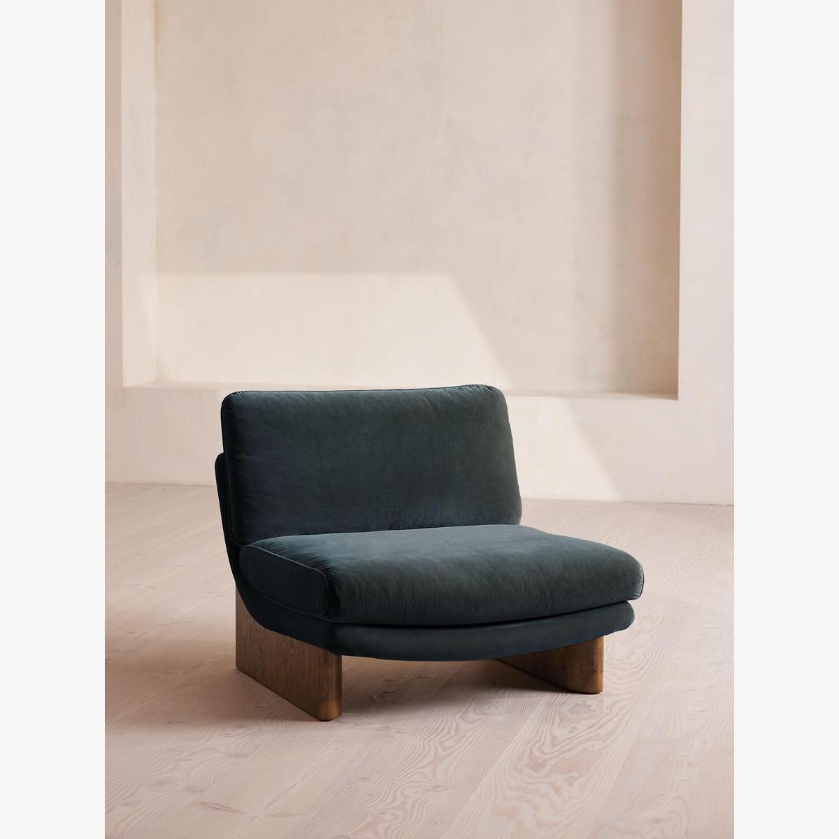 An oak burl base holds comfortable, oversized foam and feather-filled cushions wrapped in velvet upholstery for a relaxed silhouette. Inspired by the social spaces of Soho House Portland, the Tellis armchair has a relaxed silhouette thanks to its oversized foam and feather-filled cushions. Fully upholstered in velvet that comes in our range of bespoke colourways, it can be styled as a standalone armchair, or pieced together with the corner module to create a larger seating area.