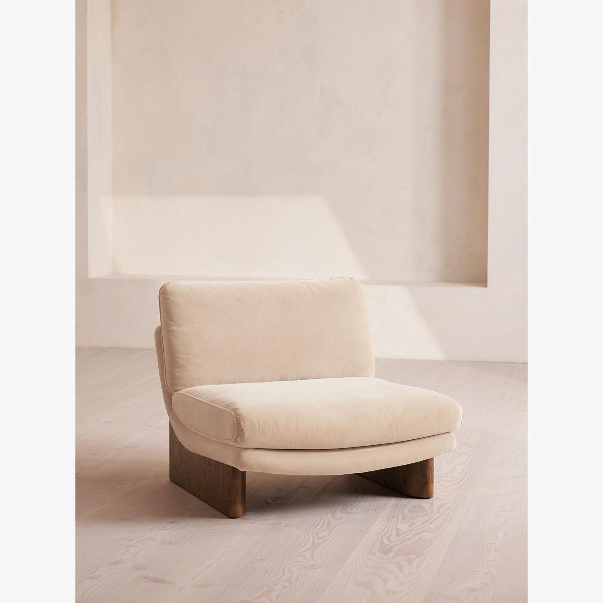 An oak burl base holds comfortable, oversized foam and feather-filled cushions wrapped in velvet upholstery for a relaxed silhouette. Inspired by the social spaces of Soho House Portland, the Tellis armchair has a relaxed silhouette thanks to its oversized foam and feather-filled cushions. Fully upholstered in velvet that comes in our range of bespoke colourways, it can be styled as a standalone armchair, or pieced together with the corner module to create a larger seating area.