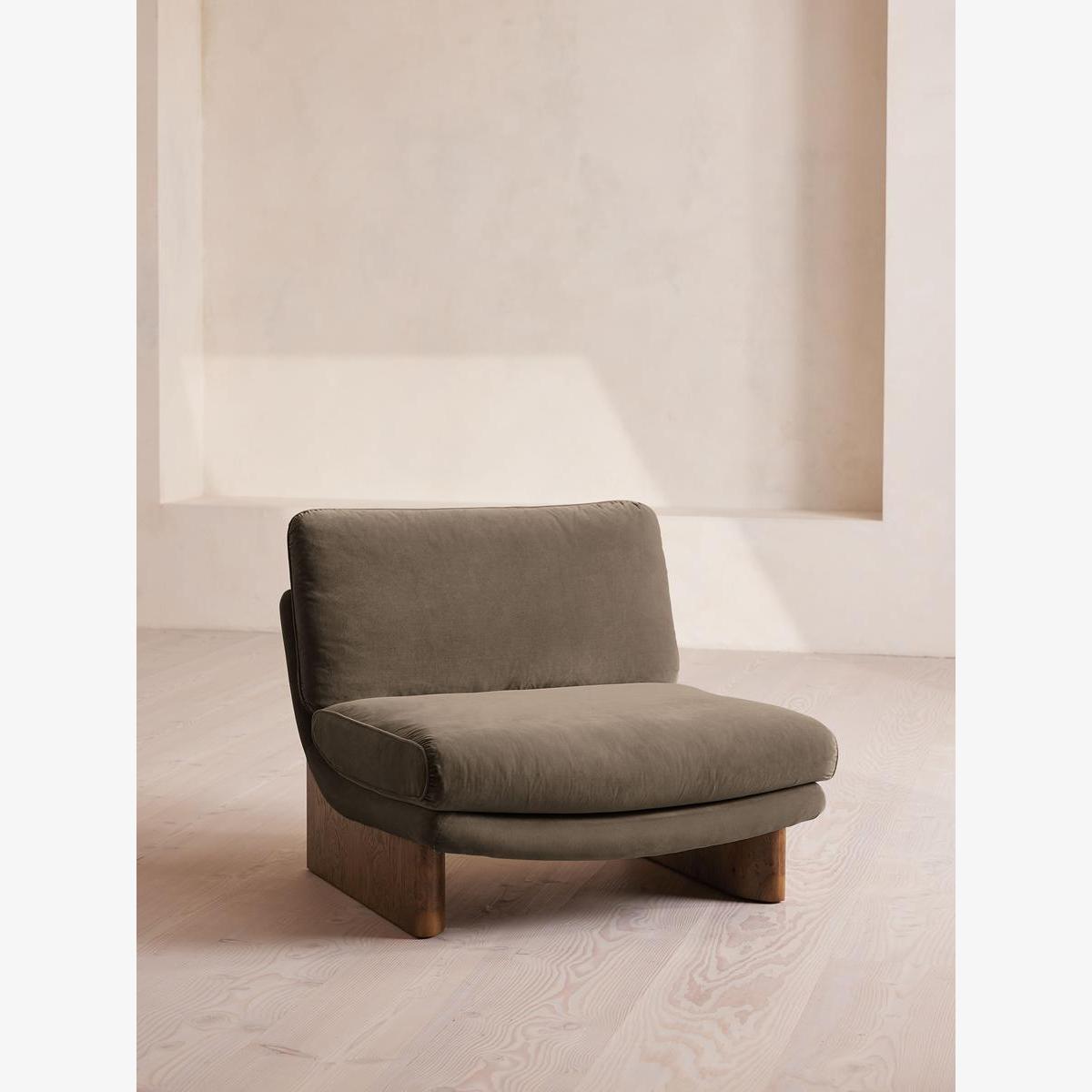 An oak burl base holds comfortable, oversized foam and feather-filled cushions wrapped in velvet upholstery for a relaxed silhouette. Inspired by the social spaces of Soho House Portland, the Tellis armchair has a relaxed silhouette thanks to its oversized foam and feather-filled cushions. Fully upholstered in velvet that comes in our range of bespoke colourways, it can be styled as a standalone armchair, or pieced together with the corner module to create a larger seating area.