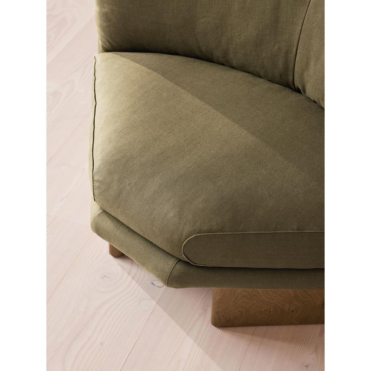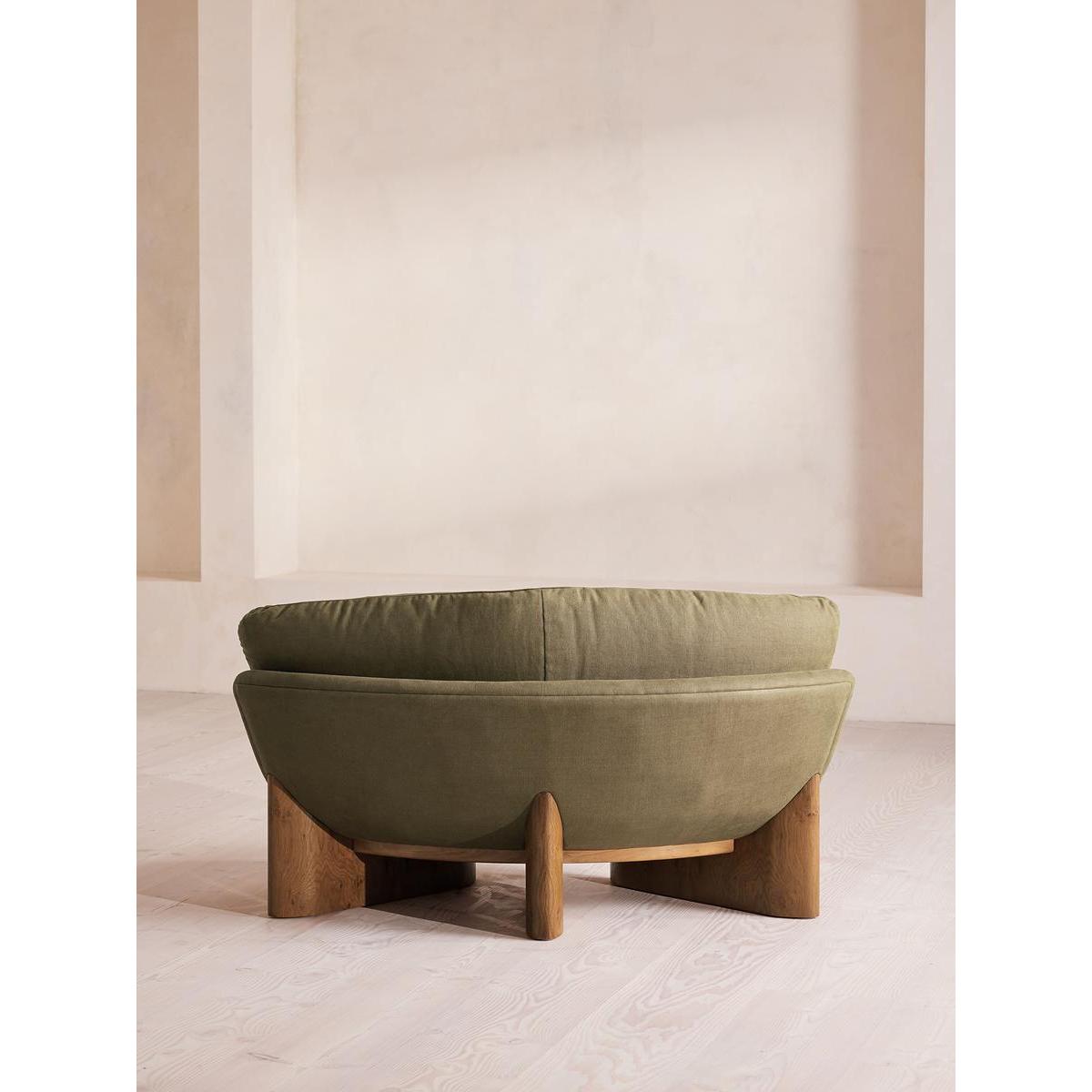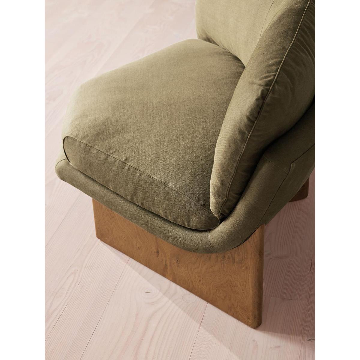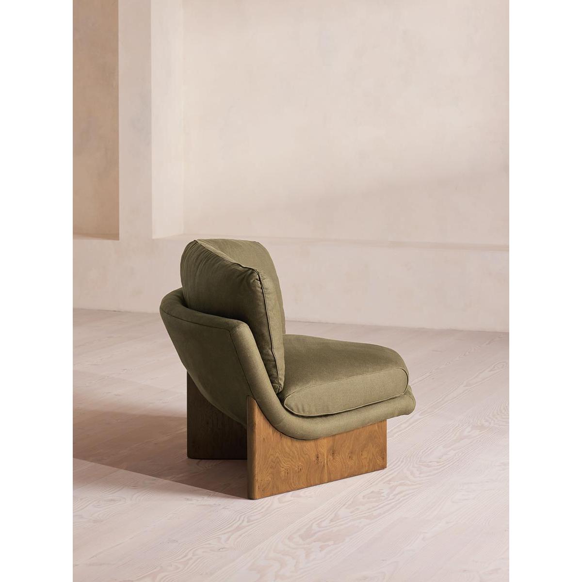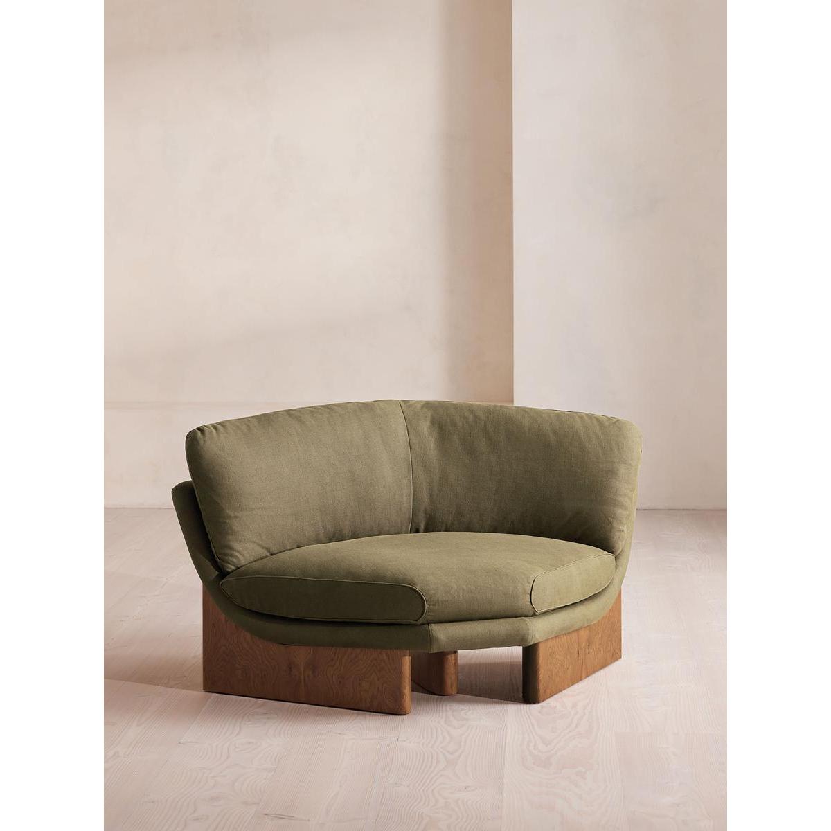 An oak burl base holds comfortable, oversized foam and feather-filled cushions wrapped in linen upholstery for a relaxed silhouette. Inspired by the social spaces of Soho House Portland, the Tellis armchair has a relaxed silhouette thanks to its oversized foam and feather-filled cushions. Fully upholstered in linen that comes in our range of bespoke colorways, it can be styled as a standalone armchair, or pieced together with the corner module to create a larger seating area.