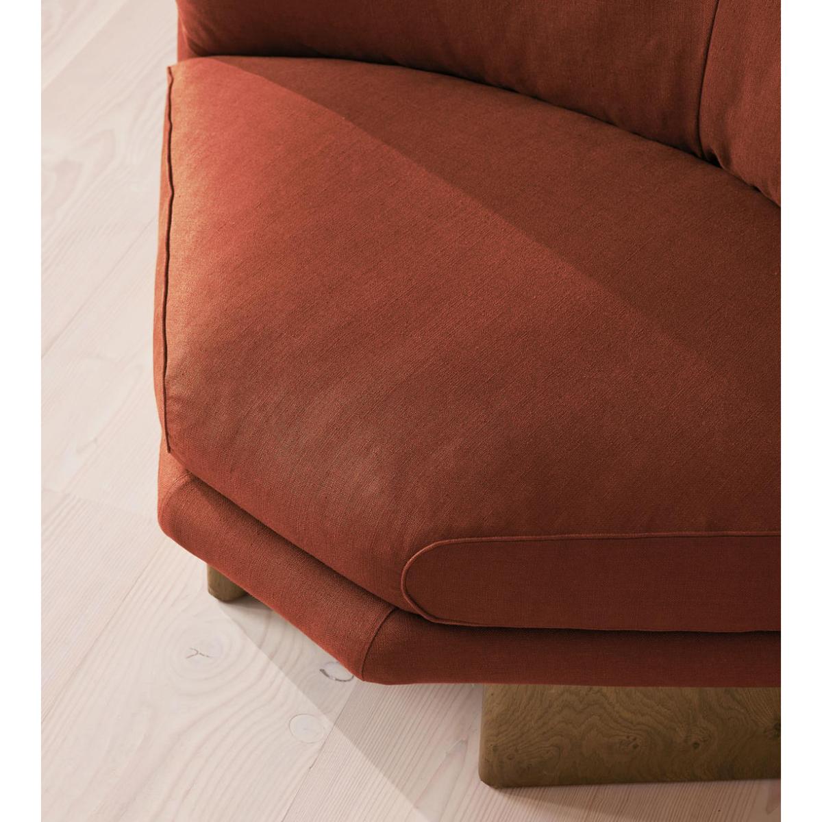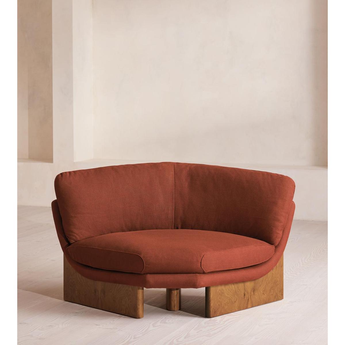 I’m a fan of this corner chair thanks to its warm sienna linen and compact, curved silhouette - it slots neatly into a living room corner or snug without overwhelming the space. The combination of soft upholstery and the solid wood base pairs especially well with Scandi, mid-century and contemporary interiors, adding an organic touch wherever it’s placed. For styling, try layering a neutral wool throw over one arm and a small, textured cushion in a complementary shade of rust or ochre. Position it beside a low-profile coffee table or a slim floor lamp to create a cosy reading nook, and balance out the curves with some angular side tables or minimalist shelving.
