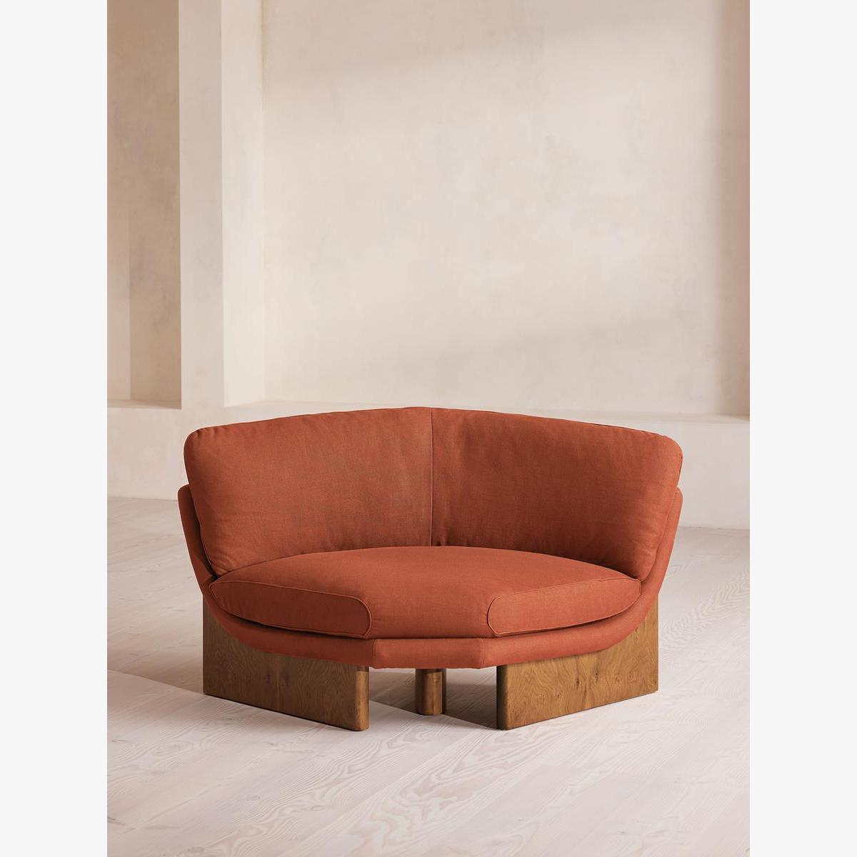 An oak burl base holds comfortable, oversized foam and feather-filled cushions wrapped in linen upholstery for a relaxed silhouette. Inspired by the social spaces of Soho House Portland, the Tellis armchair has a relaxed silhouette thanks to its oversized foam and feather-filled cushions. Fully upholstered in linen that comes in our range of bespoke colourways, it can be styled as a standalone armchair, or pieced together with the corner module to create a larger seating area.
