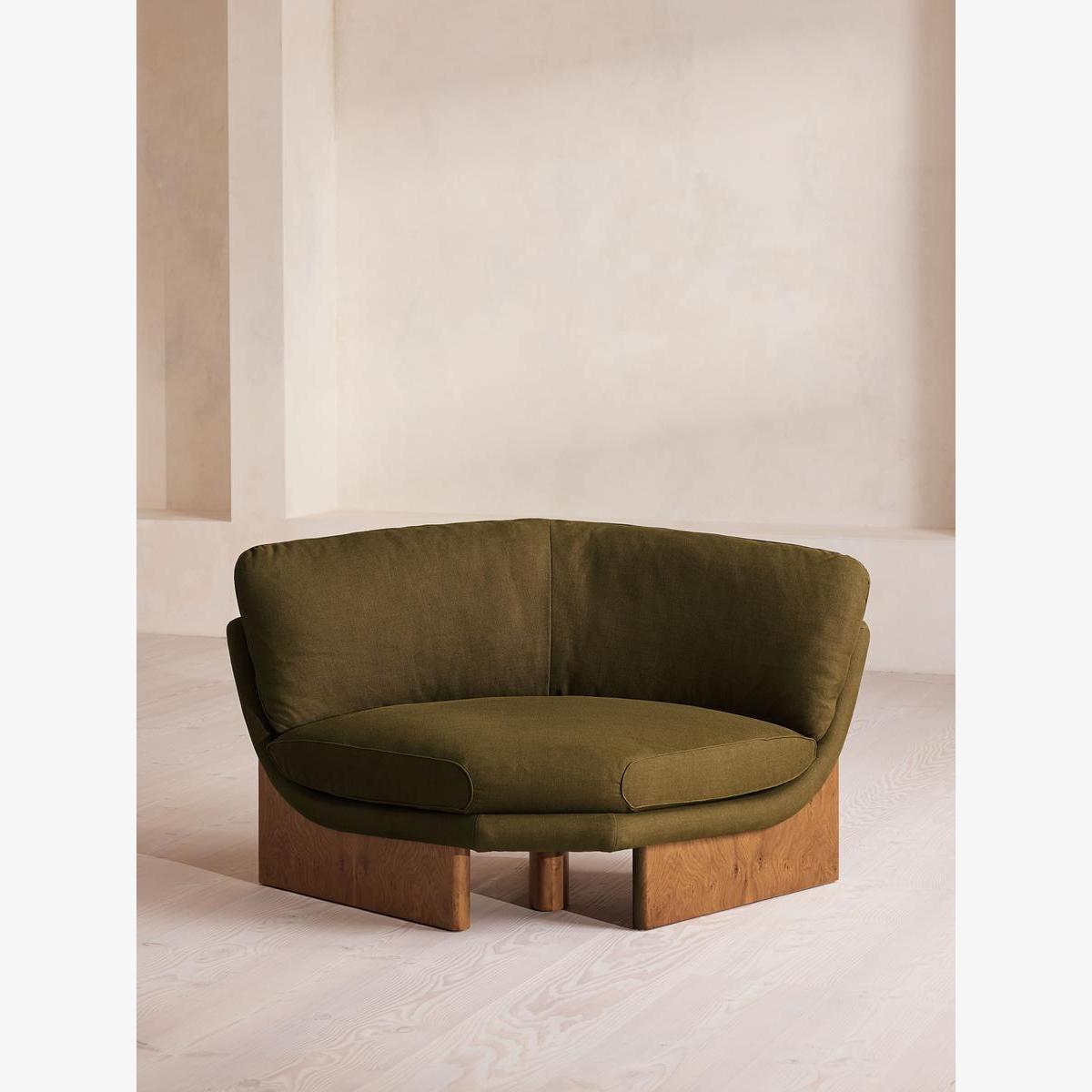 I love this corner module for its versatility and clean linen fabric in a calming olive tone, which adds warmth and character to a variety of interiors. It works particularly well in contemporary, mid-century modern, or Scandinavian schemes where muted colours and natural materials are key. Practical styling tips include pairing it with neutral tones for an understated look, or layering with patterned cushions and throws for added texture and colour. Its compact form makes it ideal for smaller living spaces or cosy corners, and the wooden base adds a touch of natural warmth. Overall, it’s a stylish yet functional piece that can be easily adapted to different interior styles.