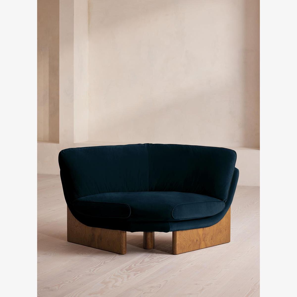 An oak burl base holds comfortable, oversized foam and feather-filled cushions wrapped in velvet upholstery for a relaxed silhouette. Inspired by the social spaces of Soho House Portland, the Tellis armchair has a relaxed silhouette thanks to its oversized foam and feather-filled cushions. Fully upholstered in velvet that comes in our range of bespoke colourways, it can be styled as a standalone armchair, or pieced together with the corner module to create a larger seating area.