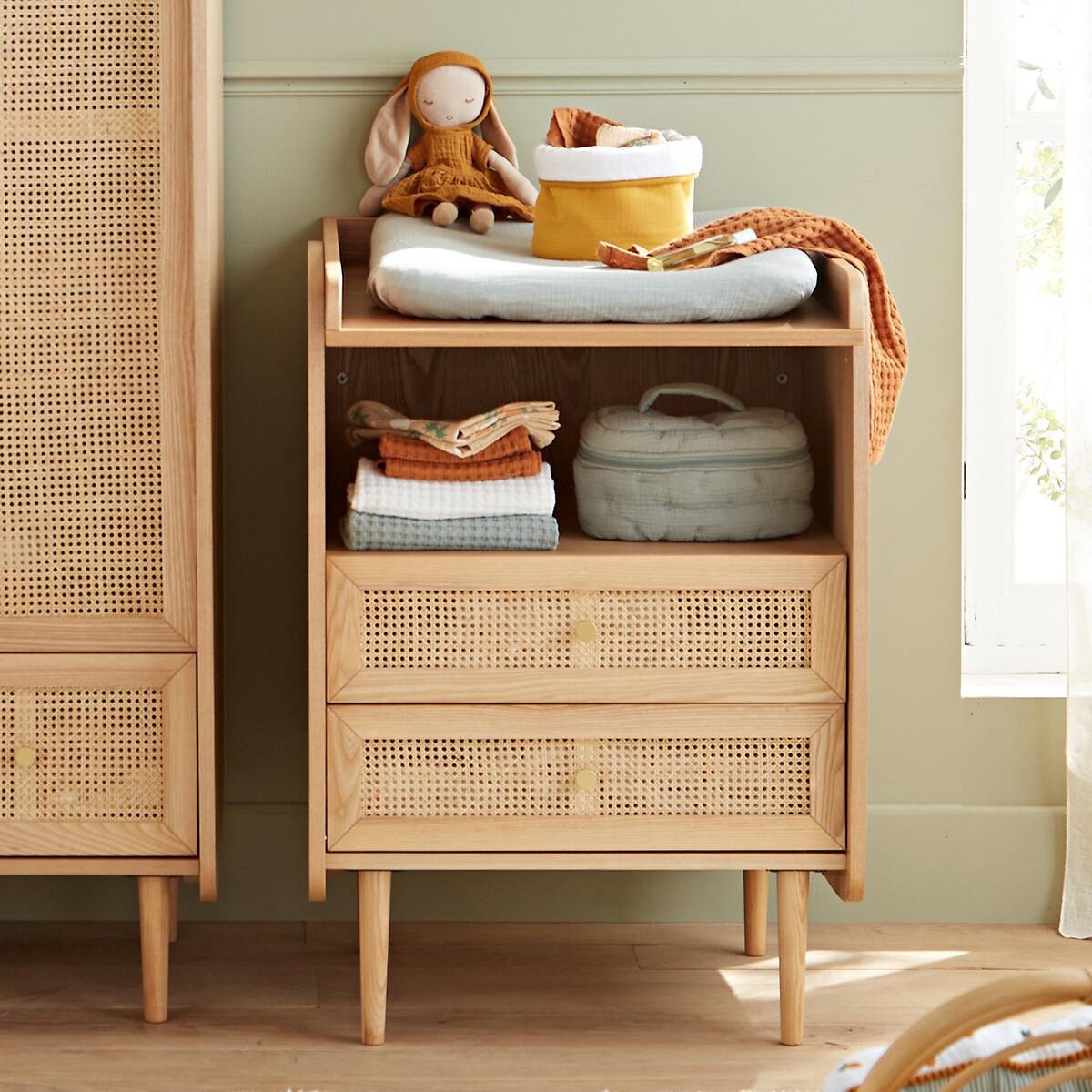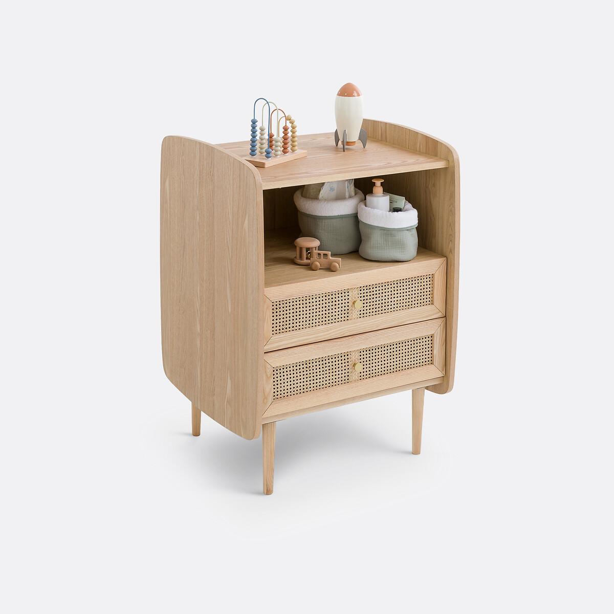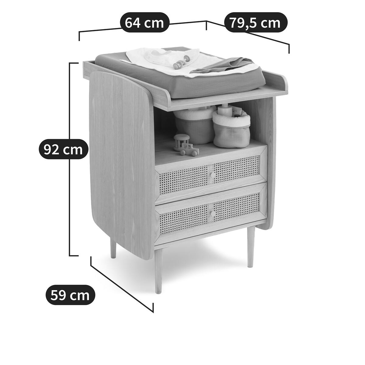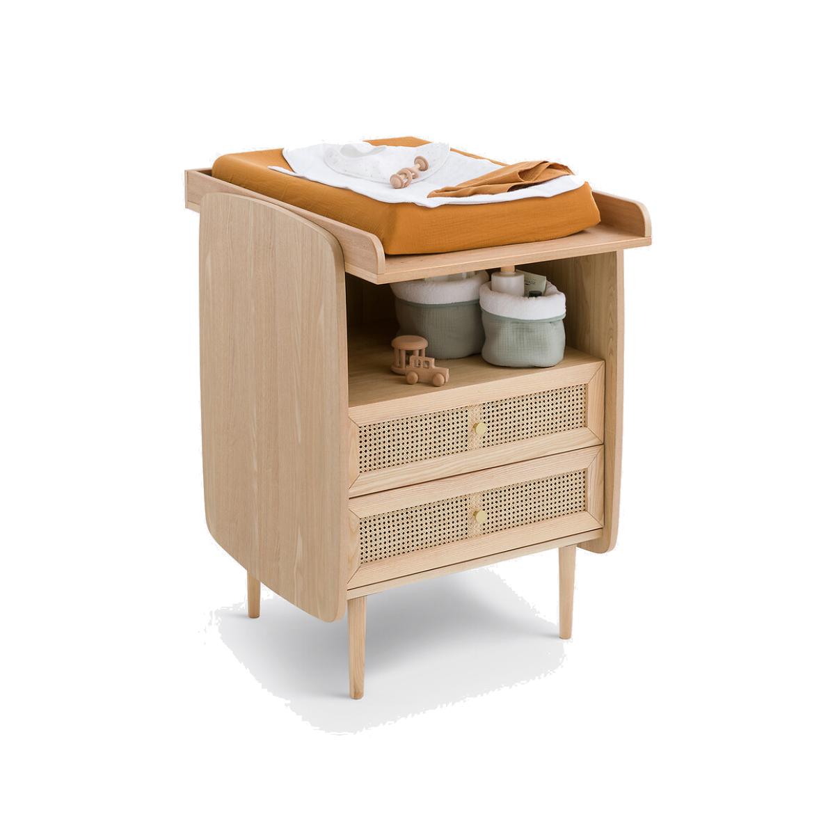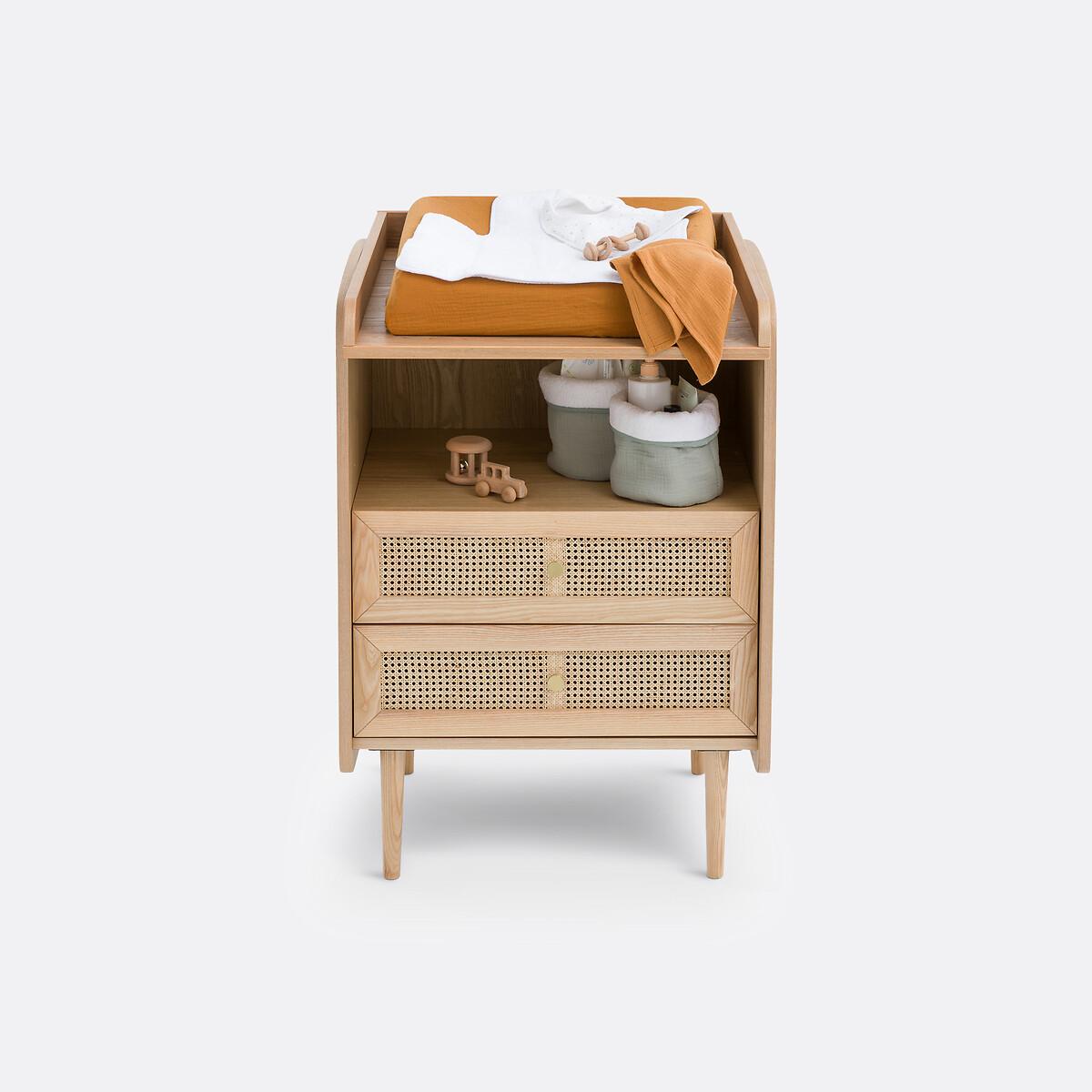Blonde wood, rattan canework fronts, rounded corners... Equipped with a removable changing table, a compartment and 2 drawers, the Tempa changing table will welcome your baby in complete safety and allows you to have everything you need to hand: without taking your eyes off your little one! Product Details • Structure in FSC® certified oak veneered MDF, nitrocellulose varnish finish • 2 drawers with rattan cane fronts • 1 compartment • Iron handles, brass finish • Solid ash legs, nitrocellulose varnish finish • Removable changing topDimensions. Overall • Width: 64cm • Height: 92cm • Depth: 79.5cm (59cm without changing table) • Weight: 40.5kg. Usable space • Changing mat: W. 60cm x Length. 79.5cm • Assembly required. • WOOD FROM SUSTAINABLY MANAGED FORESTS. FSC® certified wood comes from forests that are environmentally, socially and economically well managed. Dimensions and weight of parcel1 parcel • L89.5 x H27 x D71cm. 44kg.