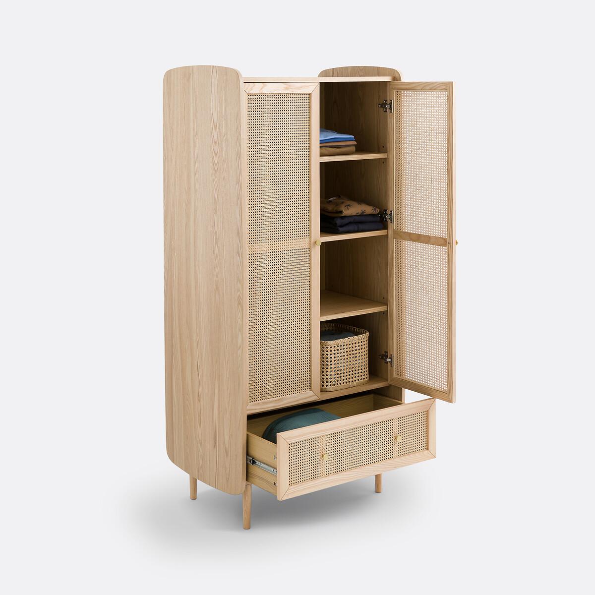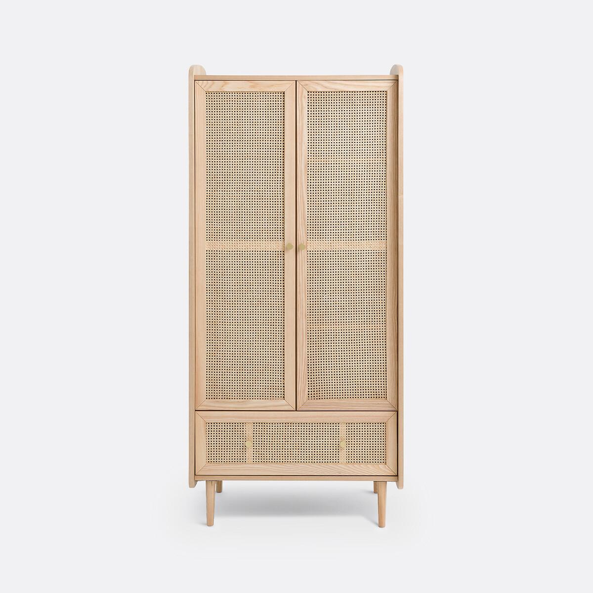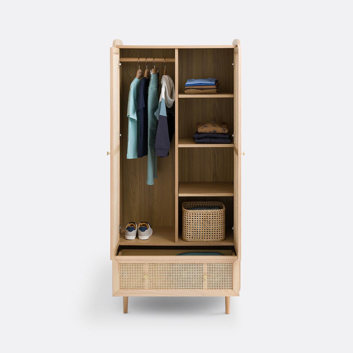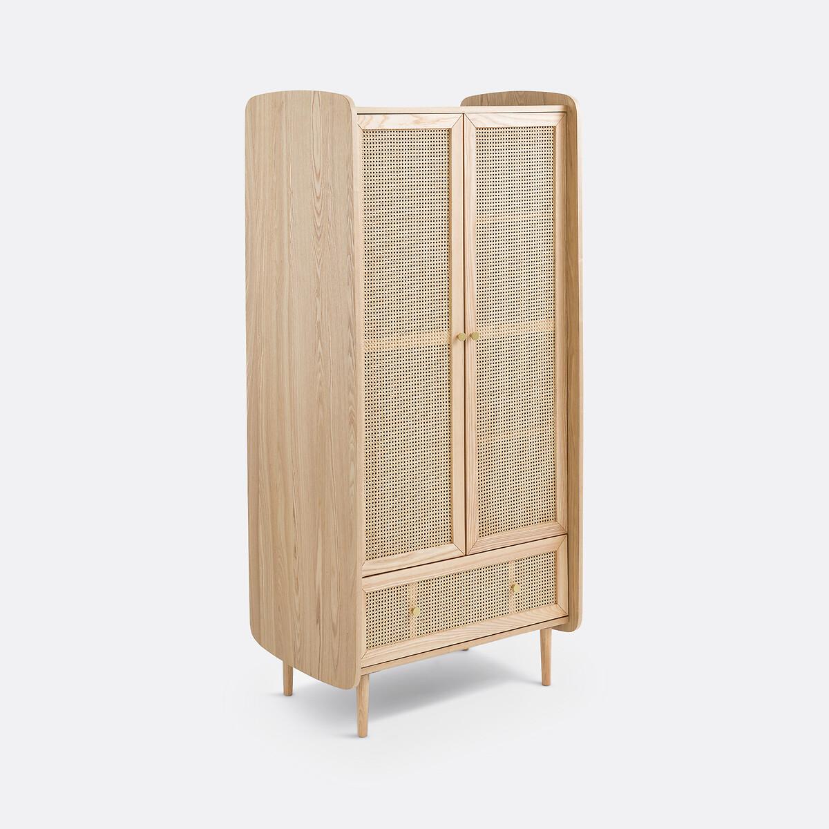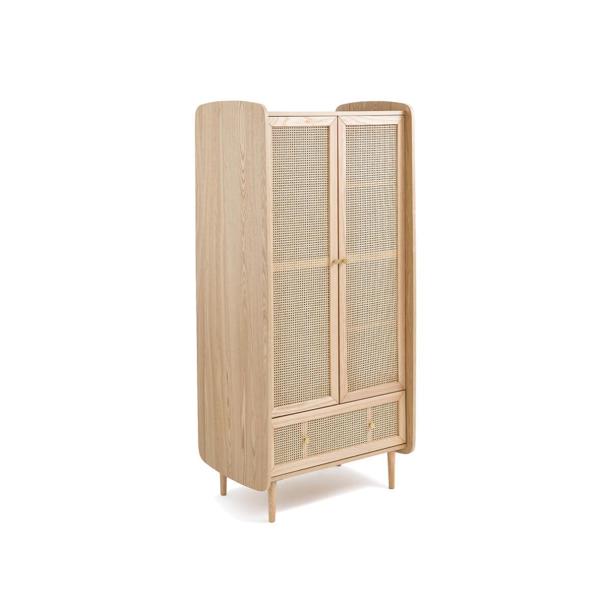 Blonde wood, rattan cane fronts, rounded corners... Equipped with a wardrobe on the left, a clothes rack on the right and a drawer, the Tempa wardrobe offers a beautiful storage space with retro charm. It will go perfectly with the other furniture in the range.. Product Details • Structure in FSC® certified oak veneered MDF, nitrocellulose varnish finish • 1 drawer with rattan cane front • 2 rattan cane doors with 1 wardrobe on the left and 4 compartments on the right • Iron handles, brass finish • Solid ash legs, nitrocellulose varnish finishDimensions. Overall • Width: 80cm • Height: 175.5cm • Depth: 58cm • Weight: 70kg. Usable space • Drawers : L75.6 x H18 x D35.5cm • Assembly required. • WOOD FROM SUSTAINABLY MANAGED FORESTS. FSC® certified wood comes from forests that are environmentally, socially and economically well managed. Dimensions and weight of parcel2 parcels • L134 x H20 x D55cm. 28kg. • L171 x H19 x D68.5cm. 48kg.