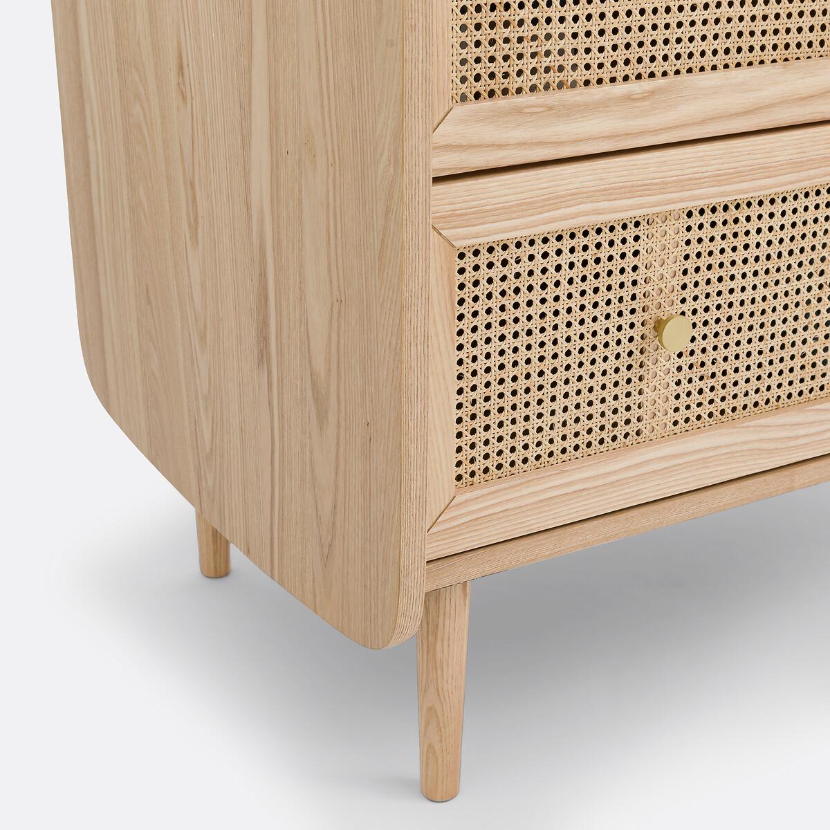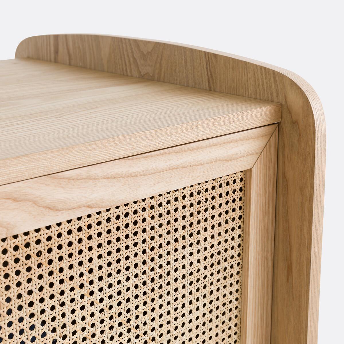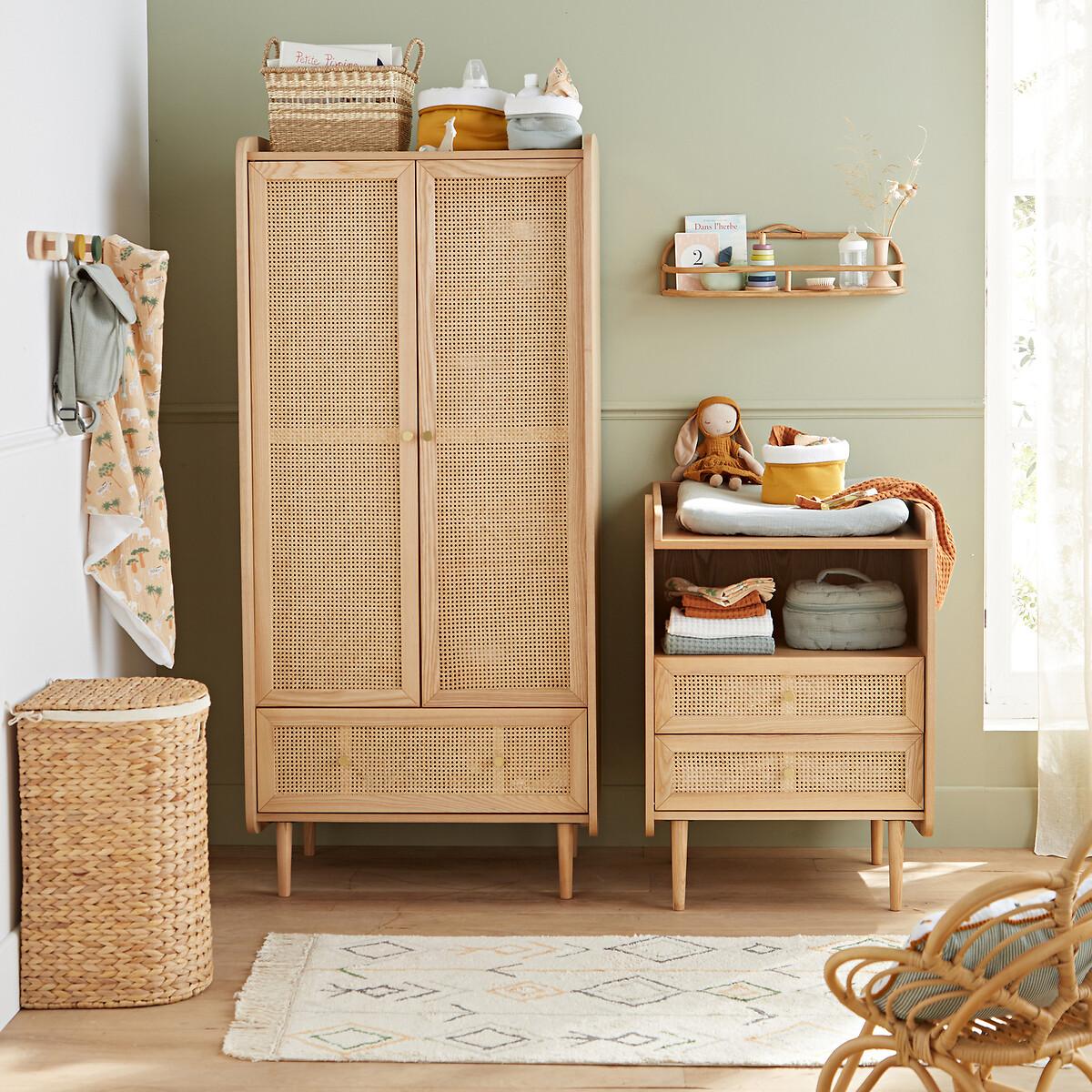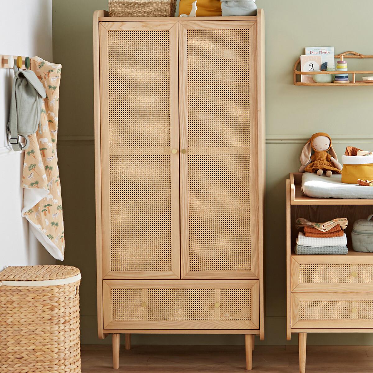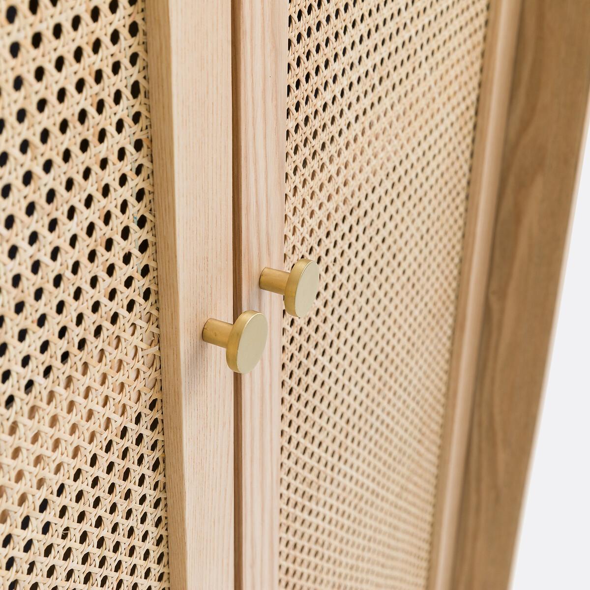 Blonde wood, rattan cane fronts, rounded corners... Equipped with a wardrobe on the left, a clothes rack on the right and a drawer, the Tempa wardrobe offers a beautiful storage space with retro charm. It will go perfectly with the other furniture in the range.. Product Details • Structure in FSC® certified oak veneered MDF, nitrocellulose varnish finish • 1 drawer with rattan cane front • 2 rattan cane doors with 1 wardrobe on the left and 4 compartments on the right • Iron handles, brass finish • Solid ash legs, nitrocellulose varnish finishDimensions. Overall • Width: 80cm • Height: 175.5cm • Depth: 58cm • Weight: 70kg. Usable space • Drawers : L75.6 x H18 x D35.5cm • Assembly required. • WOOD FROM SUSTAINABLY MANAGED FORESTS. FSC® certified wood comes from forests that are environmentally, socially and economically well managed. Dimensions and weight of parcel2 parcels • L134 x H20 x D55cm. 28kg. • L171 x H19 x D68.5cm. 48kg.