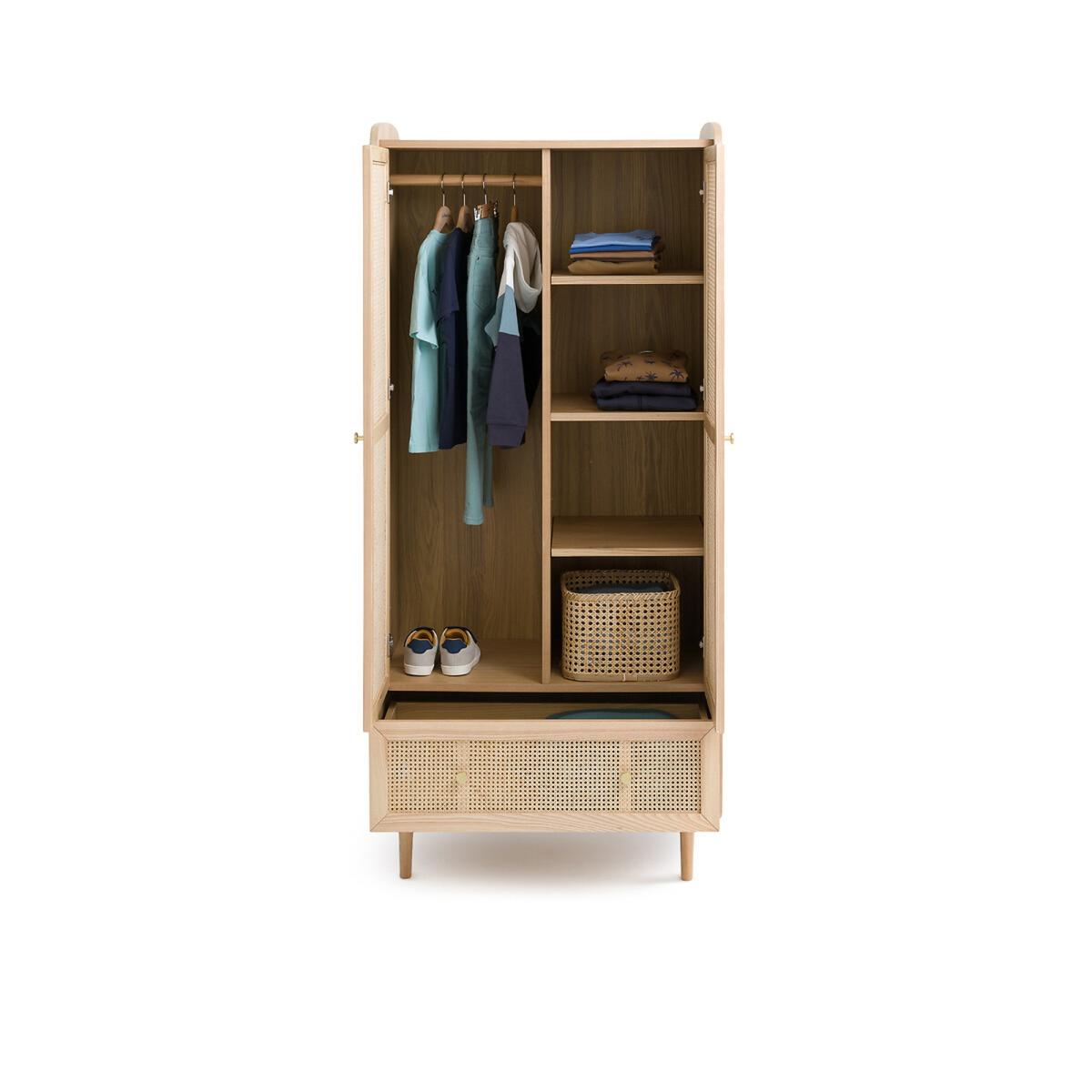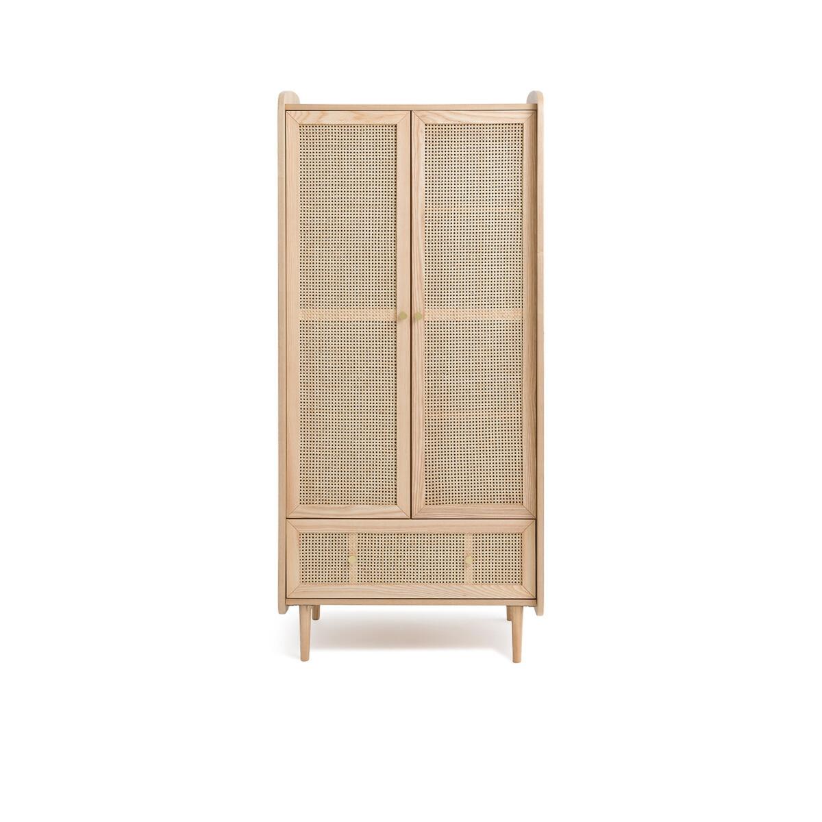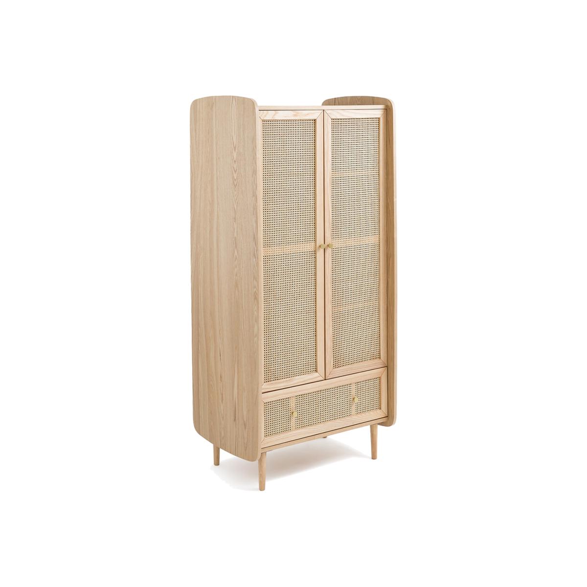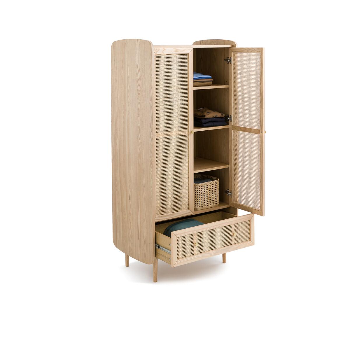 Blonde wood, rattan cane fronts, rounded corners... Equipped with a wardrobe on the left, a clothes rack on the right and a drawer, the Tempa wardrobe offers a beautiful storage space with retro charm.