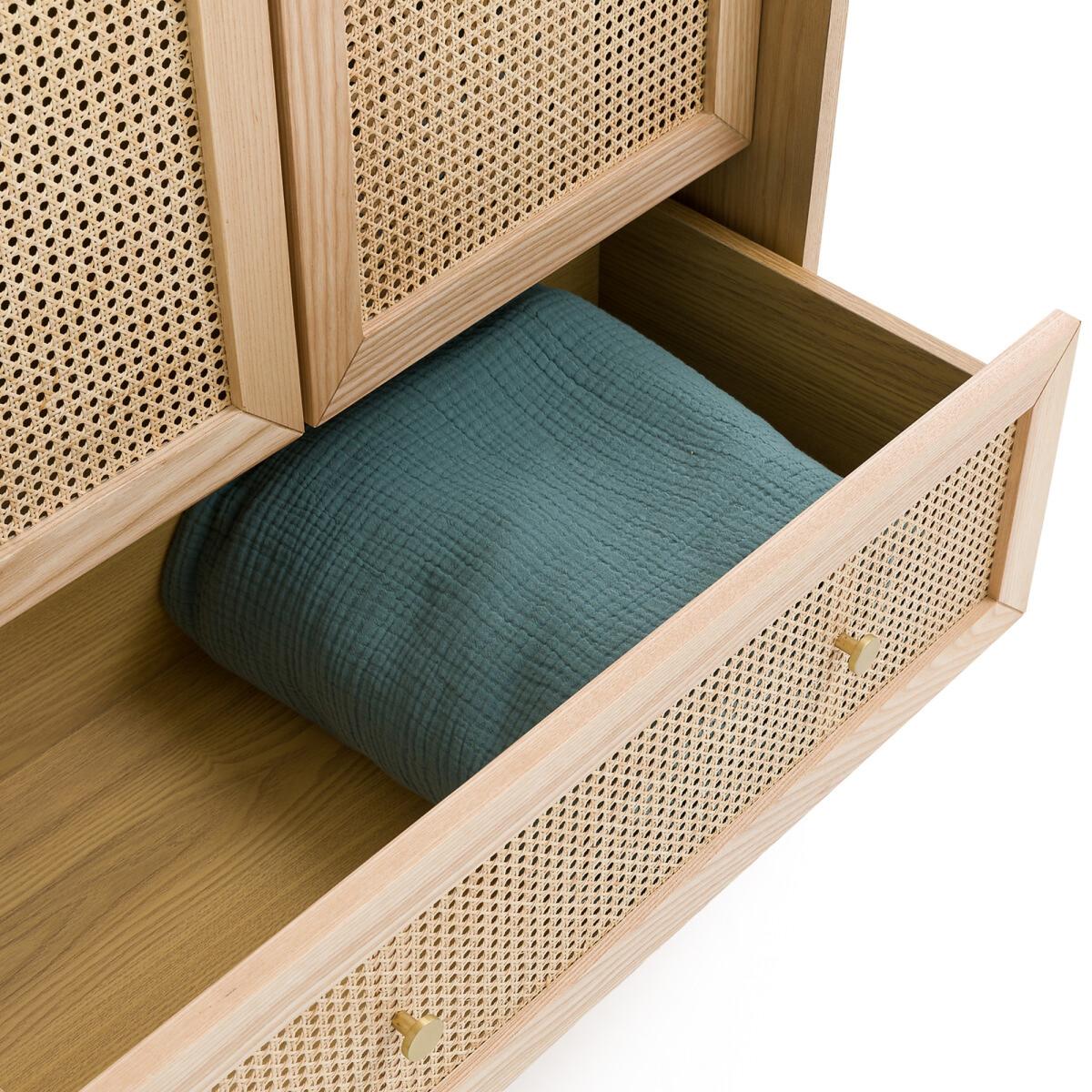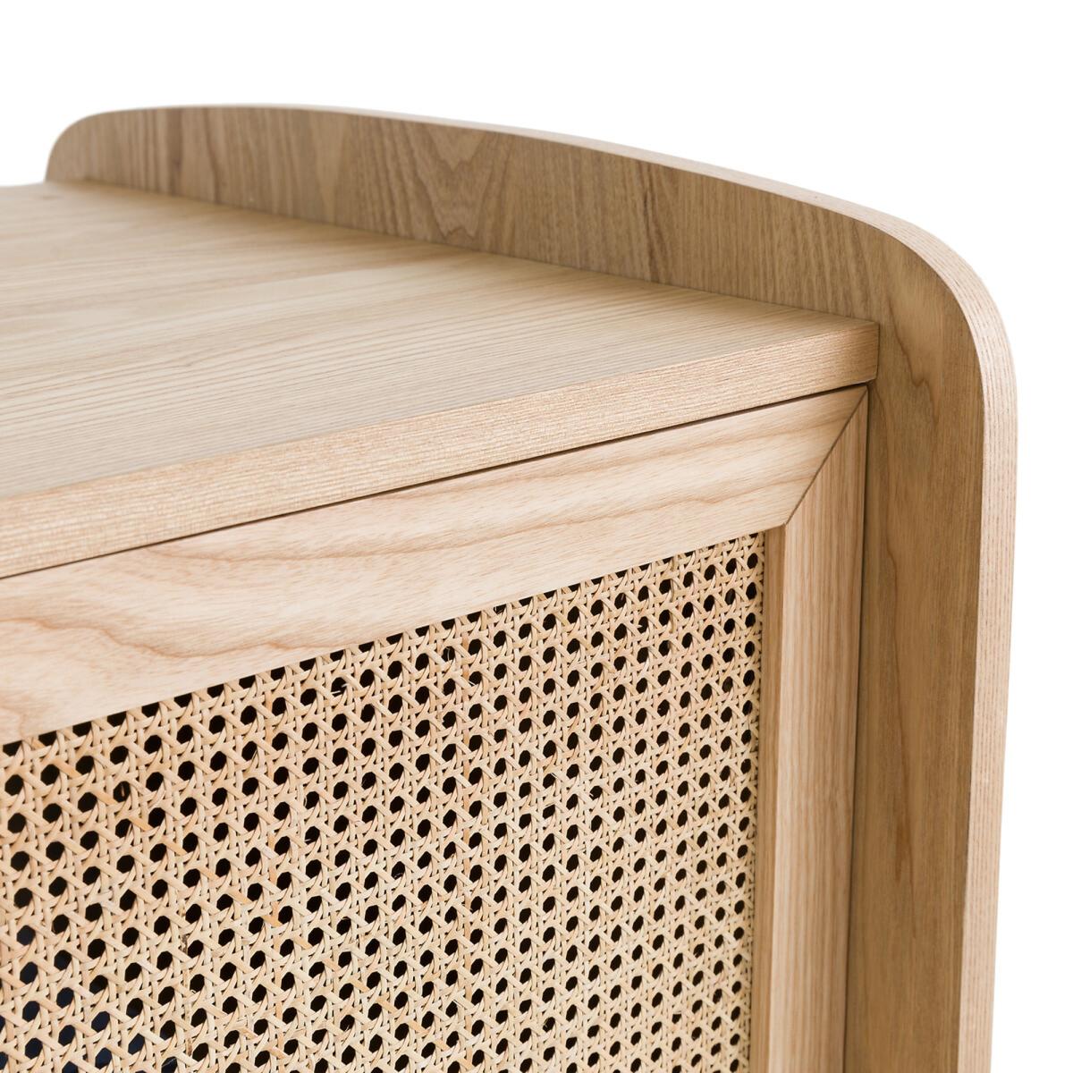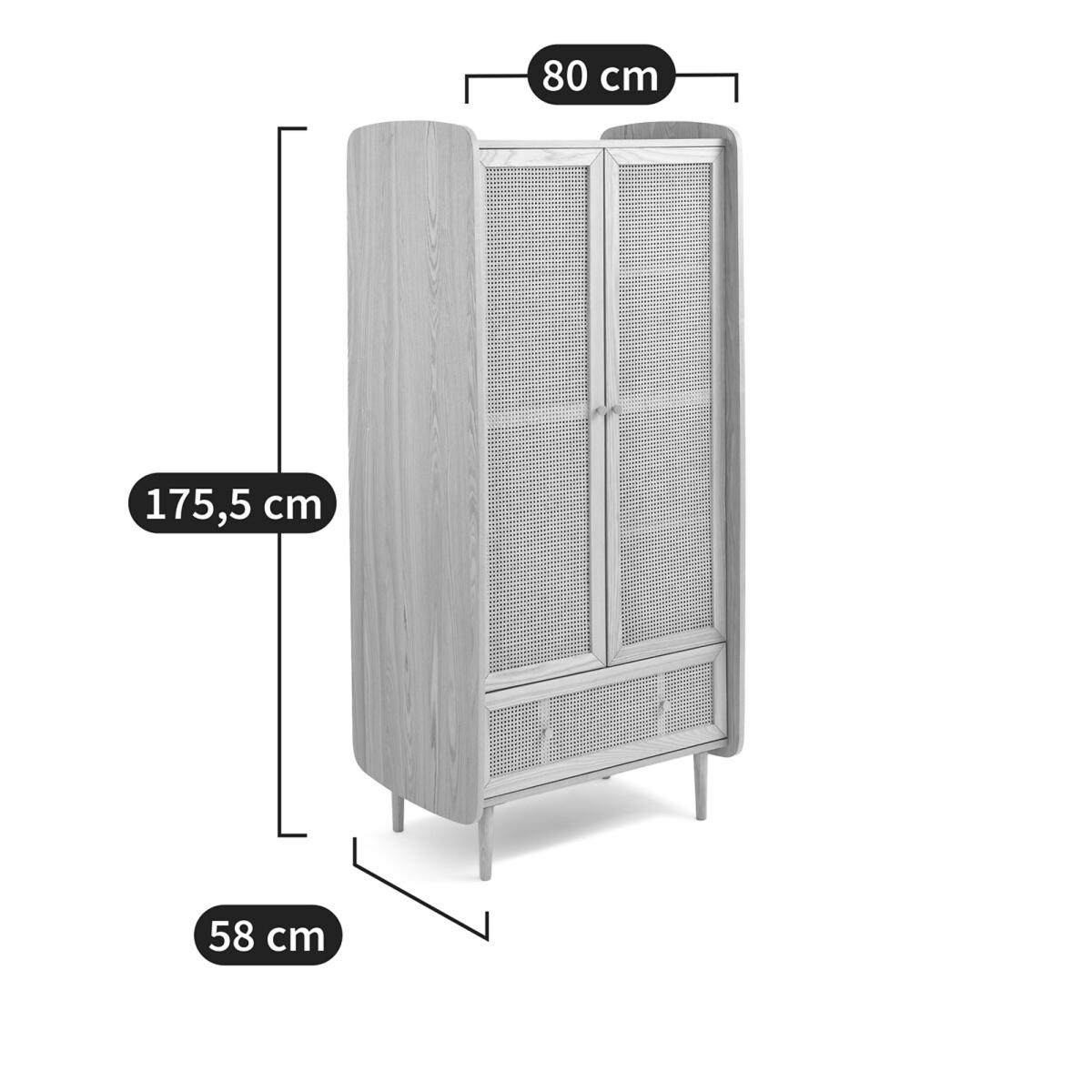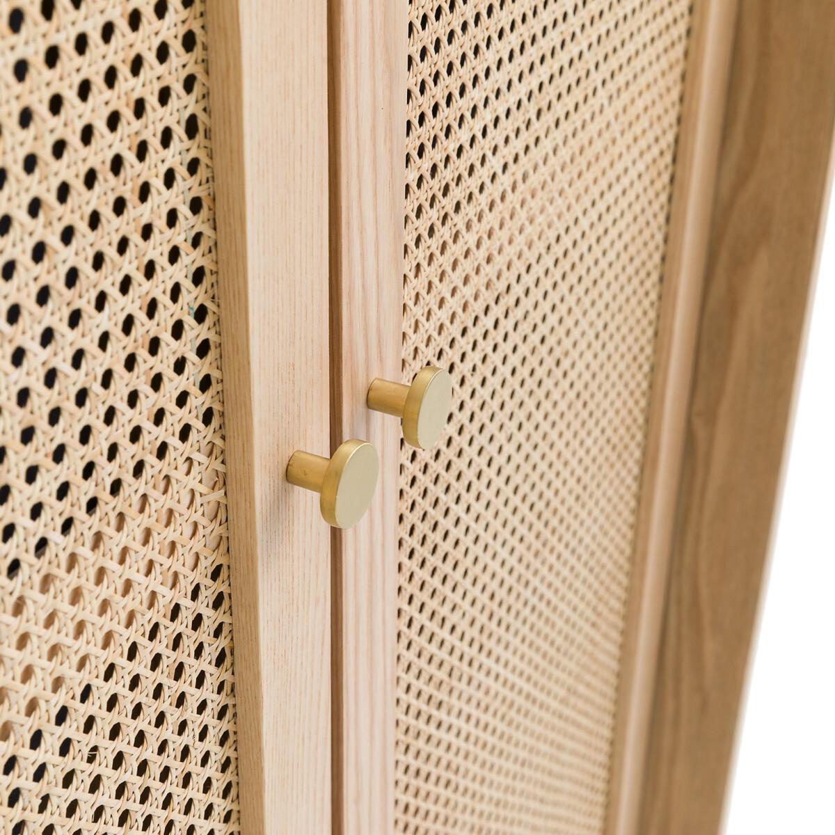 Blonde wood, rattan cane fronts, rounded corners... Equipped with a wardrobe on the left, a clothes rack on the right and a drawer, the Tempa wardrobe offers a beautiful storage space with retro charm.