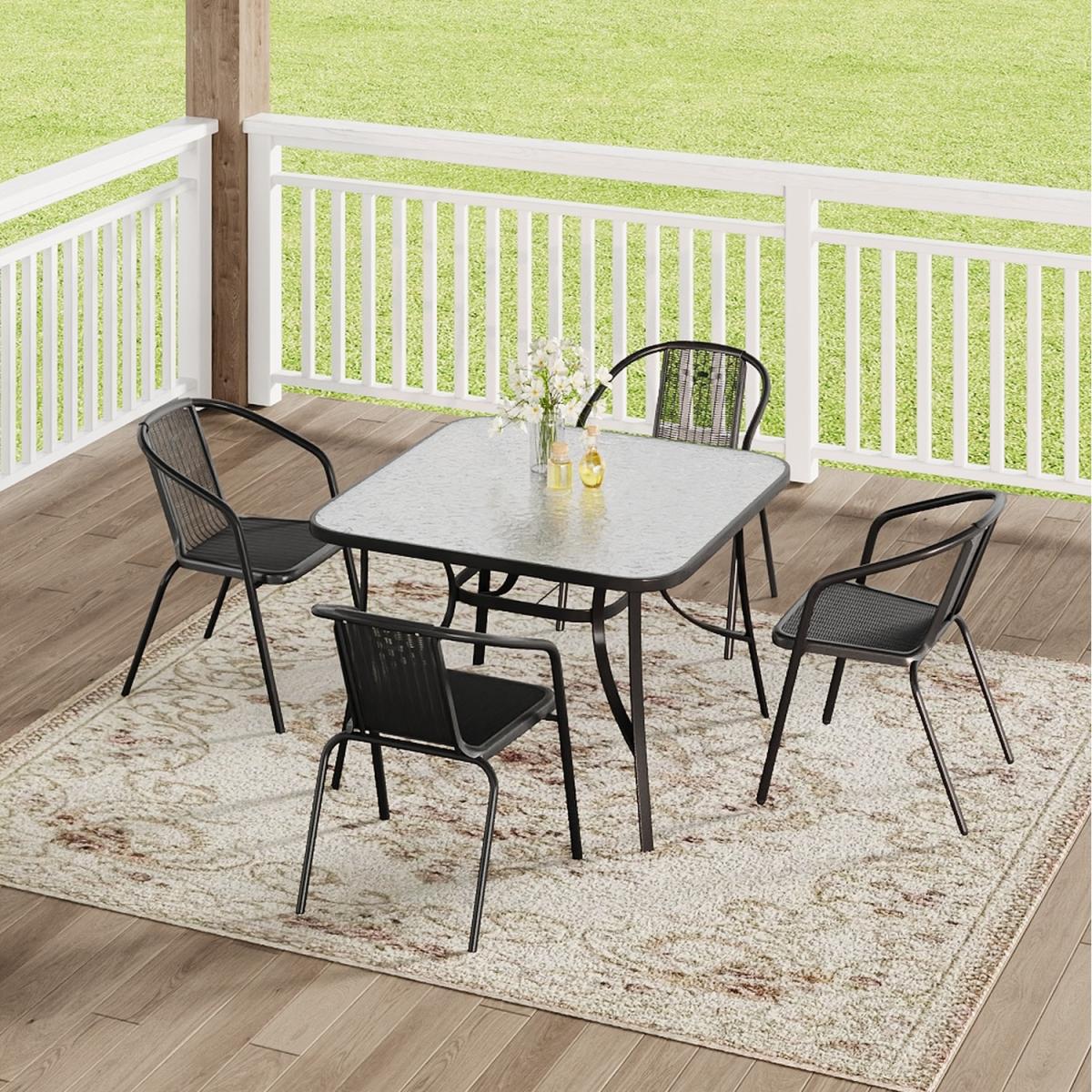 This garden table takes inspiration from classic wrought-iron designs, adding a romantic charm to your outdoor area. Featuring a stylish and timeless black finish with a simple, elegant style, the screen-printed table will enhance any garden or terrace. Not only visually appealing, it is also built to last with a practical tabletop for long-term use. Suitable for both sunny and wet weather, it includes a central umbrella hole. The set also includes four rattan chairs, crafted from weather-resistant PE rattan and supported by a rustproof metal frame, ensuring durability and stability for outdoor dining.