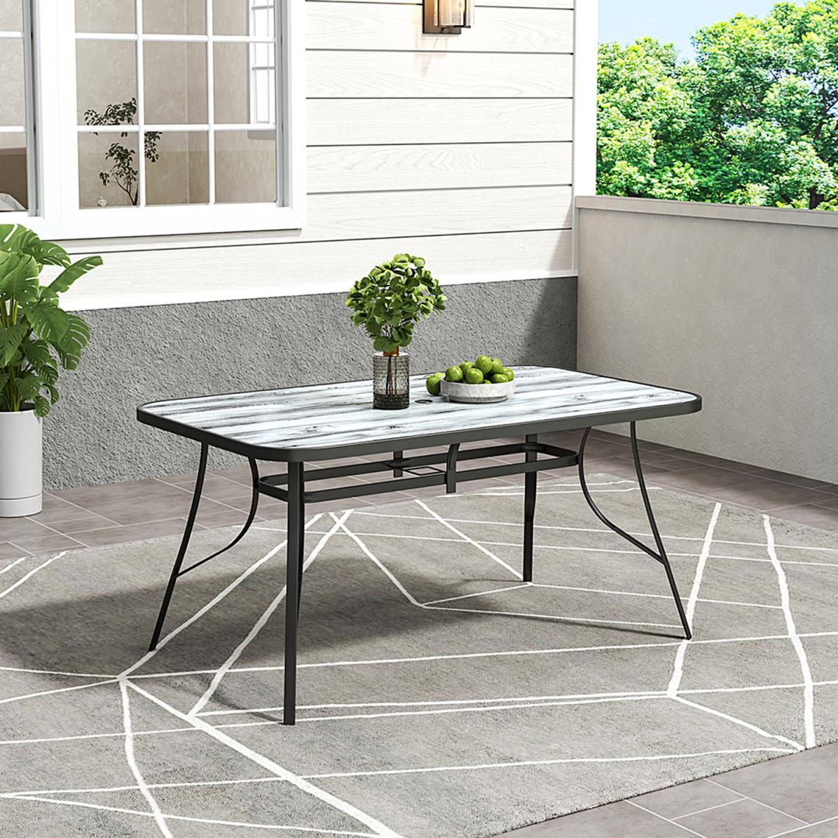 This garden table features a durable tempered glass top with a realistic wood effect pattern beneath it. The black metal frame and base ensure strength and durability, making it a versatile addition to any backyard or patio decor. Tempered Glass Wood Effect Garden Table - Black / 150*90*72cm