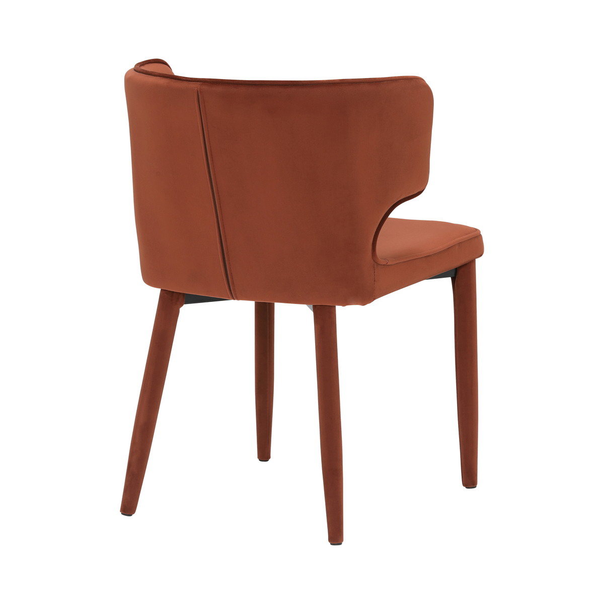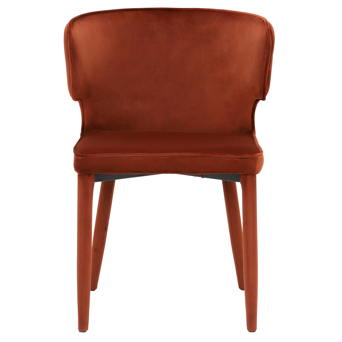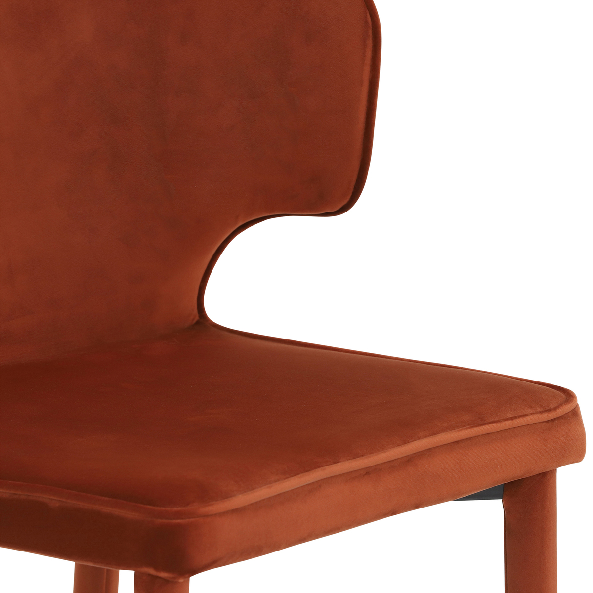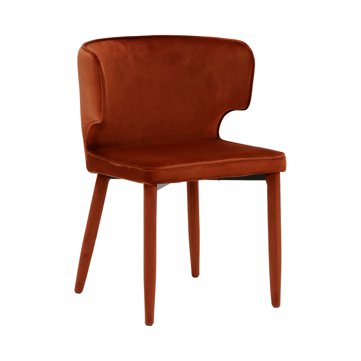 I love this dining chair for its rich amber velvet, which adds warmth and sophistication to any setting. Its clean, rounded silhouette makes it versatile - perfect for both contemporary and retro-inspired interiors. The velvet finish invites a touch of luxe, while the sturdy wooden legs keep it practical for everyday use. To style it well, consider pairing with a mix of textured and patterned tableware, or using it as a statement piece around a natural wood or marble table. It works beautifully in both cosy kitchens and more polished dining rooms, especially when layered with soft textiles and warm lighting for a welcoming atmosphere.