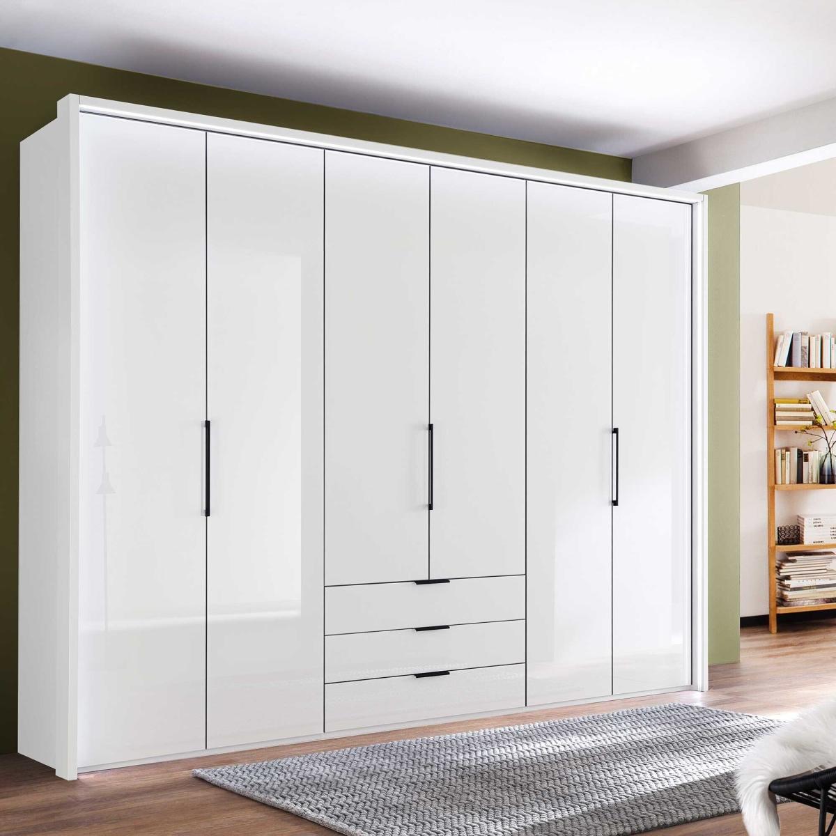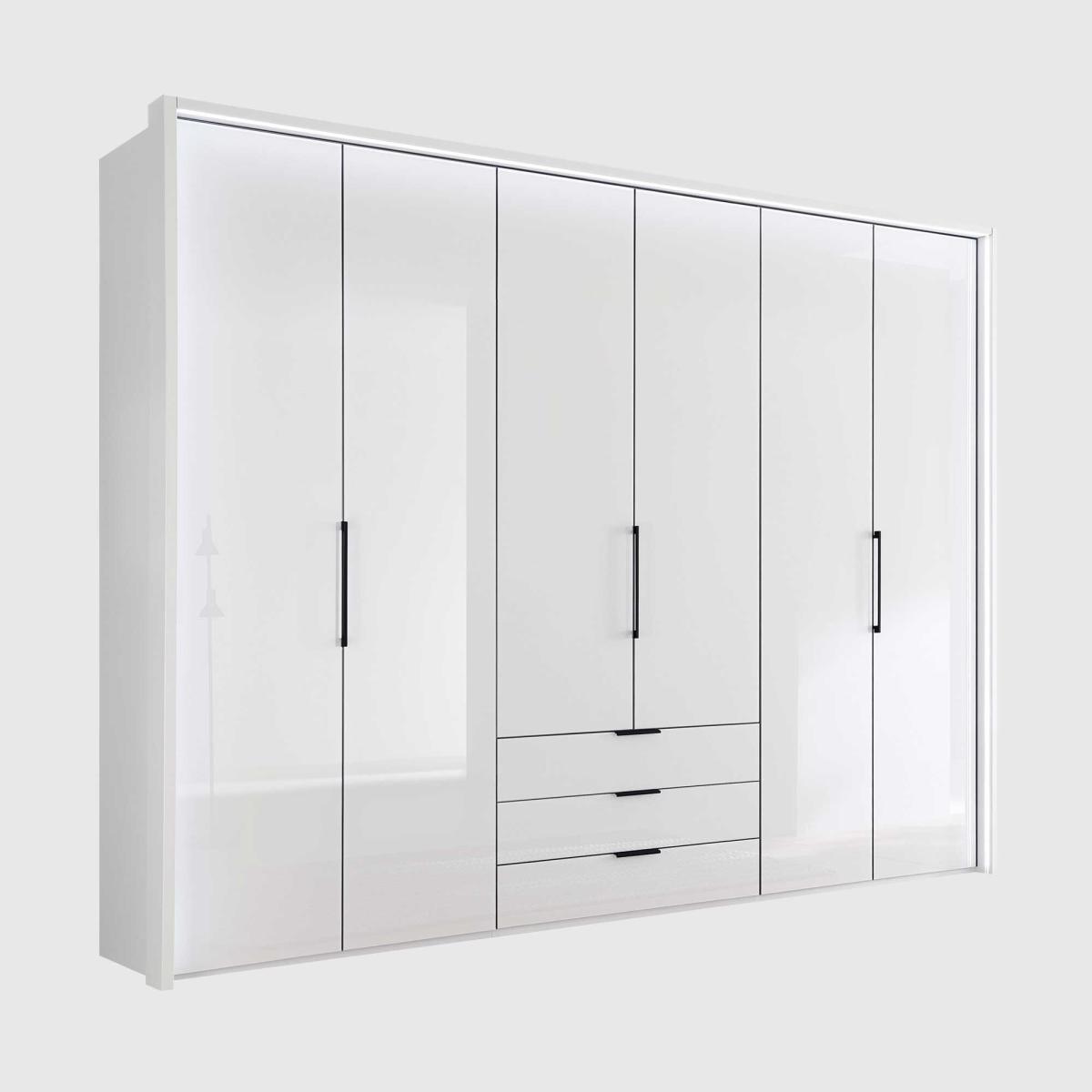Redefine your bedroom with the White Glass 6 Door 3 Drawer 300cm Hinged Wardrobe with LED Lighting - a refined fusion of contemporary design and intelligent functionality. Showcasing elegant glass-fronted doors, three generously sized drawers, and ambient integrated LED illumination, this wardrobe delivers both visual appeal and everyday practicality. The meticulously planned interior includes shelving and a hanging rail within each compartment, offering versatile, organised storage. Space-efficient bi-fold doors glide open to provide unobstructed access. Expertly crafted from premium materials, this statement piece is available in a curated selection of sophisticated finishes to seamlessly complement and elevate any interior aesthetic