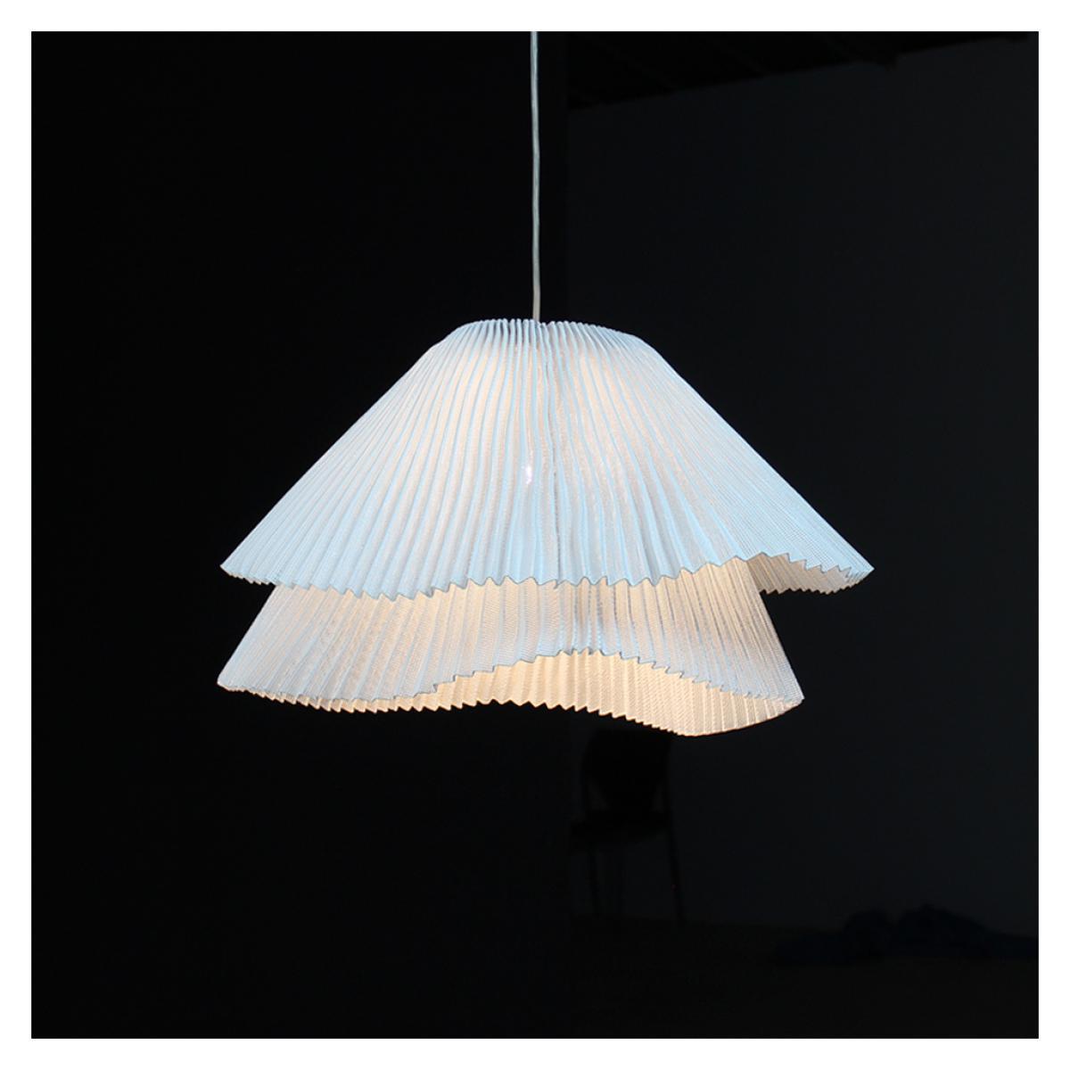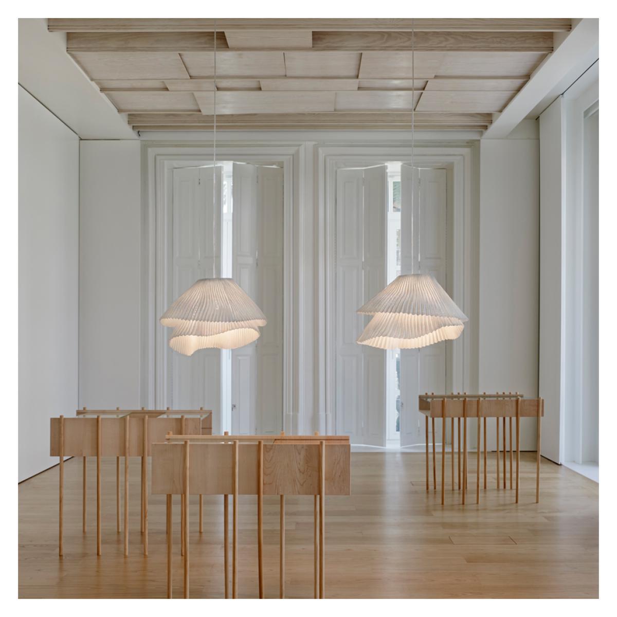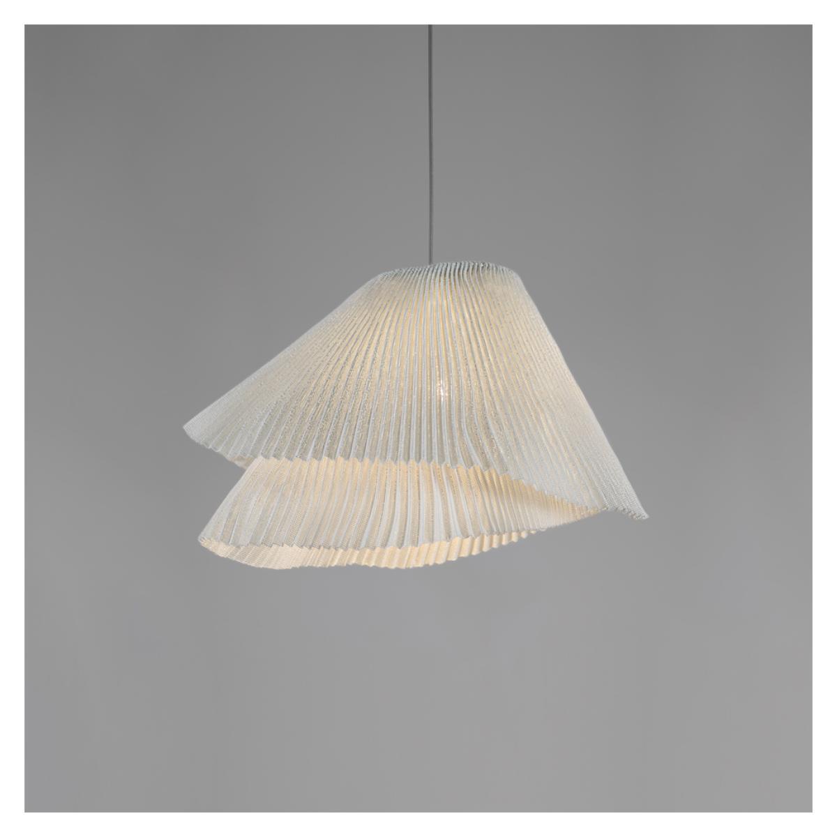 The ethereal Tempo Vivace Pendant lamp was designed by Arturo Alvarez and is crafted from an innovative woven stainless steel mesh. A textural and ambient addition to any space, the Tempo Vivace lamp is crafted in delicate pleats of painted stainless steel mesh, overlapped to form two layers that combine to diffuse and direct light to create a dynamic yet subtle ambience. Beginning with cold steel mesh, this typically resistant material is moved and folded into elegant, fluid curves using intricate techniques developed by Alvarez himself. Designed to represent one movement at different speeds, the Tempo collection also includes the Andante lamp that both contrasts and complements the Vivace perfectly. Intricately handcrafted in Spain, the Tempo Vivace Pendant lamp is painted white for a clean, defined finish adaptable to an array of surroundings. This pendant light requires an E27 max. 100W bulb (not included). Dimmable depending on bulb.