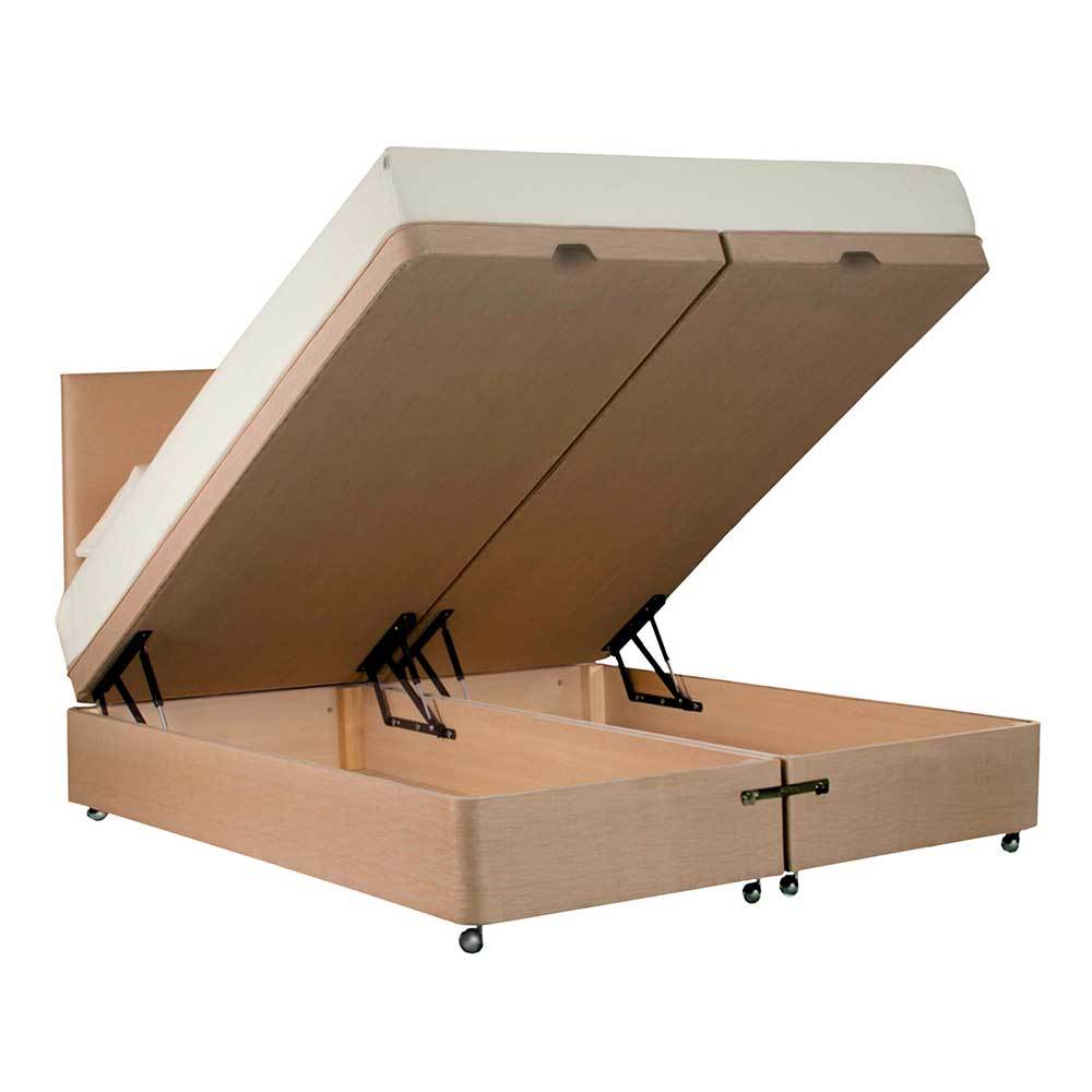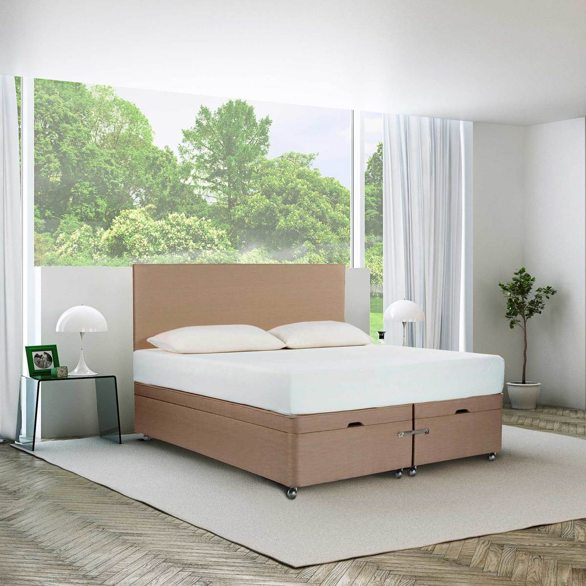 This Tempur Ardennes Divan Base is a practical addition to your home. With a gas lift mechanism, simply lift up the frame using the convenient slot handles to reveal its handy storage space beneath.;A range of textured plain materials are available for your choosing, each one sure to beautifully coordinate with a wide range of decor schemes. The above image shows the Ardennes in a wonderfully versatile neutral caramel fabric.;Complete the look by adding one of Tempur's stylish flush fitting headboards in matching materials to your order. Headboards are optional extras but fixtures and fittings for standard UK headboards are included.;All Tempur divan bases are designed to complement the entire Tempur Mattress Range.;Please note: The handles on the Ardennes have now been repositioned to sit on the upper-lid, whilst providing easier access to the storage space underneath. This was previously positioned on the lower section of the bed.;Please Note: Imagery above shows the Ardennes ottoman with plain headboard, this is not standard and comes at an additonal charge.