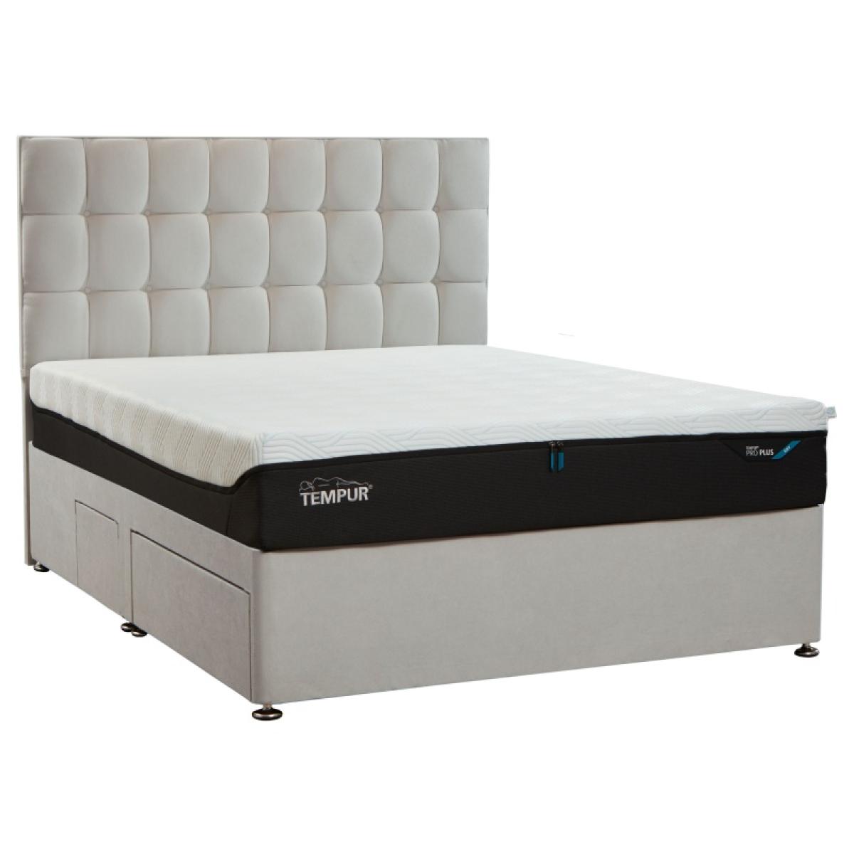 Note - Mattress and headboard pictured are not included but are available to purchase separately. The Tempur Buckingham bed base is the perfect partner for your new Tempur mattress! Crafted with meticulous attention to detail, this premium bed base features a platform top design to enhance the performance of your mattress, ensuring a restful night's sleep. The Buckingham is distinguished by its elegant upholstered finish and it's robust structure supports and extends the life of your mattress. Choose from a selection of base designs, including options with no drawer, continental drawers, and ottoman divans. You can also customise your Buckingham Divan with ease, selecting from four distinct headboard designs and 7 luxurious fabrics. Ideal for those seeking a blend of style, comfort, and functionality, the Tempur Buckingham Bed Base is a testament to Tempur's commitment to excellence in sleep innovation. KEY FEATURES: Platform Top - The base features a solid wooden top which is upholstered in fabric. This type of base will provide a supportive feel to the mattress. High-quality drawers made from hardwood timber and materials along with robust construction techniques to provide superior storage space. (Storage weight limit 15kg). Glides - Stylish silver glides support the divan base adding a contemporary, luxurious feel to any room. Available in a range of fabrics and colours. Made in the UK from FSC-certified timber. This base comes as a horizontally split base. DIMENSIONS: Single Size - W 90cm x L 190cm Double Size - W 135cm x L 190cm King Size - W 150cm x L 200cm Super King Size - W 180cm x L 200cm Base Height including glides - 38cm All screens vary in colour reproduction and whilst every effort has been made to display the colour as accurately as possible it is for guidance only.