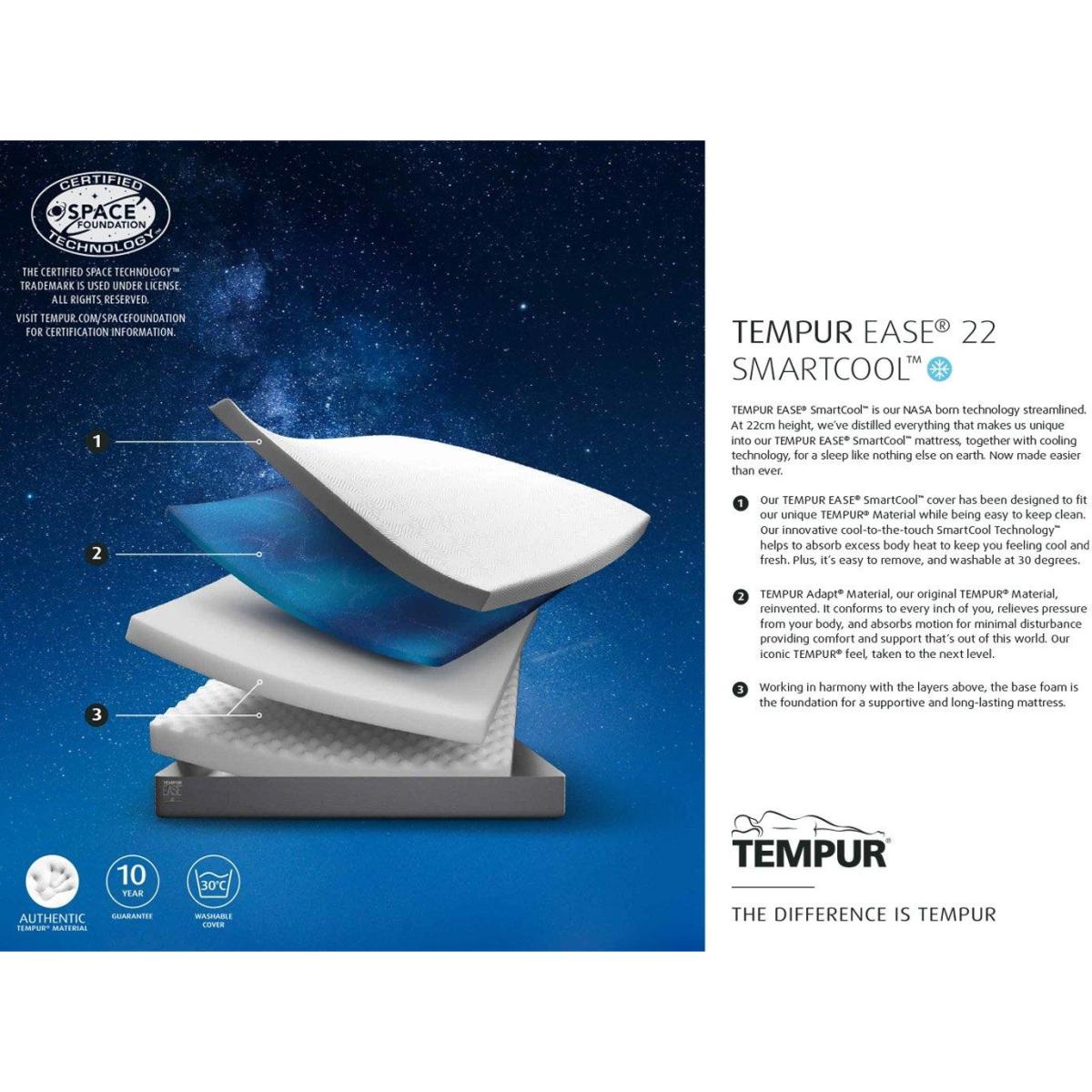 Discover personalised comfort and pressure-relieving support with the Tempur Ease 22cm Mattress. Designed using authentic TEMPUR® Material developed by NASA, this mattress gently adapts to your body’s shape, weight and temperature—delivering the perfect balance of comfort and support every night. At 22cm deep, the Tempur Ease mattress offers a medium-firm feel that suits a wide range of sleep preferences. The innovative open-cell structure promotes better airflow, helping to keep you cool and comfortable while you sleep. Plus, the sleek, zipped cover is removable and washable at 30°C, making it easy to keep your bed fresh and clean. With no need to flip or turn, and delivered rolled for added convenience, this mattress is ideal for modern lifestyles. Backed by a reassuring 10-year guarantee, the Tempur Ease 22cm Mattress is a smart investment in long-lasting sleep quality. TEMPUR Ease® For the first time ever, TEMPUR have distilled everything that makes TEMPUR® unique into its simplest and most accessible form. Standing at 22cm in height, the TEMPUR Ease® mattress brings you NASA-born technology, streamlined. At the core of the TEMPUR Ease® mattress is the unique TEMPUR Adapt® Material. Born from NASA technology, billions of ultra-sensitive cells adapt to your unique weight, shape and warmth, precisely aligning to every inch of you throughout the night, relieving pressure from your body, absorbing motion for minimal disturbance and providing comfort and support out of this world. TEMPUR's Ease cover is tailored to perfectly complement the TEMPUR Adapt® Material. It’s easy to remove and washable at 30 degrees, ensuring your mattress stays fresh and clean with minimal effort. KEY FEATURES: EASE® Super Soft Sleep Surface Orthopaedic Support TEMPUR® Quality Comfort Fillings - Memory Foam Support System - TEMPUR Adapt® Material Firmness Rating - Medium Firm Delivered rolled for easy set-up 10 Year Manufacturer's Guarantee DIMENSIONS: Mattress Depth - 22cm Euro Small Single - L 200cm x W 75cm (Weight - 15 kg) Euro Single - L 200cm x W 90cm (Weight - 17 kg) Double - L 190cm x W 135cm (Weight - 25 kg) King - L 200cm x W 150cm (Weight - 29 kg) Super King - L 200cm x W 180cm (Weight - 34kg)