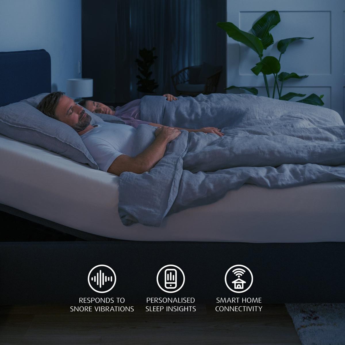 The all-new TEMPUR Ergo™ Smart Base utilises integrated Sleeptracker®-AI sensors (without microphones) to detect you and your partner’s micro-vibrations from snoring. If snoring is detected, the bed automatically responds, elevating your upper body 12 degrees – a position to help reduce snoring. The TEMPUR Ergo™ Smart Base also provides personalised insights based on your sleep with customised coaching in an easy-to-use app. Experience your most restful sleep ever, with the smart response to snoring. LIFESTYLE ADJUSTABILITY AND ZERO-G BENEFIT The TEMPUR Ergo™ Smart Base uses advanced technology to suit your lifestyle when you are awake. It is fully adjustable,elevating your comfort so you can find your most suitable position in bed for relaxing, reading or watching TV – all at the touch of a button. By gently elevating your legs, the TEMPUR® Zero-G preset is designed to help simulate circulation throughout your body, providing an experience of complete weightless relaxation that will leave you feeling refreshed and rejuvenated. PERSONALISED SLEEP, DAILY SLEEP SCORE & SLEEP INSIGHTS Discover the power of intelligent sleep technology and advanced and accurate analytics. The TEMPUR Ergo™ Smart Base provides personalised insights based on your sleep with customised coaching in an easy-to-use app. The TEMPUR Ergo™ Smart Base summarises every night with a Sleep Quality Metric, along with a comprehensive picture of different sleep phases. It then provides sleep strategies to help you get more out of your sleep. Each morning, you’ll wake up to a personalised sleep report that will help you understand your stages of light sleep, deepsleep and REM, and potentially time spent awake. Having a nightly Sleep Quality Metric makes it easy to see at a glance if you are trending toward better sleep over time. The app reports the nightly score to you the next day and shows you how it compares to previous nights from the previous week, month or year. SMART ALARM The TEMPUR® Sleeptracker® app features a smart wake-up alarm designed to trigger when your lightest phase of sleep has been identified. When using a TEMPUR Ergo™ Smart Base,the smart alarm feature offers your choice of wake-up music or vibrations to be set within a selected window of time. SLEEP SMART WITH A BED CONNECTED TO YOUR HOME Compatible with Amazon Alexa, the TEMPUR Ergo™ Smart Base helps you start and end each day right. You can adjust the position of your bed, receive your daily sleep report and hear customised sleep tips. Lie back and enjoy personalised sleep insights and smart home compatibility thanks to voice control integrated into your TEMPUR Ergo™ Smart Base. KEY FEATURES: Smooth flat woven fabric finish in a choice of serene shades Fully adjustable, smart bed base Split base gives each sleeper complete control Snore detection, voice control and tailored sleep analysis Relax in luxury with three massage intensity settings Convenient USB ports keep you connected Spindle-style legs in your choice of colours Rest easy with Tempur's 10-year guarantee DIMENSIONS: Comes in 6 packages. Assembly is required. Length - 213cm Width - King 150cm or Super King 180cm Foot-end height - 39cm Side rail height - 27cm Floor to bottom of side rail - 12cm All screens vary in colour reproduction and whilst every effort has been made to display the colour as accurately as possible it is for guidance only.