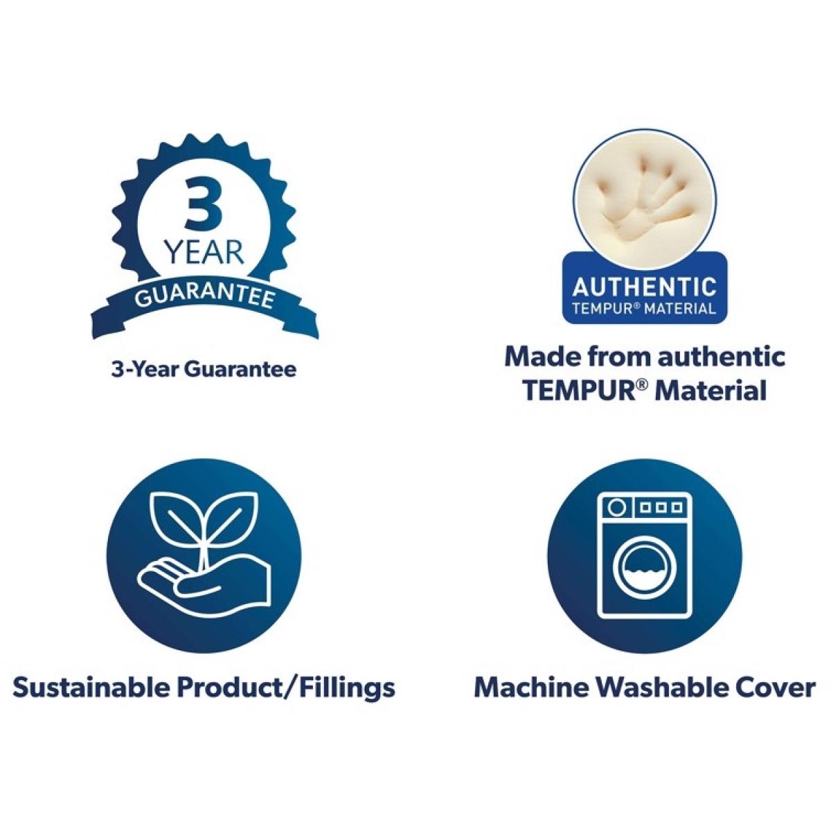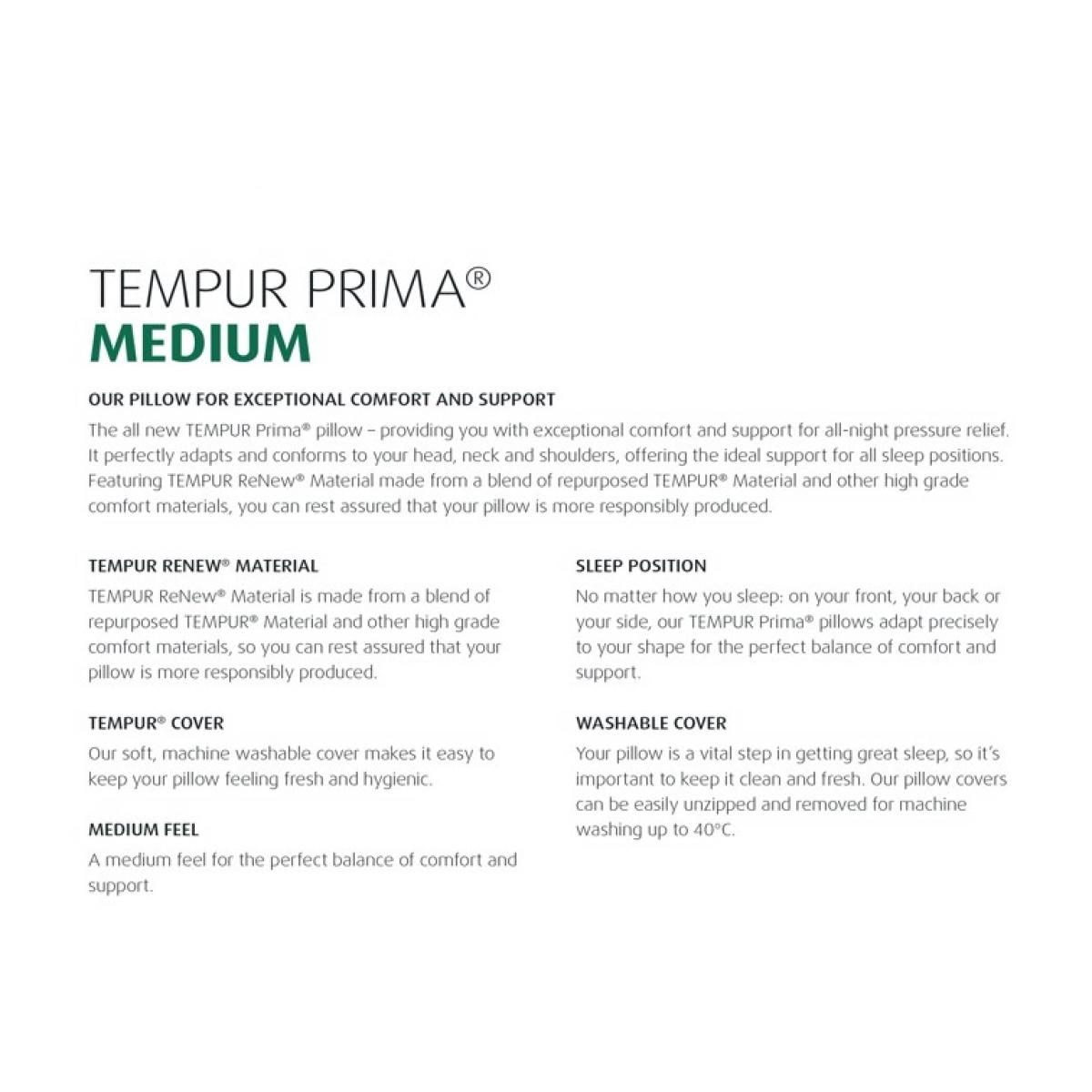 The all new TEMPUR Prima® Smart. Cool™ pillow – providing you exceptional comfort and support for all-night pressure relief. It perfectly adapts and conforms to your head, neck and shoulders, offering the ideal support for all sleep positions. Featuring TEMPUR Re. New® Material, made from a blend of repurposed TEMPUR® Material and other high grade comfort materials, you can rest assured that your pillow is more responsibly produced. For extra cooling comfort, TEMPUR's cool-to-the-touch cover keeps you feeling cool and fresh. KEY FEATURES: Size - W 75cm x L 50cm Medium Firmness - Good all rounder for front, side or back sleepers. Recognised by NASA and certified by the Space Foundation Contains Tempur Renew material made from repurposed Tempur material making this product responsibly produced Suitable for all sleeping positions Removable washable cover