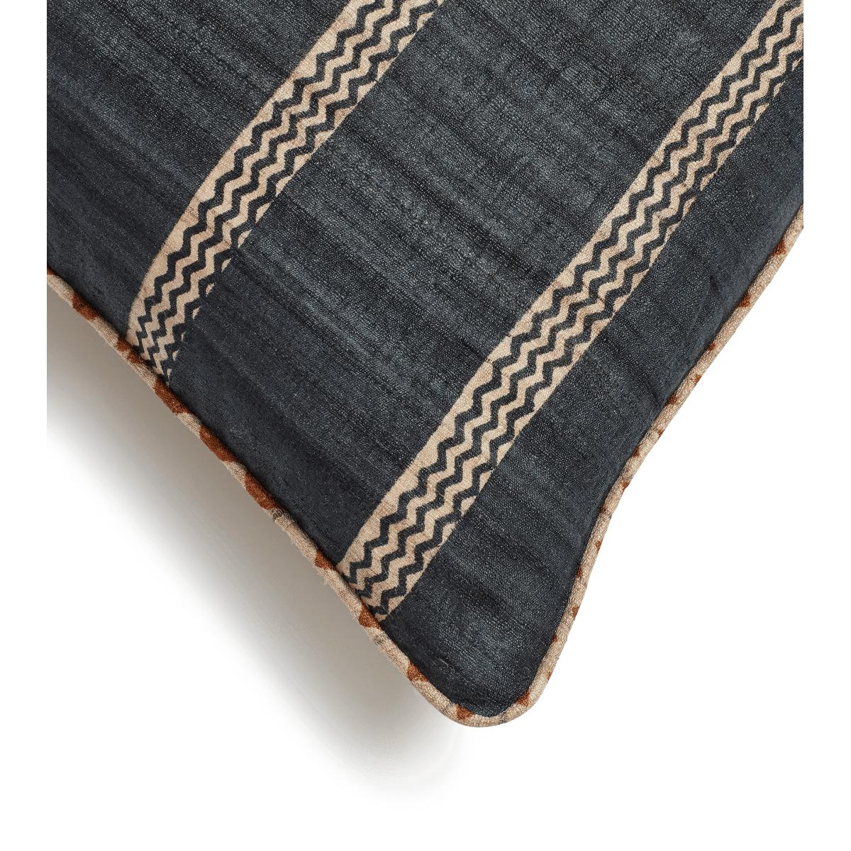 This bold range focuses on craftsmanship and pattern. The handwoven fabric is made from natural tussar silk, cultivated in the Indian states that have been producing the yarn for centuries. The yarn is then hand spun, hand dyed, and hand block printed with a zigzag pattern. The deep indigo and earthy ochre perfectly complement one another on each side of the cushion cover.