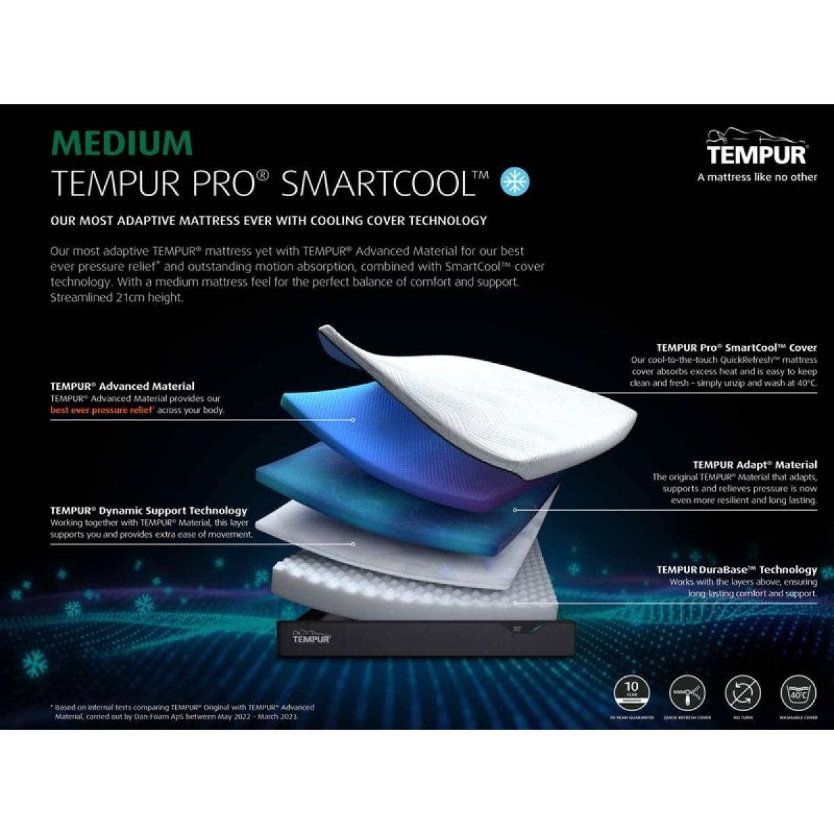 Our most adaptive TEMPUR® mattress yet with TEMPUR® Advanced Material for our best ever pressure relief* and outstanding motion absorption, combined with Smart. Cool™ cover technology. The TEMPUR Pro® Smart. Cool™ Medium is a medium mattress feel and at 21cm in mattress height it offers conforming comfort and body support. KEY FEATURES: Medium - Good all rounder for front, side or back sleepers. The only mattress brand recognised by NASA¹ and certified by the Space Foundation² Features new cutting edge Tempur Advanced Material designed to provide the ultimate support and pressure relief Removable Pro Smart Cool cover to keep you cool and refreshed during the night and is easily removed to wash at 40°C Hypo-allergenic mattress that is sterilised and dust free, therefore ideal for allergy sufferers and people with asthma Free 10 year guarantee for total peace of mind MATTRESS DIMENSIONS: Small Single Long – W 75cm (2ft6) x L 200cm (6ft6) x D 21cm (8.2’’) – Weight: 20kg Single – W 90cm (3ft) x L 190cm (6ft3) x D 21cm (8.2’’) – Weight: 23kg Long Single – W 90cm (3ft) x L 200cm (6ft6) x D 21cm (8.2’’) – Weight: 24kg Small Double – W 120cm (4ft) x L 190cm (6ft3) x D 21cm (8.2’’) – Weight: 30kg Small Double Long - W 120cm (4ft) x L 200cm (6ft6) x D 21cm (8.2’’) – Weight: 31kg Double – W 135cm (4ft6) x L 190cm (6ft3) x D 21cm (8.2’’) – Weight: 34kg Long Double - W 135cm (4ft6) x L 200cm (6ft6) x D 21cm (8.2’’) – Weight: 35kg King Size – W 150cm (5ft) x L 200cm (6ft6) x D 21cm (8.2’’) – Weight: 39kg European King Size – W 160cm (5ft3) x L 200cm (6ft6) x D 21cm (8.2’’) – Weight: 41kg Super King Size – W 180cm (6ft) x L 200cm (6ft6) x D 21cm (8.2’’) – Weight: 46kg Small Emperor – W 200cm (6ft6) x L 200cm (6ft6) x D 21cm (8.2’’) – Weight: 50kg *Based on internal tests comparing TEMPUR® Original with TEMPUR® Advanced Material, carried out by Dan-Foam Ap S between May 2022 – March 2023. ¹ The company and its products are recognised by NASA. At a joint press conference on May 6, 1998, NASA recognised TEMPUR®'s outstanding achievements in adapting the original NASA technology for everyday use and improving the quality of life for humankind. ² Visit tempur.com/spacefoundation for certification information.