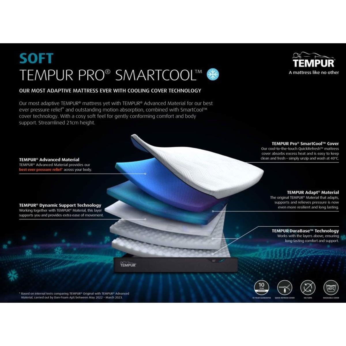 Our most adaptive TEMPUR® mattress yet with TEMPUR® Advanced Material for our best ever pressure relief* and outstanding motion absorption, combined with Smart. Cool™ cover technology. The TEMPUR Pro® Smart. Cool™ Soft is a cosy soft mattress feel and at 21cm in mattress height it offers conforming comfort and body support. KEY FEATURES: Soft - Good for side sleepers. The softest level of support. The only mattress brand recognised by NASA¹ and certified by the Space Foundation² Features new cutting edge Tempur Advanced Material designed to provide the ultimate support and pressure relief Removable Pro Smart Cool cover to keep you cool and refreshed during the night and is easily removed to wash at 40°C Hypo-allergenic mattress that is sterilised and dust free, therefore ideal for allergy sufferers and people with asthma Free 10 year guarantee for total peace of mind MATTRESS DIMENSIONS: Small Single Long – W 75cm (2ft6) x L 200cm (6ft6) x D 21cm (8.2’’) – Weight: 20kg Single – W 90cm (3ft) x L 190cm (6ft3) x D 21cm (8.2’’) – Weight: 23kg Long Single – W 90cm (3ft) x L 200cm (6ft6) x D 21cm (8.2’’) – Weight: 24kg Small Double – W 120cm (4ft) x L 190cm (6ft3) x D 21cm (8.2’’) – Weight: 30kg Small Double Long - W 120cm (4ft) x L 200cm (6ft6) x D 21cm (8.2’’) – Weight: 31kg Double – W 135cm (4ft6) x L 190cm (6ft3) x D 21cm (8.2’’) – Weight: 34kg Long Double - W 135cm (4ft6) x L 200cm (6ft6) x D 21cm (8.2’’) – Weight: 35kg King Size – W 150cm (5ft) x L 200cm (6ft6) x D 21cm (8.2’’) – Weight: 39kg European King Size – W 160cm (5ft3) x L 200cm (6ft6) x D 21cm (8.2’’) – Weight: 41kg Super King Size – W 180cm (6ft) x L 200cm (6ft6) x D 21cm (8.2’’) – Weight: 46kg Small Emperor – W 200cm (6ft6) x L 200cm (6ft6) x D 21cm (8.2’’) – Weight: 50kg *Based on internal tests comparing TEMPUR® Original with TEMPUR® Advanced Material, carried out by Dan-Foam Ap S between May 2022 – March 2023. ¹ The company and its products are recognised by NASA. At a joint press conference on May 6, 1998, NASA recognised TEMPUR®'s outstanding achievements in adapting the original NASA technology for everyday use and improving the quality of life for humankind. ² Visit tempur.com/spacefoundation for certification information.
