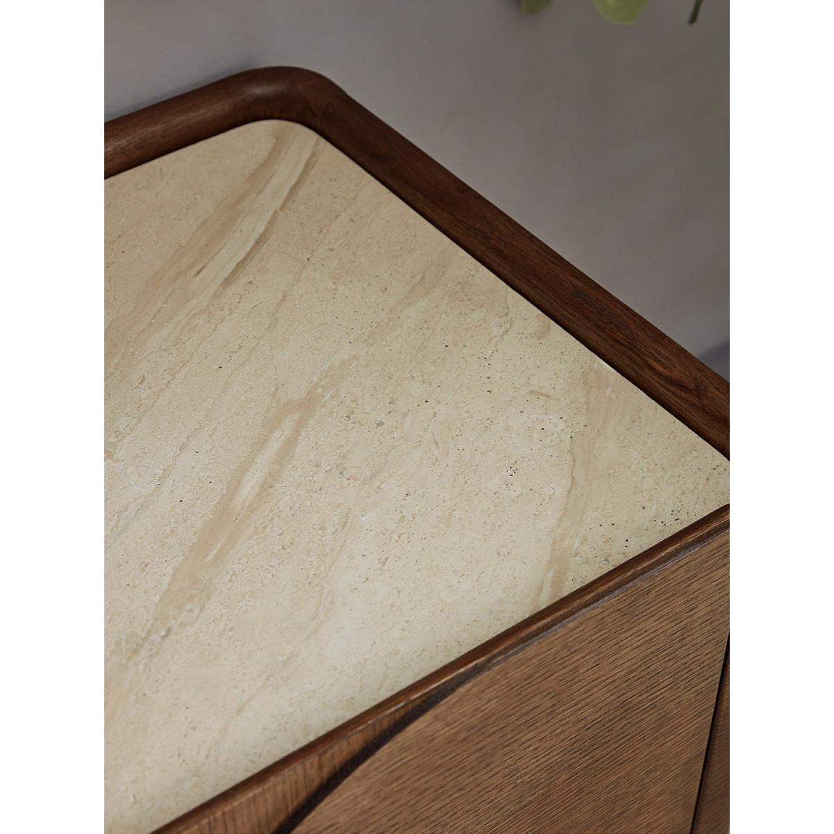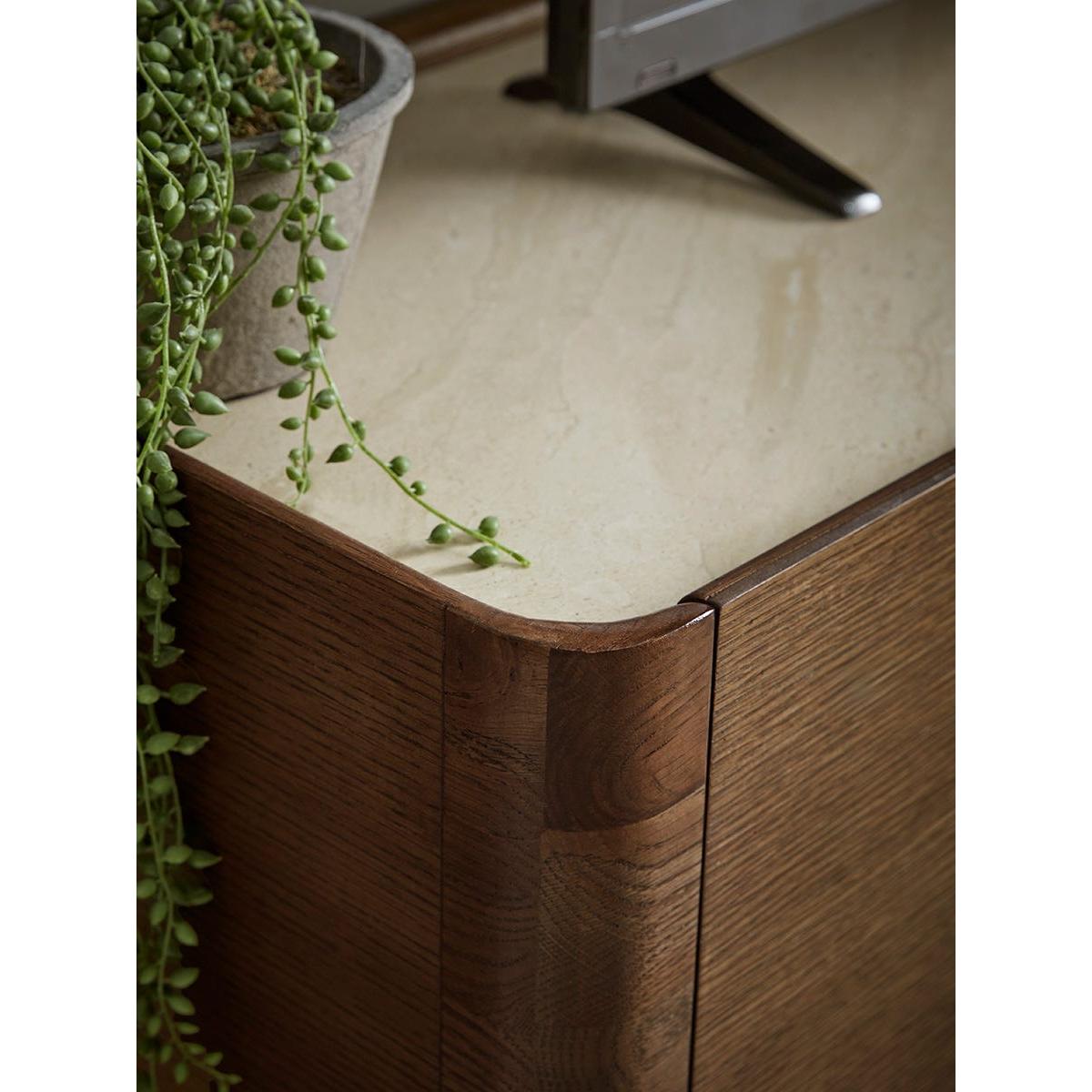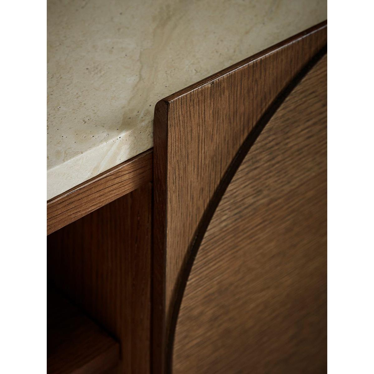 Two cupboards with raised semi circles on the doors sit either side of an open shelf to create our Tena Media Unit. Crafted from materials of dark wood with a light marble top, a striking contrast is created, making this sideboard the perfect addition to a modern interior scheme. Dress this sideboard with accessories from our Industrial trend for a modern and sleek finish.