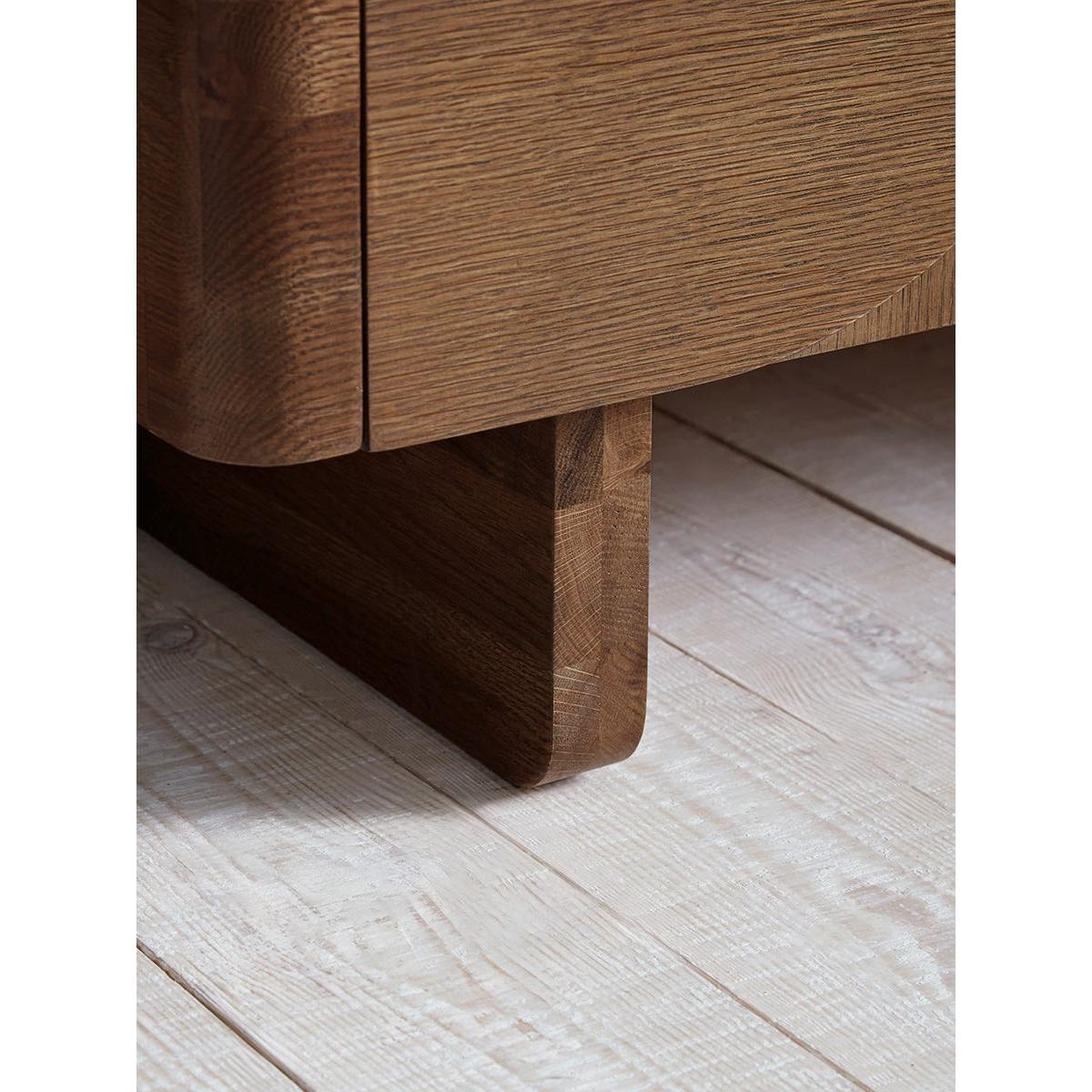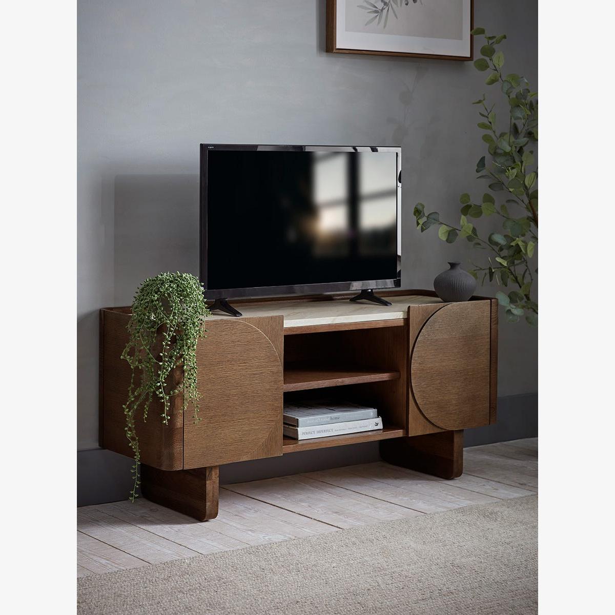 I’m really taken with this Tena console for its clean lines and subtle curves - the rich walnut finish brings warmth without overwhelming a room. It sits comfortably in Scandi-inspired schemes as well as more contemporary or mid-century settings, and its low height means it won’t dominate a smaller living area. For styling, use the open shelf to display a few art books and a small sculptural object, then tuck remotes or cables behind the doors to keep things neat. A trailing plant on one side balances the symmetry of the round doors, and a simple framed print or mirror hung just above will draw the eye upwards and tie the look together.