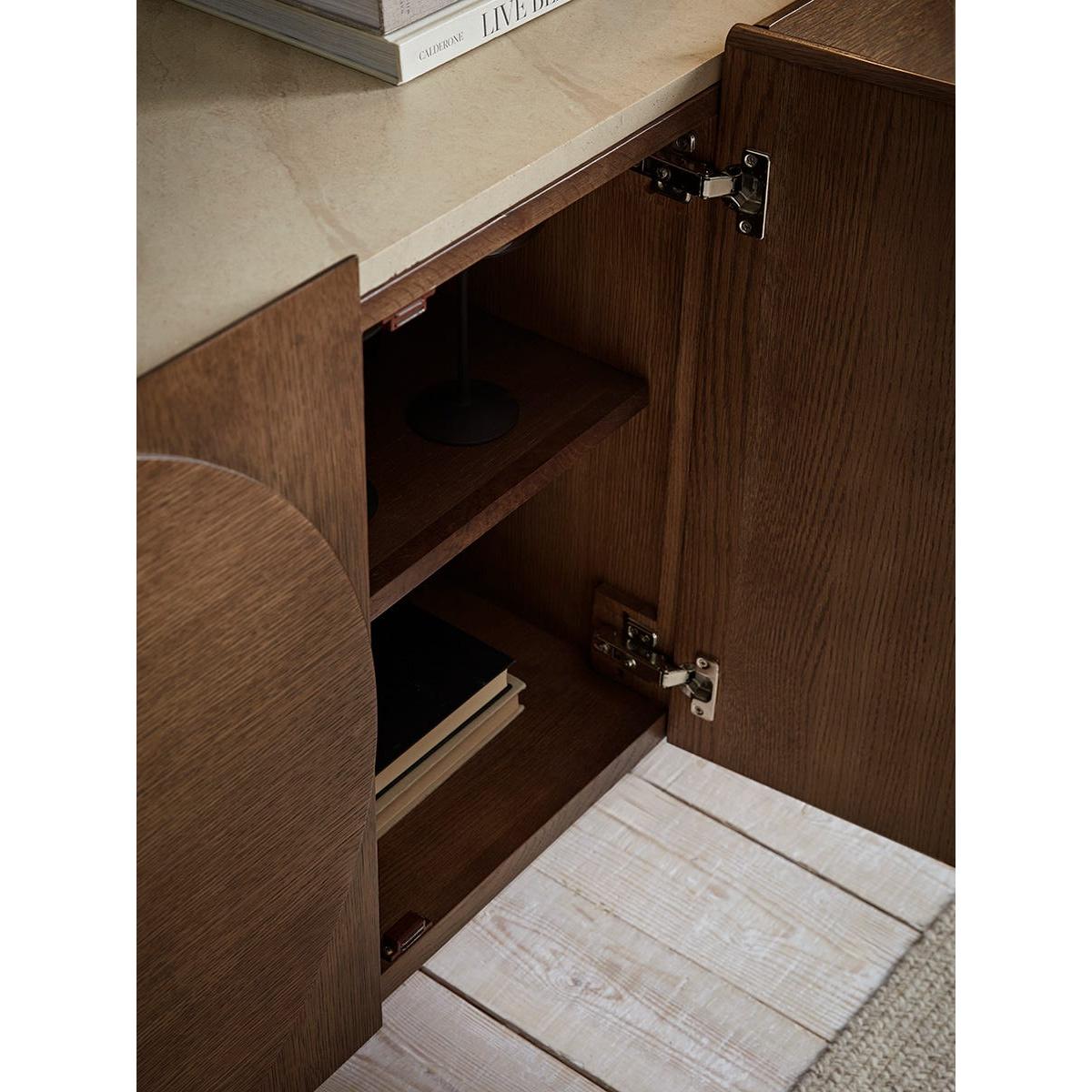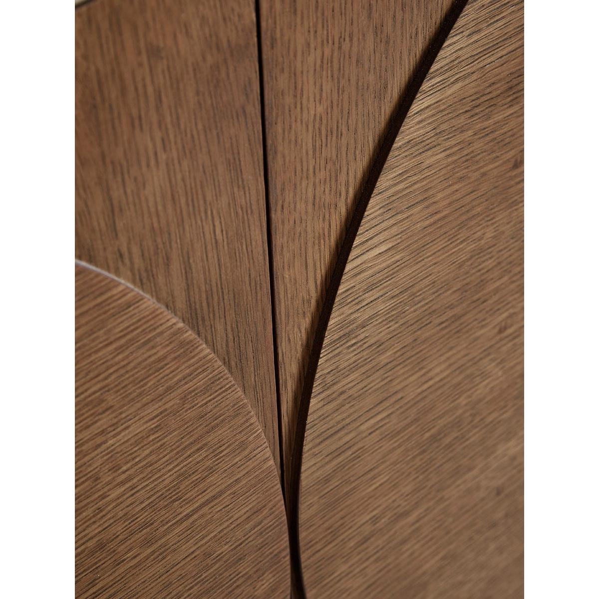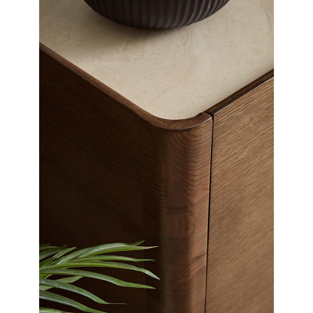 Crafted from a dark wood, our Tena sideboard is subtly brightened with a light marble effect top, creating a beautiful contrast to the moodier wood. Four doors with semi circles on each door conceal two cupboards with one shelf in the centre, perfect for keeping your home looking tidy and clutter free. Dress this sideboard with accessories from our Industrial trend for a modern and sleek finish.