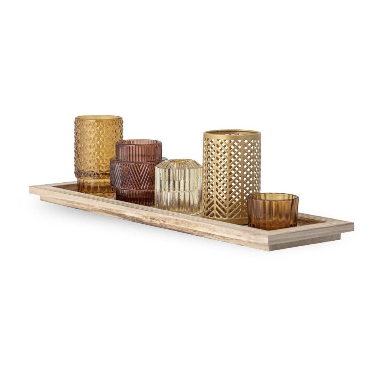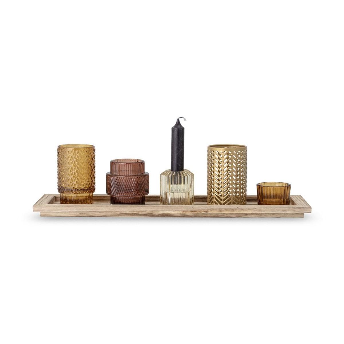 Mix things up with the Tenby 5 piece candle holder and vase set. Note the ribbed, raised and cut-out details on each glass piece, balanced by the soft tints of amber and browns. The Tenby will add depth to any living space.