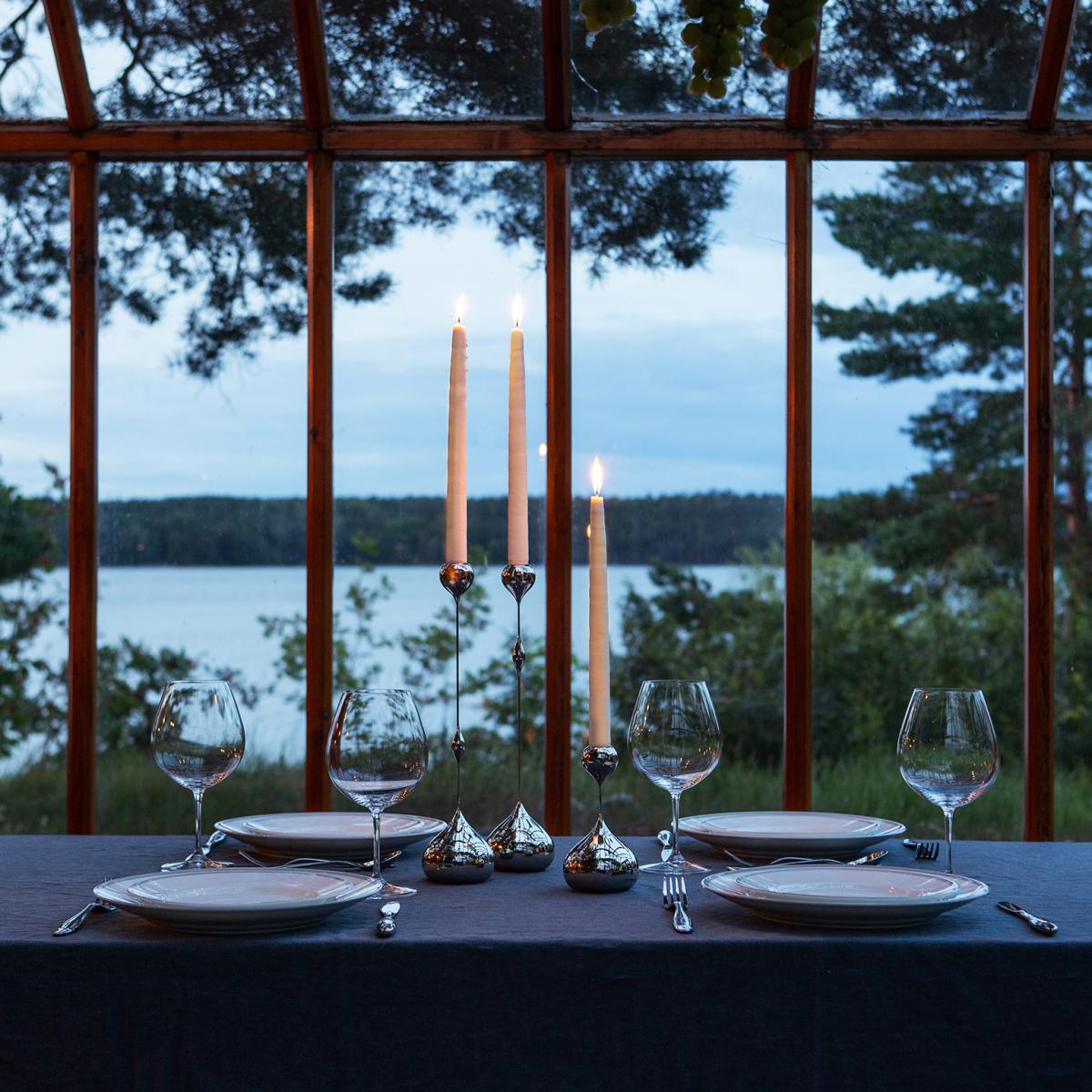 I love this candle holder for its sleek, modern silhouette and understated appeal. Its low, rounded base makes it versatile enough to sit comfortably on side tables, mantels, or dining tables without overwhelming the space. The nickel finish lends a subtle sheen, working well in contemporary, minimalist, or industrial interiors, but it also complements more eclectic styles when paired with textured or colourful accessories. For practical styling, try grouping it with other metallic or matte objects to create visual interest, or use it solo as a statement piece. It's particularly effective with taper candles, which can add a warm glow and elevate a simple tablescape or shelf display.