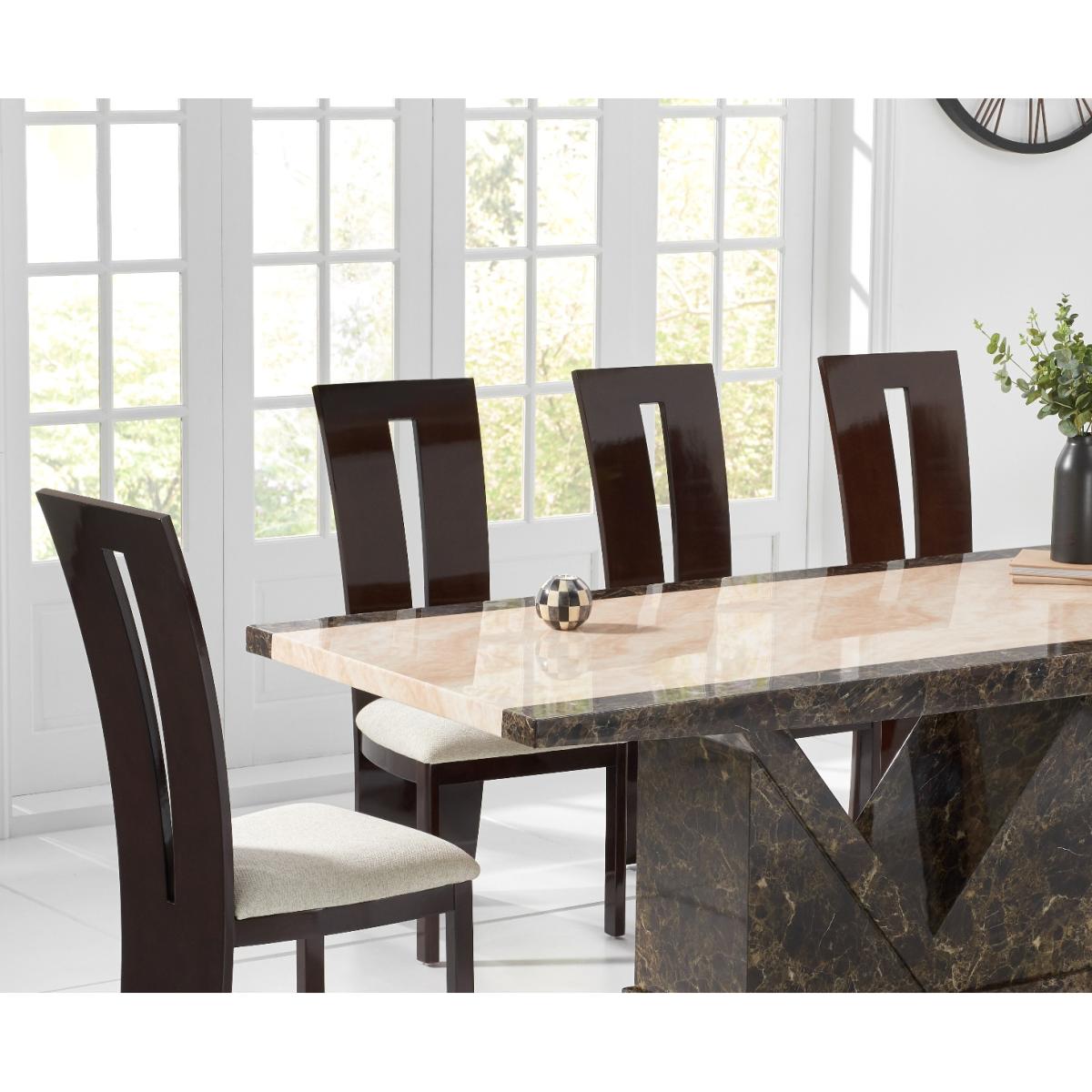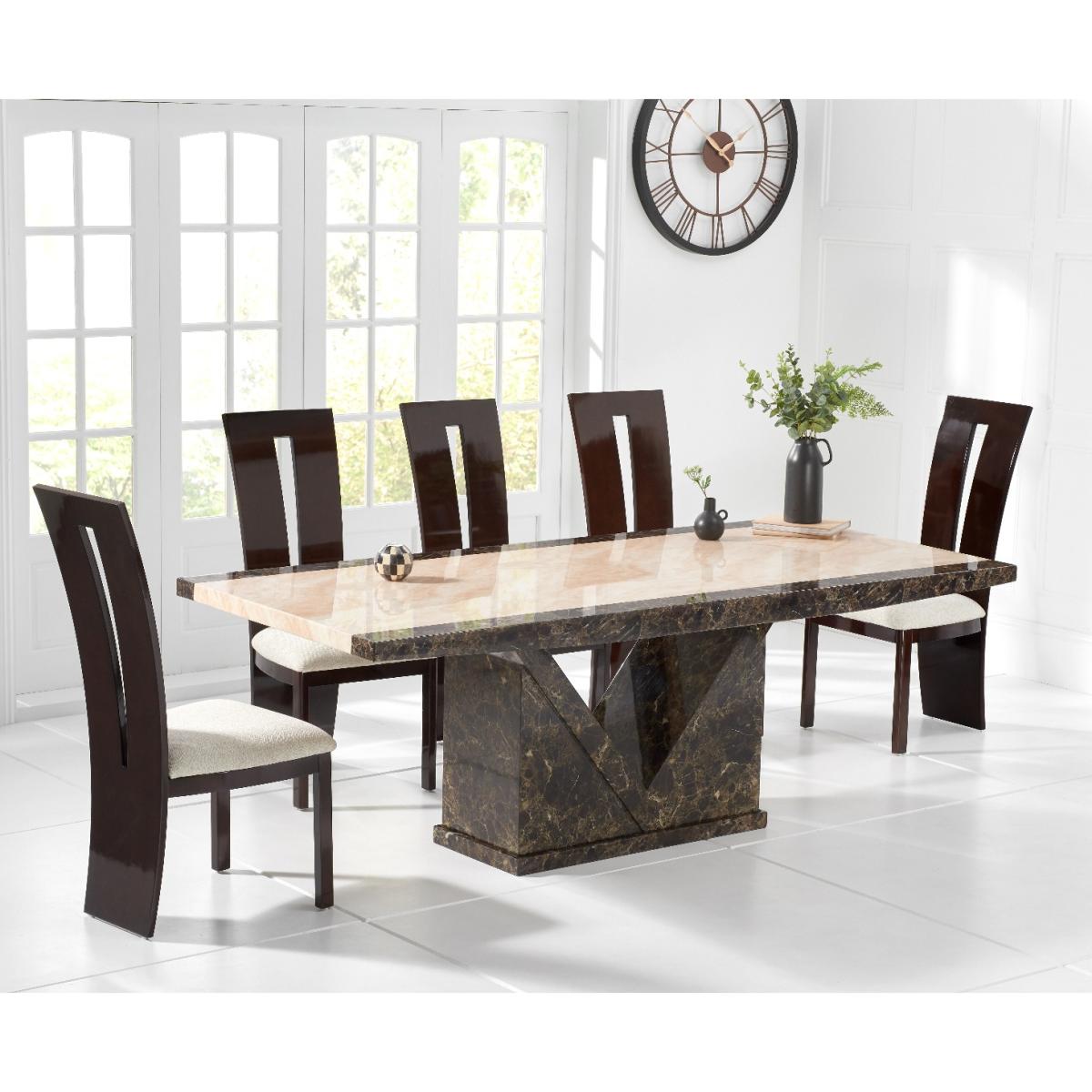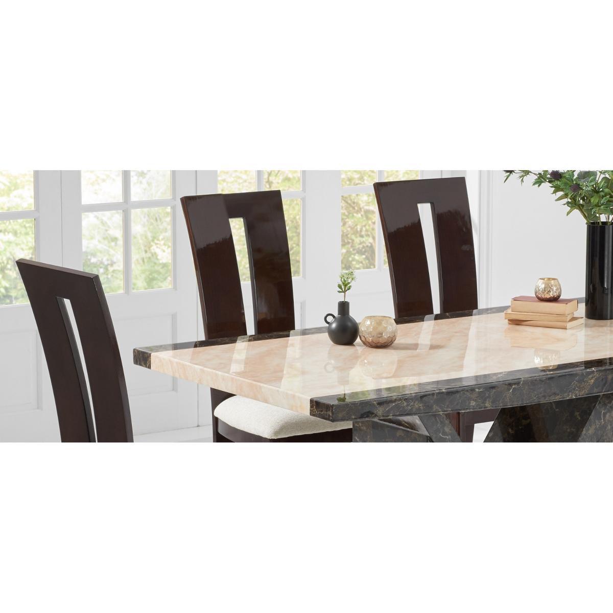 The Tenore 220cm Marble Effect Table brings distinct contemporray style to every occasion. Matched beautifully with our solid wood and fabric Verbier Chairs, the large marble effect dining table makes a lasting impression in any home. Uniquely stylish large marble effect dining table. Seats 10 people comfortably. Distinct cut-out V design for a stunning contemporary look. Complete with a smooth two-toned high gloss finishUV resistant. Heat resistant to 50 degrees Celsius Additional Measurements:Table Top Thickness: 8cm. Pedestal Width: 40cm. Pedestal Depth: 90cm. Height to Underside of Table Top: 68cmChairs Contemporary solid wood and soft-touch woven fabric dining chairs. Sleek modern design with floor-length backrests. High gloss finish on dark wood legs and frames complements the marble dining table Black chairs feature grey soft-touch woven fabric seat pad Brown chairs feature cream soft-touch woven fabric seat padPLEAS. E NOTE: This item is eligible for GROUND FLOOR DELIVERY ONLY