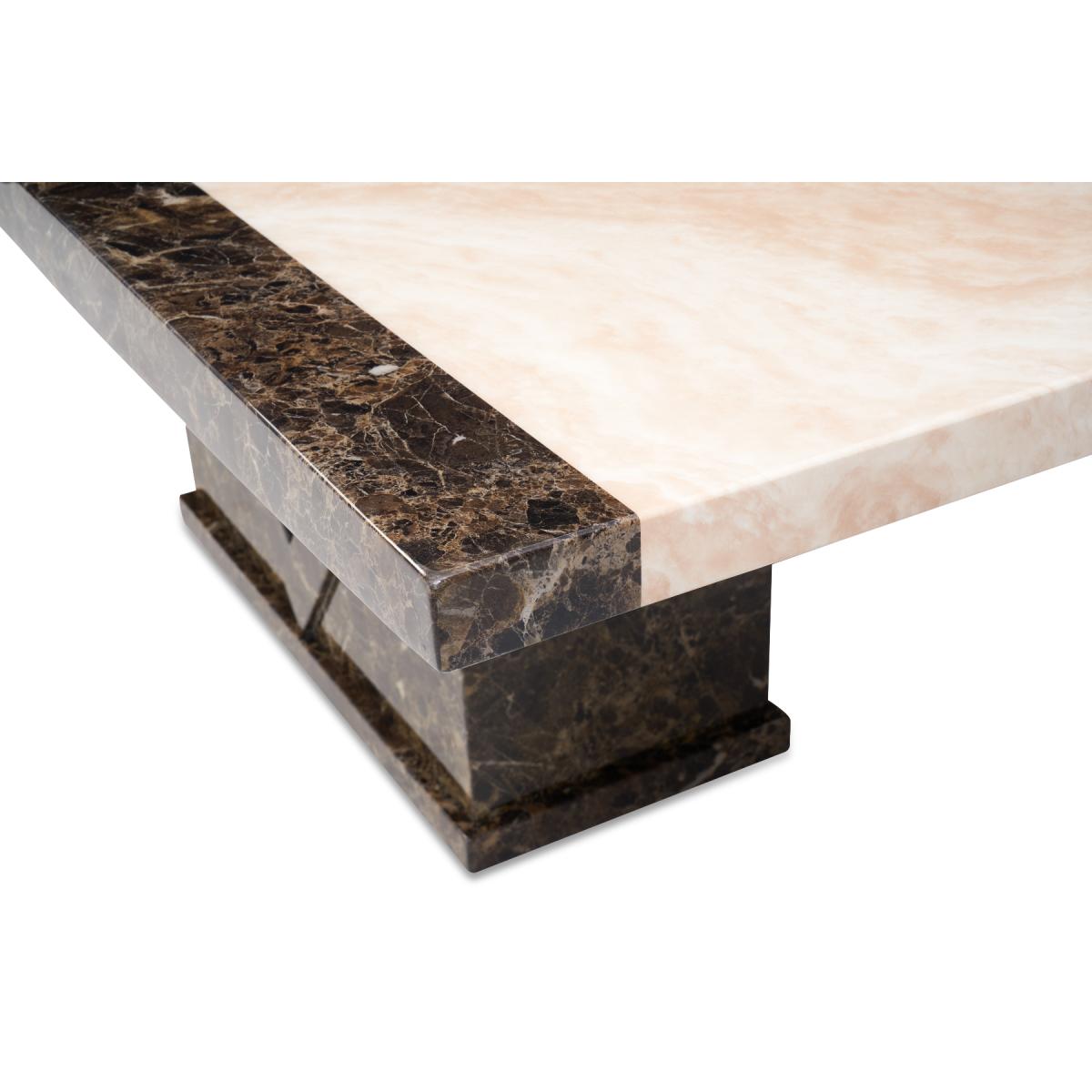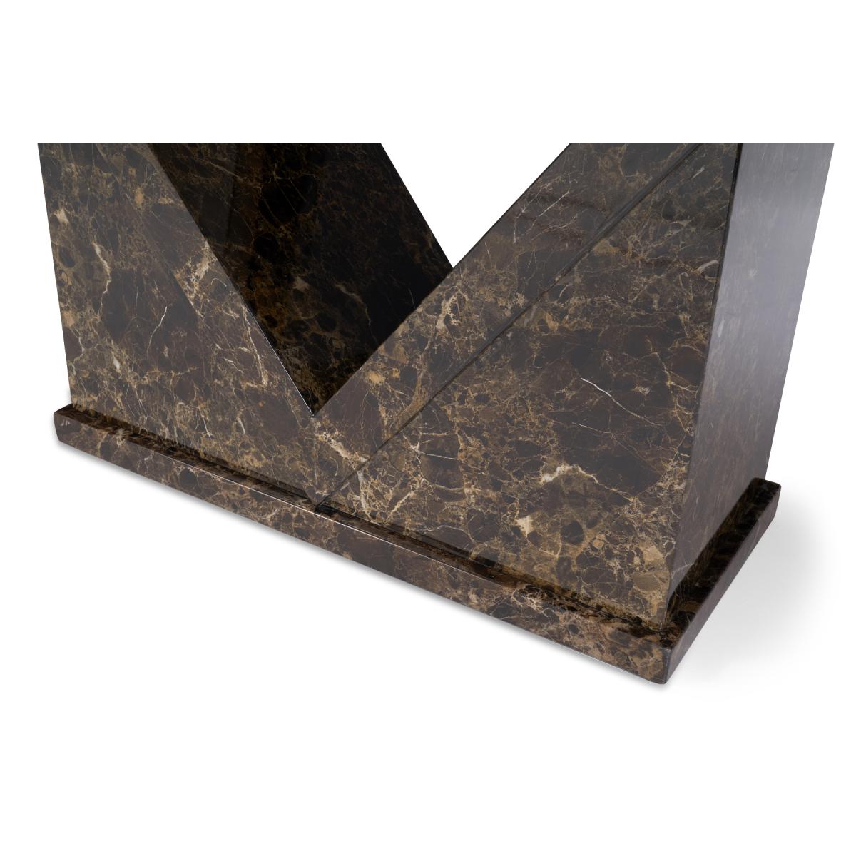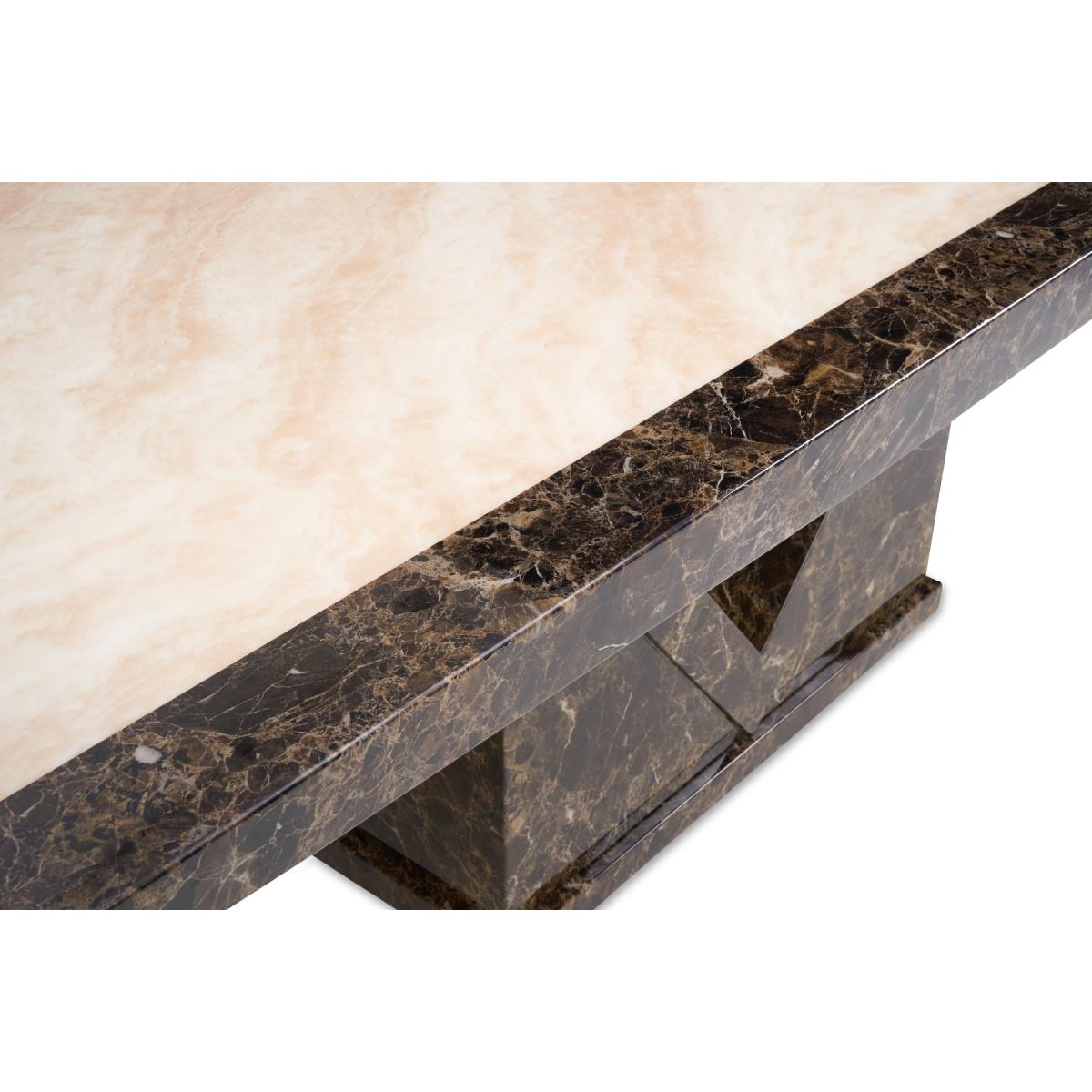 The Tenore 220cm Marble Effect Table brings distinct contemporray style to every occasion. Matched beautifully with our solid wood and fabric Verbier Chairs, the large marble effect dining table makes a lasting impression in any home. Uniquely stylish large marble effect dining table. Seats 10 people comfortably. Distinct cut-out V design for a stunning contemporary look. Complete with a smooth two-toned high gloss finishUV resistant. Heat resistant to 50 degrees Celsius Additional Measurements:Table Top Thickness: 8cm. Pedestal Width: 40cm. Pedestal Depth: 90cm. Height to Underside of Table Top: 68cmChairs Contemporary solid wood and soft-touch woven fabric dining chairs. Sleek modern design with floor-length backrests. High gloss finish on dark wood legs and frames complements the marble dining table Black chairs feature grey soft-touch woven fabric seat pad Brown chairs feature cream soft-touch woven fabric seat padPLEAS. E NOTE: This item is eligible for GROUND FLOOR DELIVERY ONLY
