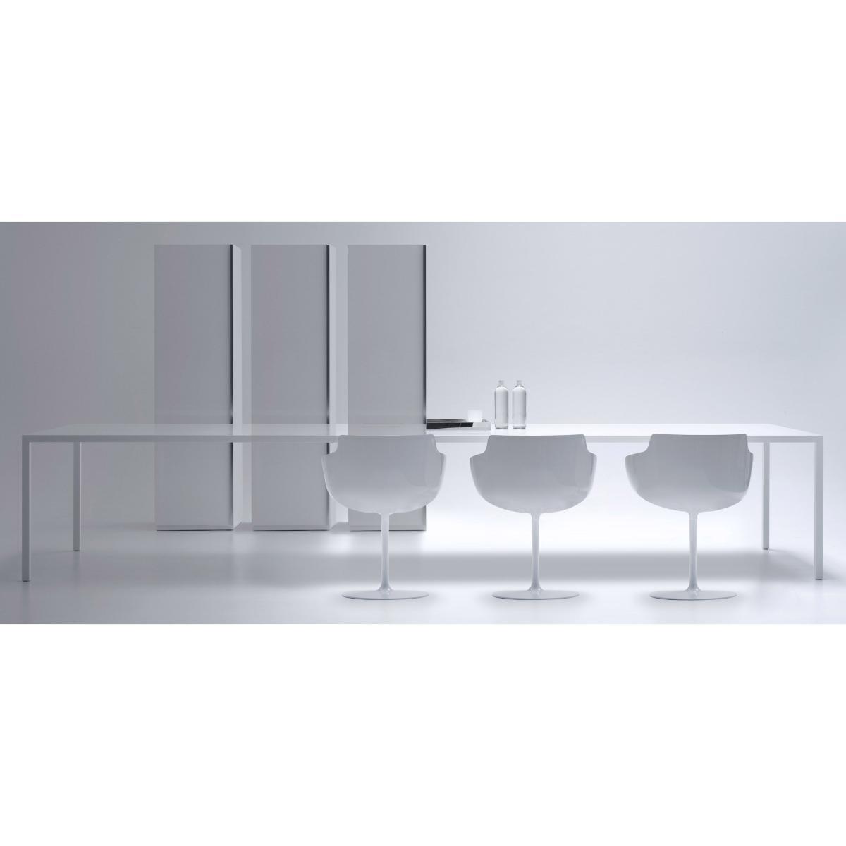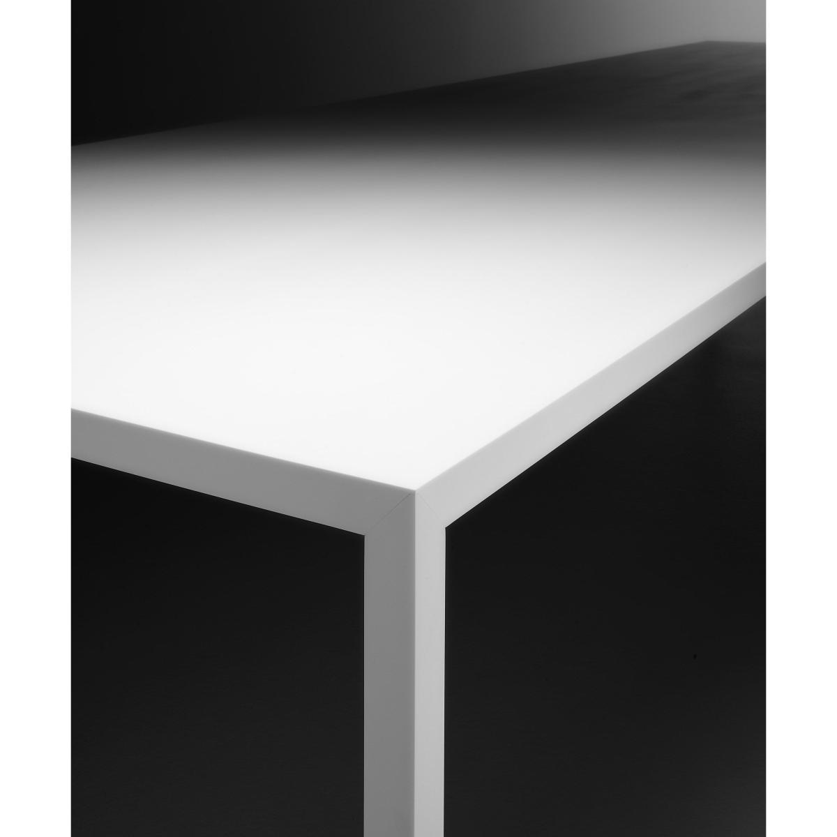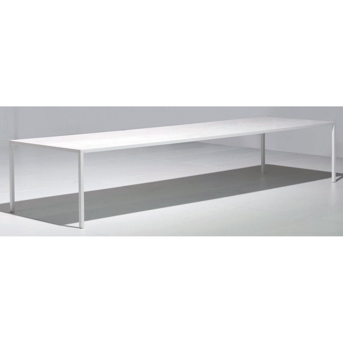 The legs and the tabletop are entirely clad with a plate of white acrylic resin. Beautiful monochromatic and single-material finish – the essence of the design! Tense table is adjustable to a variety of dimensions and thus can meet all your usage requirements at domestic, office or contract situations. It can reach exceptional dimensions (to 4. 8 m in length) – ideal for large rooms like assembly halls or lofts. The ultra-thin plate (3. 5 cm) consists of a polystyrene filling between two aluminium sheets, all clad with acrylic resin. This innovative structure allows producing large-sized table tops that remain perfectly even and are yet incredibly light and thin. Even if it is of such a thrilling size, the Tense table leaves you with an extraordinary impression of lightness! It fits to any decoration style and its minimalist design is suitable for modern as well as more classical interiors!.