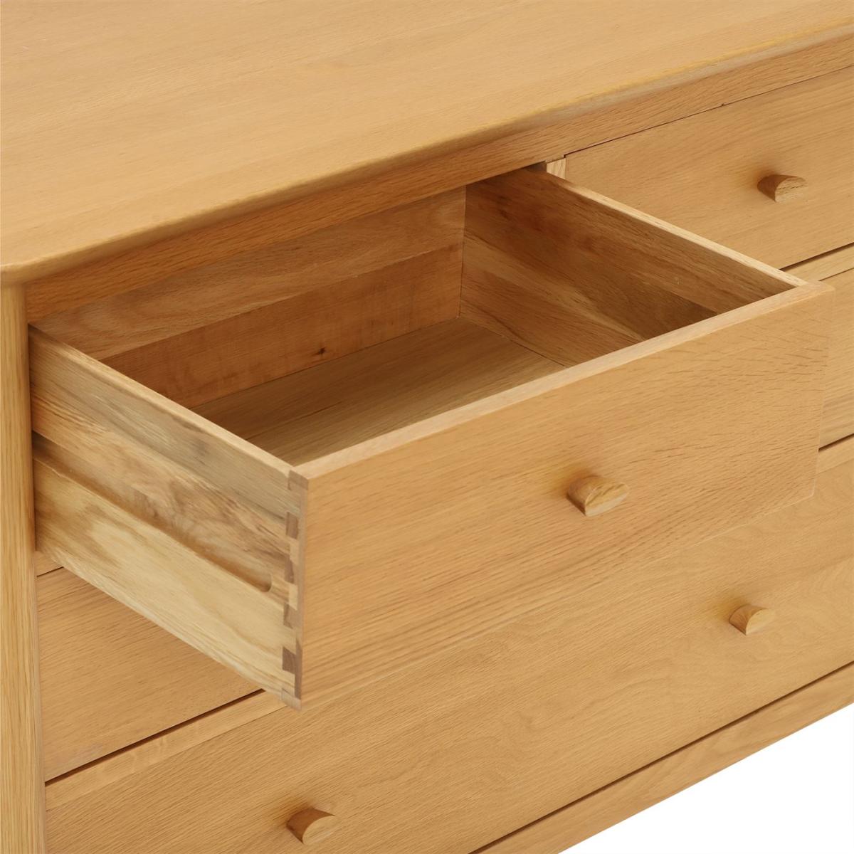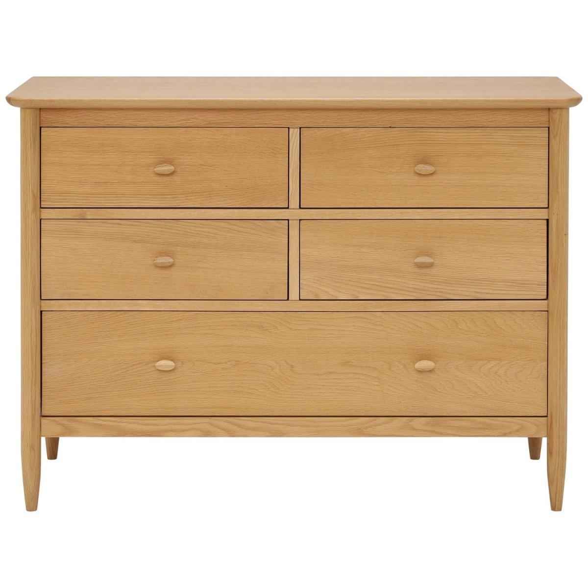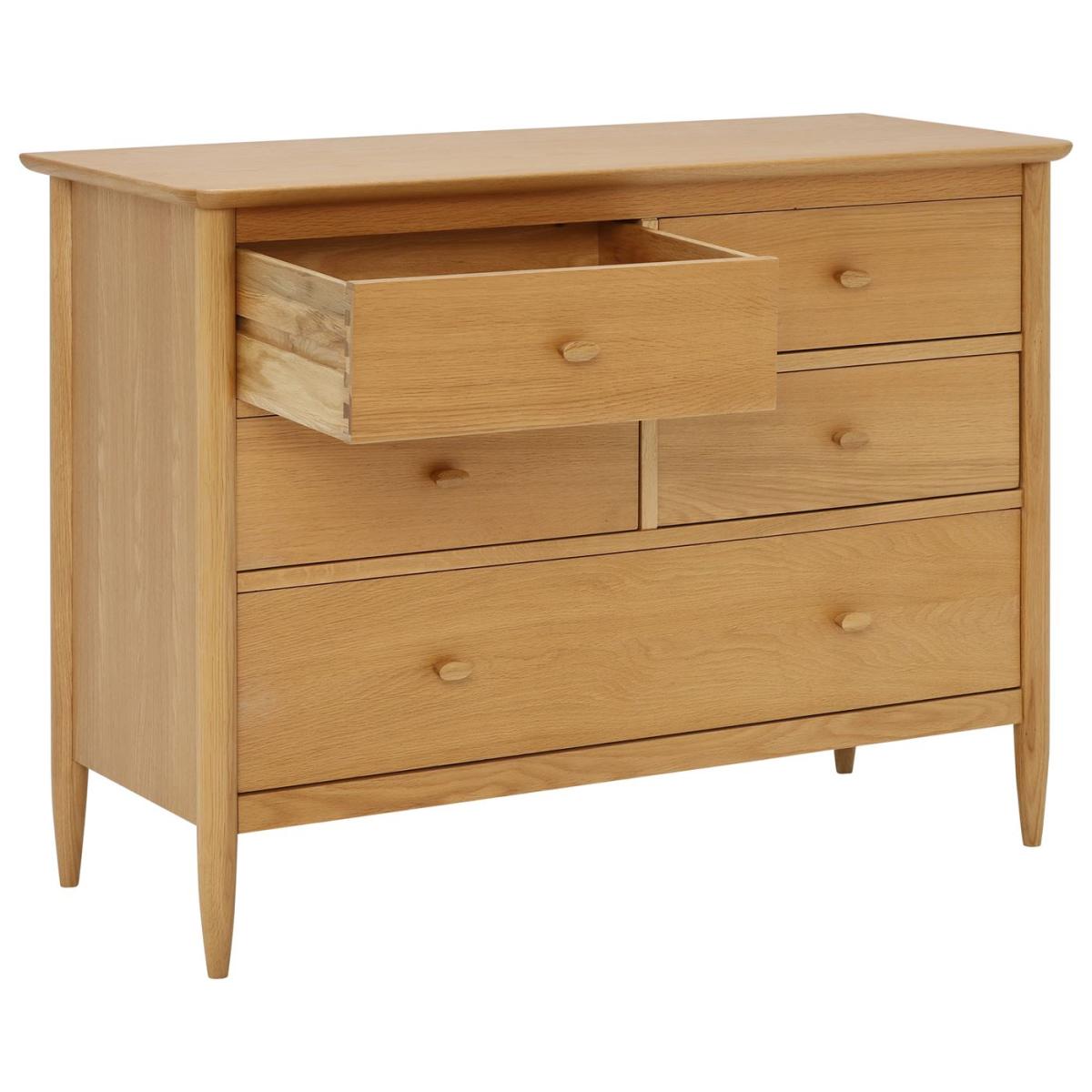 The timeless shaker style design of this five drawer chest of drawers can be easily incorporated into modern or more traditional decor. This chest of drawers provides plenty of useful storage with its five deep drawers. The double chamfered edge on the traditional oval handles creates a defined and modern profile and is wonderfully tactile. Tapered turned shapes in the legs and fluid curved corners on the top of the chest are characteristically Teramo and simply beautiful.