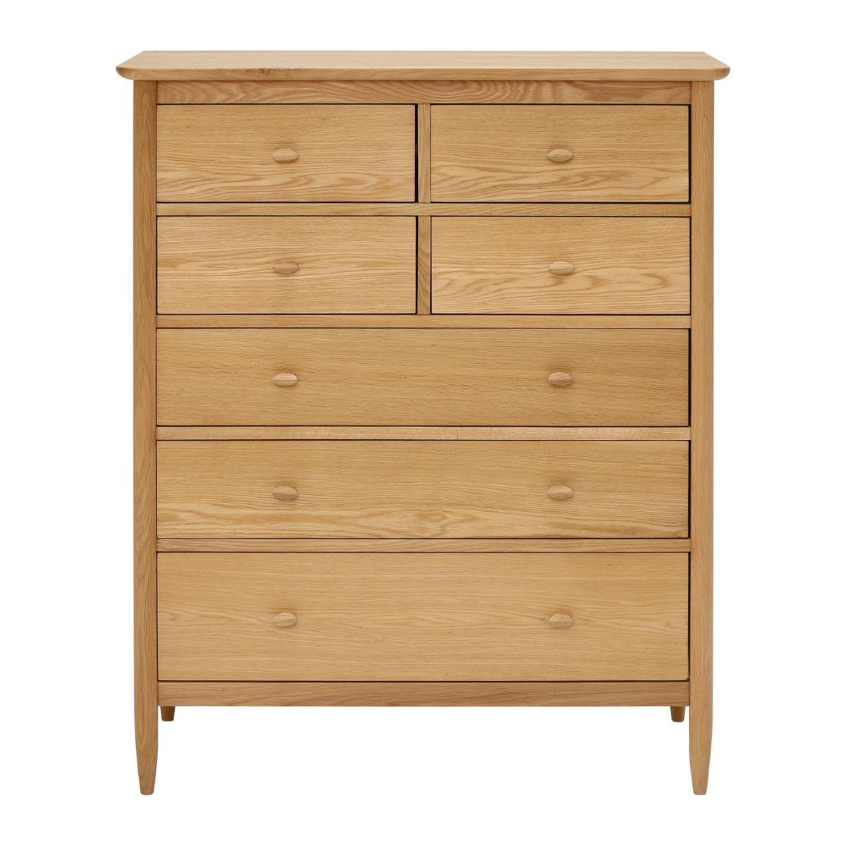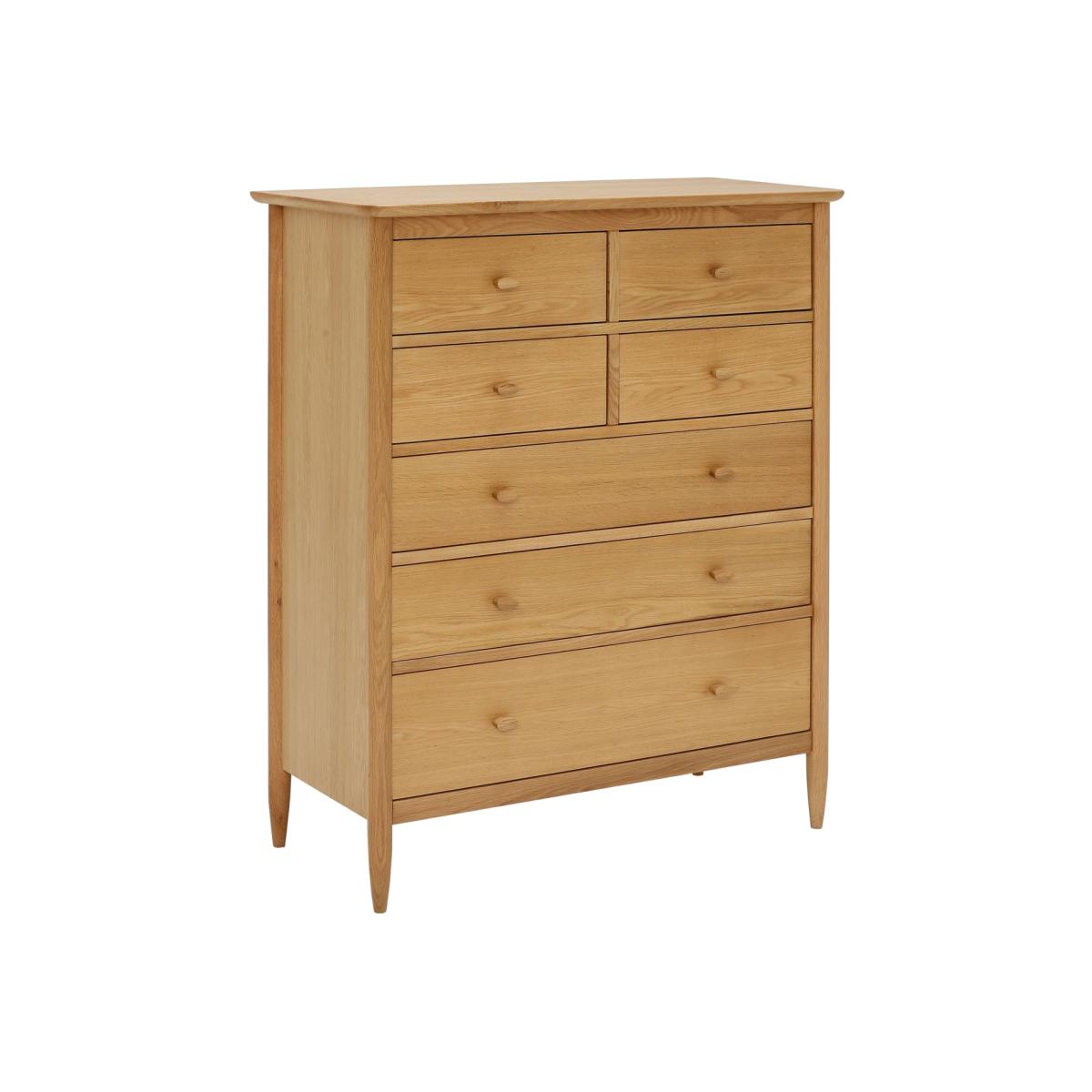 This seven drawer wide chest of drawers comprises the familiar tapered turned shapes in the legs and curved profiles on the top panel, as well as a shaker drawer layout, creating the simple signature feel. Offering three large storage drawers and four smaller storage drawers, this bedroom furniture provides ample space for storing folded clothes. The double chamfered edges on the traditional oval handles create a defined and modern profile and are wonderfully tactile.